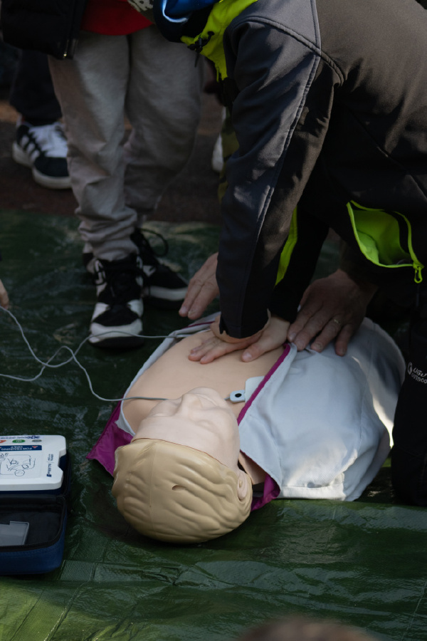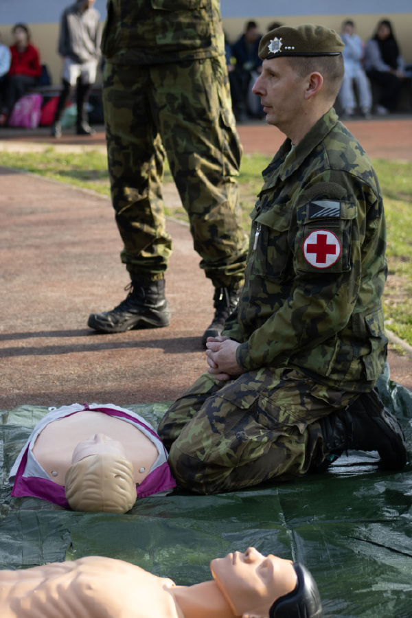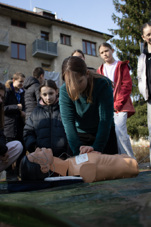 · První pomoc v terénu: Žáci se naučili, jak použít defibrilátor, resuscitaci zraněného a volání první pomoci.