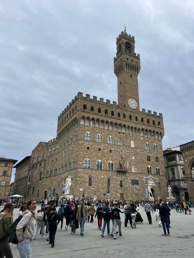 Naše procházka pokračovala na historické náměstí Piazza della Signoria, kde stojí Palazzo Vecchio, středověký palác, který sloužil jako sídlo florentské městské vlády a později také jako rezidence rodu Medicejů. Právě zde se odehrála řada významných událostí florentských dějin, včetně popravy (upálení) kazatele Girolamo Savonarola na konci 15. století.