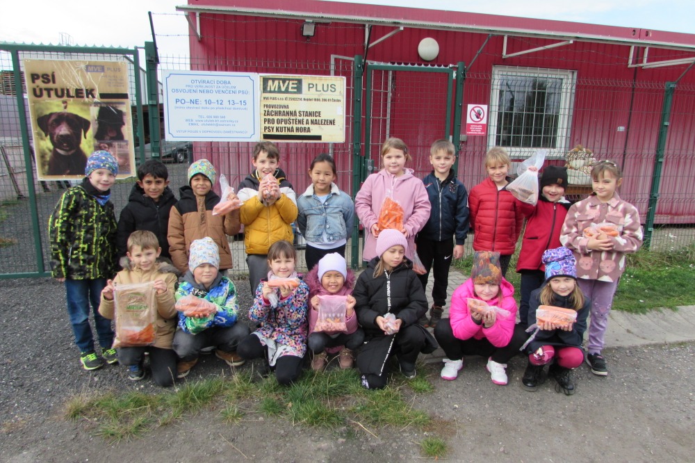 V úterý 14. 10. 2025 se děti z 1. oddělení školní družiny vydaly na výlet za zvířátky, a to do Záchytné stanice pro opuštěné a nalezené psy v Kutné Hoře. Přivítal je pan Jiří Staněk, který má na starosti ranč, ve kterém spokojeně žijí oslíci, kozy, ovečky a poníci. Děti jim donesly sladkou mrkvičku. Pan Mgr. Pavel Pallendal, vedoucí zařízení, provedl malé návštěvníky psím útulkem a seznámil je s několika pejsky a jejich těžkými životy. Po prohlídce útulku a ranče si děti ještě stihly pohrát na hřišti, které se nachází hned vedle útulku. Všem, kteří dětem pomohli připravit dárek pro zvířátka, moc děkujeme!