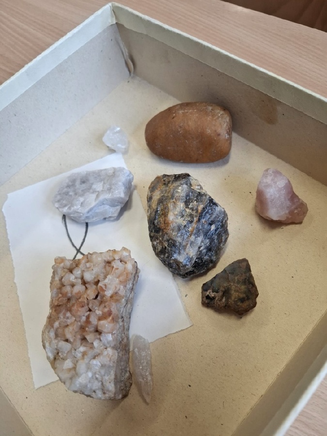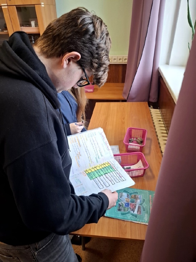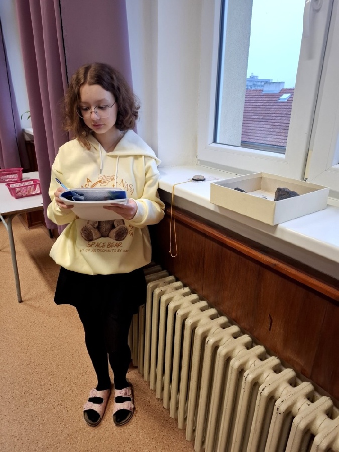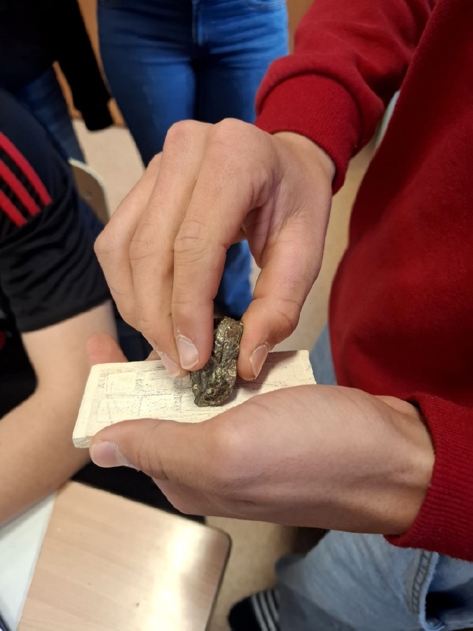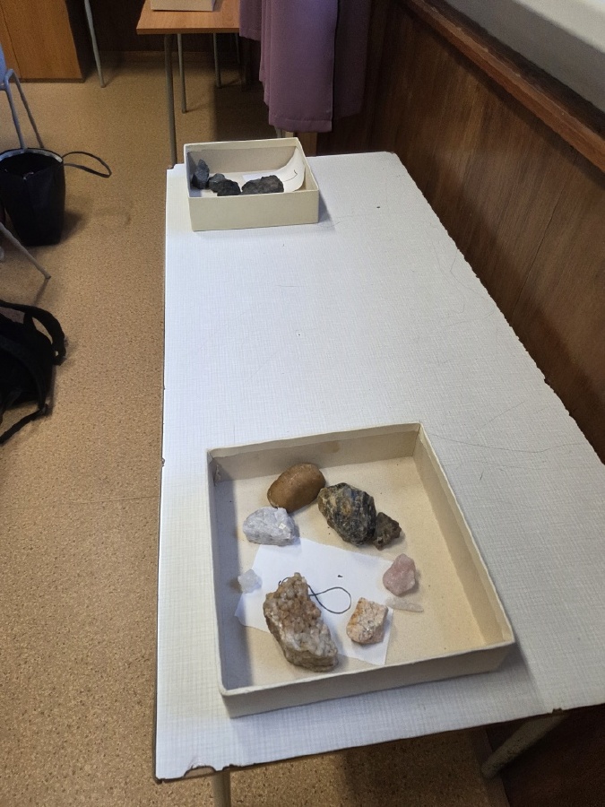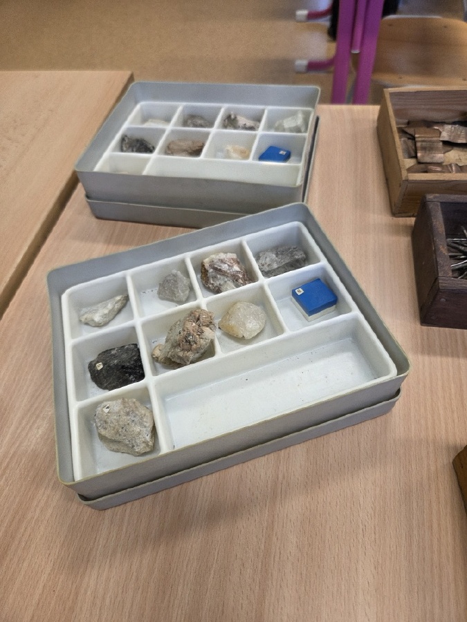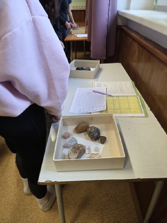 Během posledních dvou hodin přírodopisu se žáci devátých ročníků věnovali zkoumání fyzikálních i chemických vlastností nerostů. Využívali nejen znalosti geologie, která je náplní přírodopisu 9.ročníku, ale také si zopakovali některá témata z fyziky a chemie. Vyzkoušeli si prakticky určení optických vlastností nerostů a stanovení tvrdosti minerálu pomoci Mohsovy stupnice. V dalším zkoumání si vyzkoušeli také magnetismus látek. V chemické části se věnovali rozpustnosti minerálů ve vodě a v kyselině.