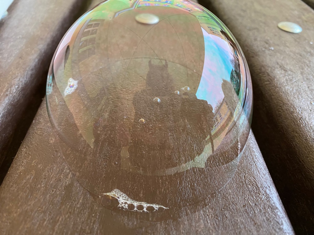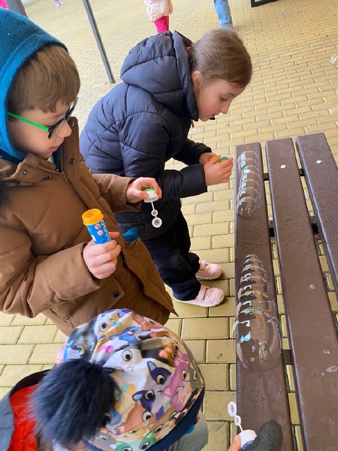 Následovala badatelská aktivita – místo původně plánovaných mrznoucích bublin jsme kvůli teplejšímu počasí tvořili co největší a nejdelší řady obyčejných bublin, což děti velmi zaujalo.