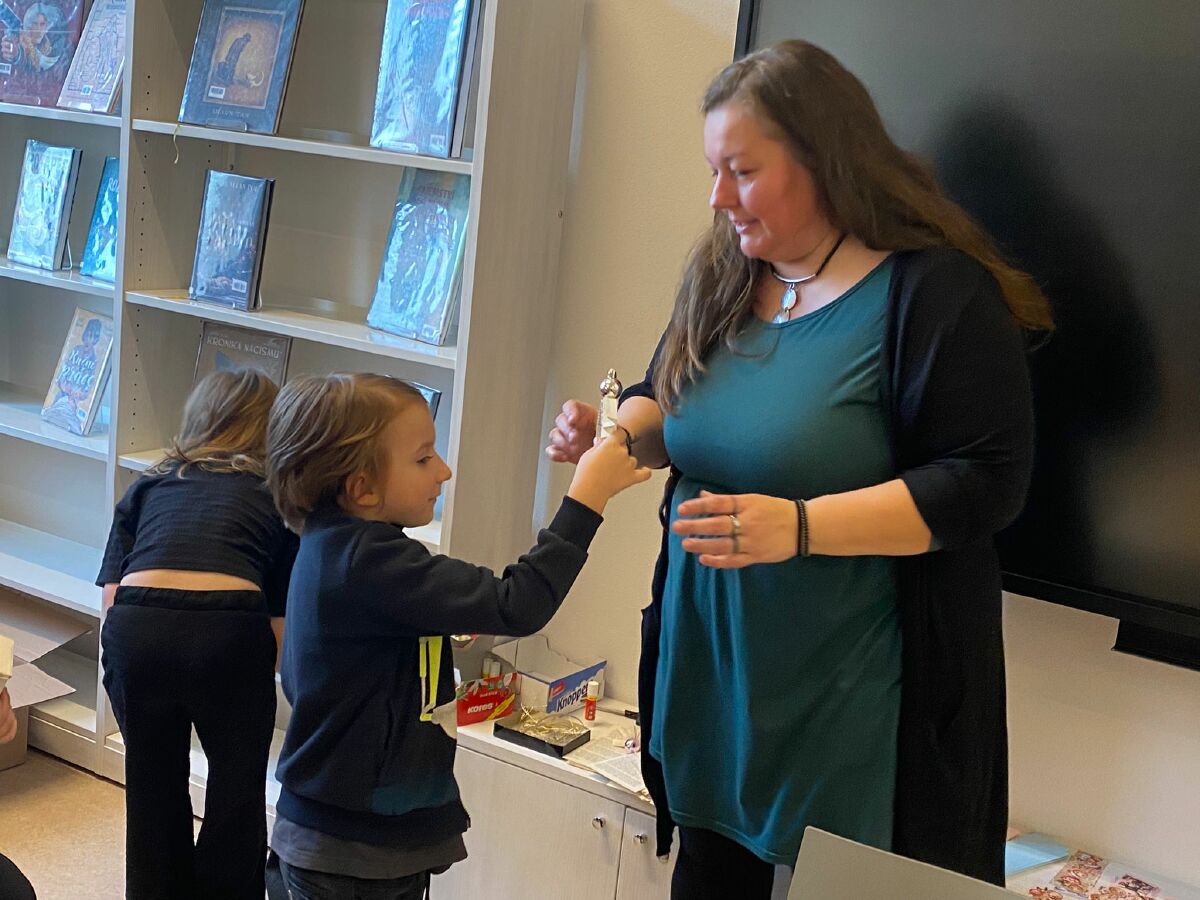 Po zajímavém povídání se všichni pustili do tvoření. Nejprve si vyrobili zimní záložku do knížky, která jim bude připomínat dnešní návštěvu při každém čtení. Poté pokračovali tvorbou ozdobičky na vánoční stromeček. Každý si odnesl originální a krásně vyzdobený výrobek, který jistě udělá radost doma i ve třídě.