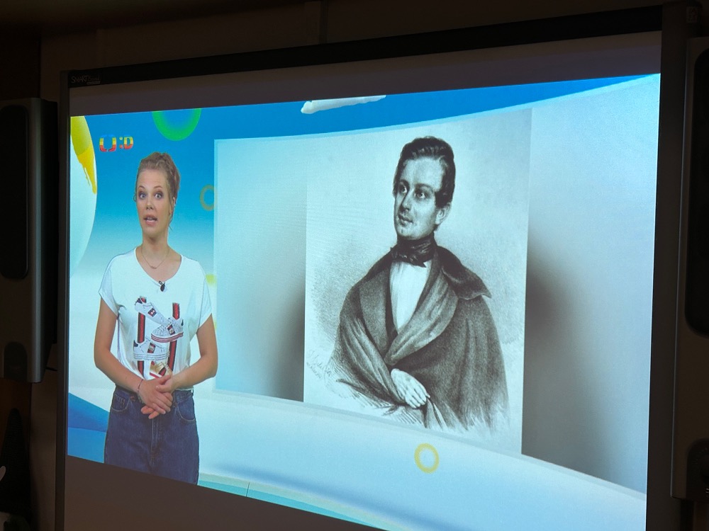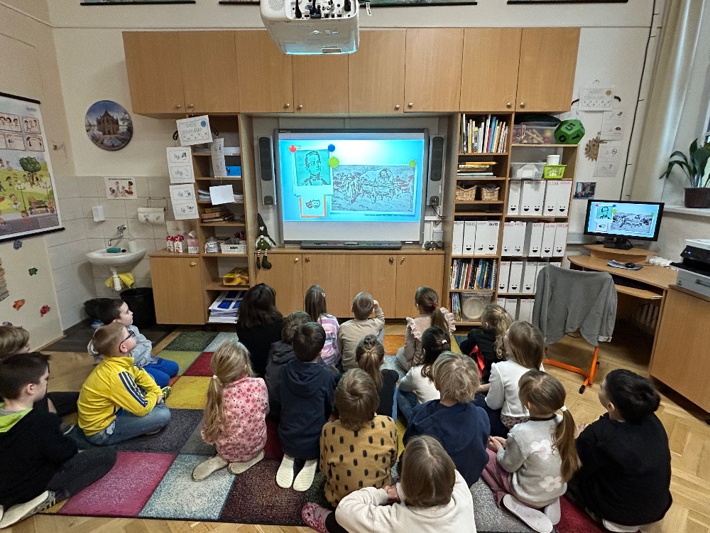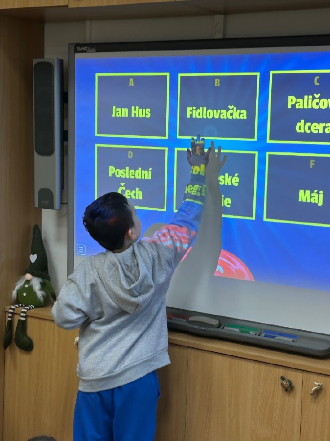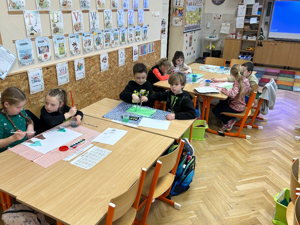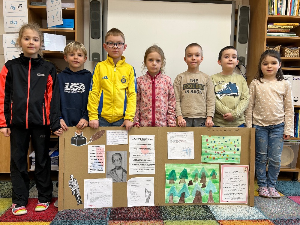 Žáci 2.B ve svém projektovém dni propojili hned několik témat. Přes pojmy vlast, domov jsme došli k naší státní hymně a odsud už to byl jen krůček k jejímu autorovi, Josefu Kajetánu Tylovi. Nejprve jsme přečetli knížku Příběh naší hymny. Tou nás provázel brouček jménem Týlek…. je zde krásně popsána a ilustrována krajina naší vlasti tak, aby vše pochopily malé děti. Týlek putuje českou krajinou a přemýšlí, kde je nejkrásnější místo k životu. Děti pak sestavily mapu naší republiky a ukázaly si na ní náš domov, naše město. V této souvislosti si připomněly, co je pro ně domov, kde se jim nejvíce líbí. Hudebně jsme si téma doprovodili snad nejkrásnější písní na světě, a to právě naší hymnou. Její slova nám pomohla výtvarně zpracovat část projektu. Od slov hymny to byl další krok k tomu, aby se žáci vydali po stopách samotného autora. Takže už ví, co původně znamená fidlovačka a jak to bylo se vznikem naší státní hymny. Zjistili, kde miláček národa žil, působil, jaká díla napsal. Také jsme řešili kvízy, vymýšleli obměny slov hymny. Třešničkou na dortu bylo malé překvapení v podobě návštěvy samotného autora. Samozřejmě herecky ztvárněného členem ochotnického spolku Tyl a zároveň kolegou T. Morawskim. Děkujeme mu tímto, že nás na chvilku vzal do 19. století. Výstupem z tohoto projektu bude velká kniha z kartonu, kde budou pohromadě veškeré aktivity.