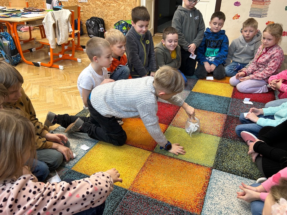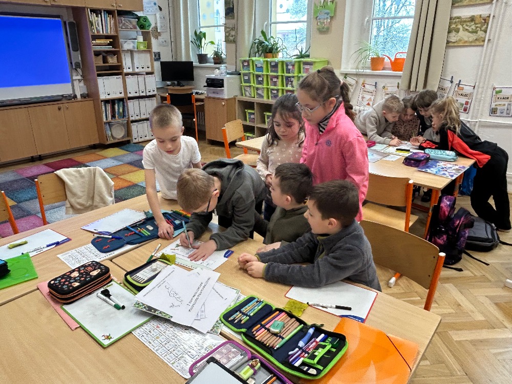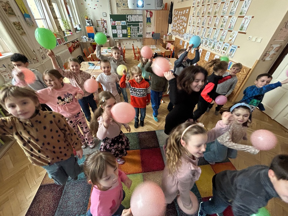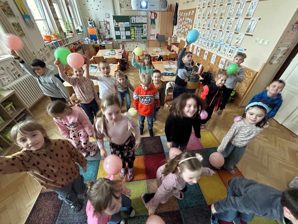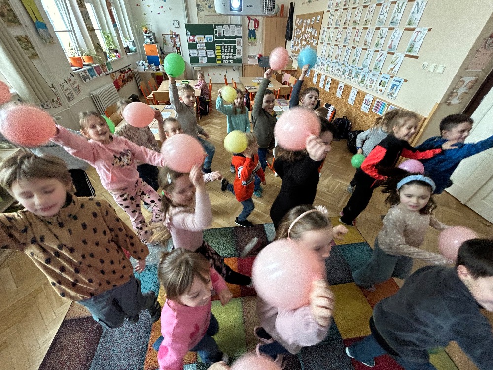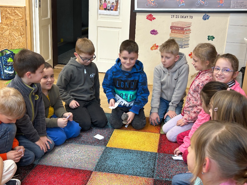 Děti si vyplnily sebehodnocení, napsaly vysvědčení i své třídní učitelce. Ve sklenici laskavosti jsme našli spoustu pozitivních vzkazů a hodnocení. Při jejich čtení nám pomohla myš Lenka (…myšlenka). Tyto hodiny jsme si samozřejmě osvěžili tancem a zpěvem. Také jsme si zahráli únikovou hru (děti pomáhaly Paní Zimě najít ztracený sníh, který jí ukradl obr z Krystalových hor). Celý den završilo předávání vysvědčení společně s osobním dopisem a drobných dárků. Protože bylo na co se těšit, bylo u nás ve třídě vysvětěšení.