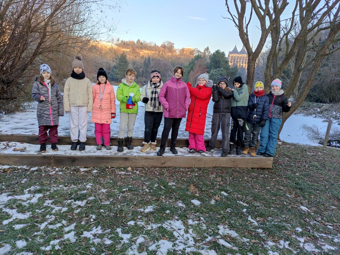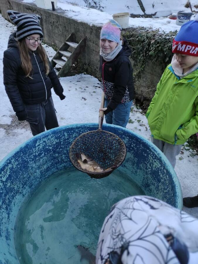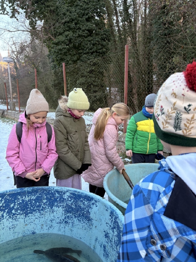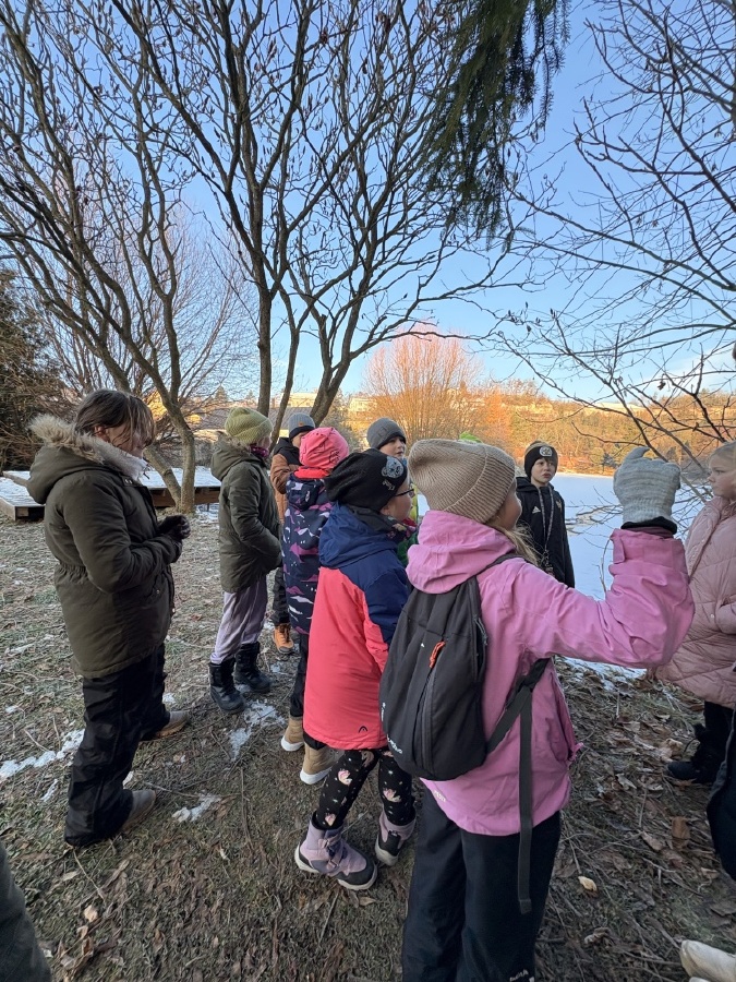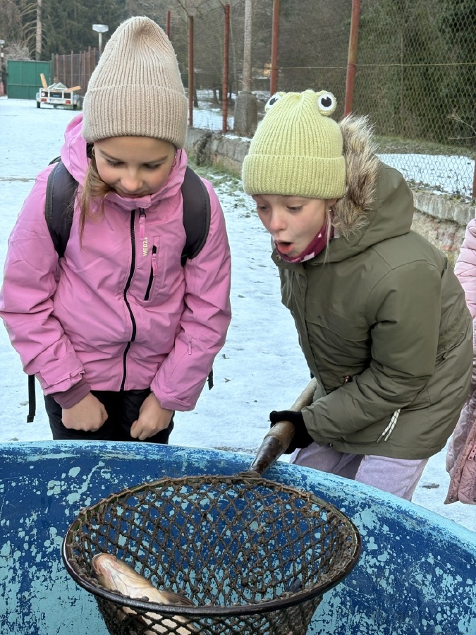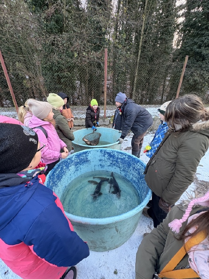 Čtvrťáci se nezalekli mrazivého počasí a s nadšením vyrazili na průzkum života rybníku v rodinném rybářství Haering.
