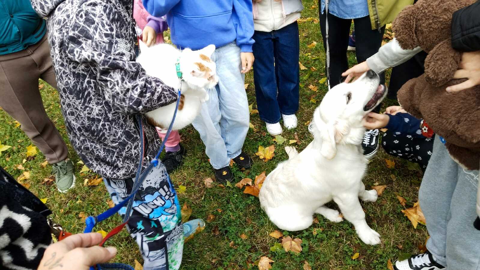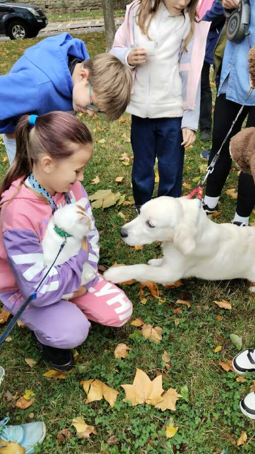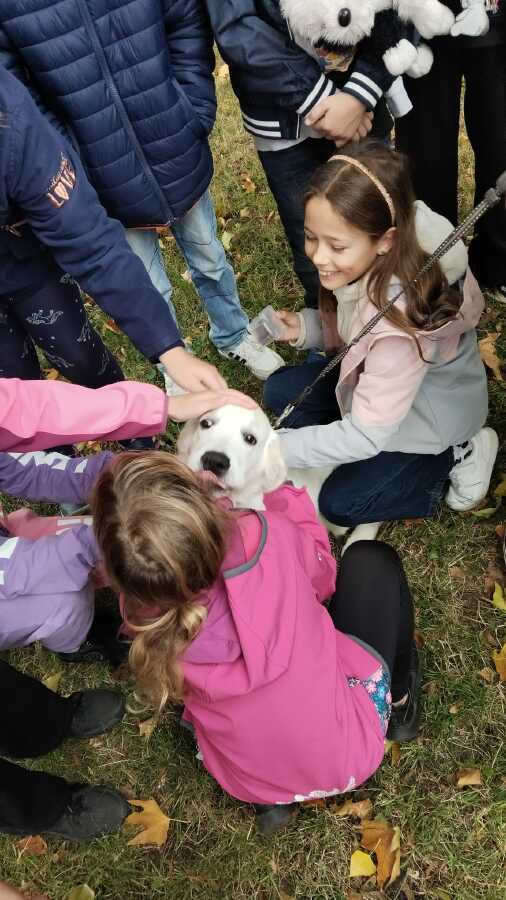 Na závěr projektového dne jsme některé mazlíčky vyvenčili a v parku pomazlili Emičky štěňátko zlatého retrívra Auru.