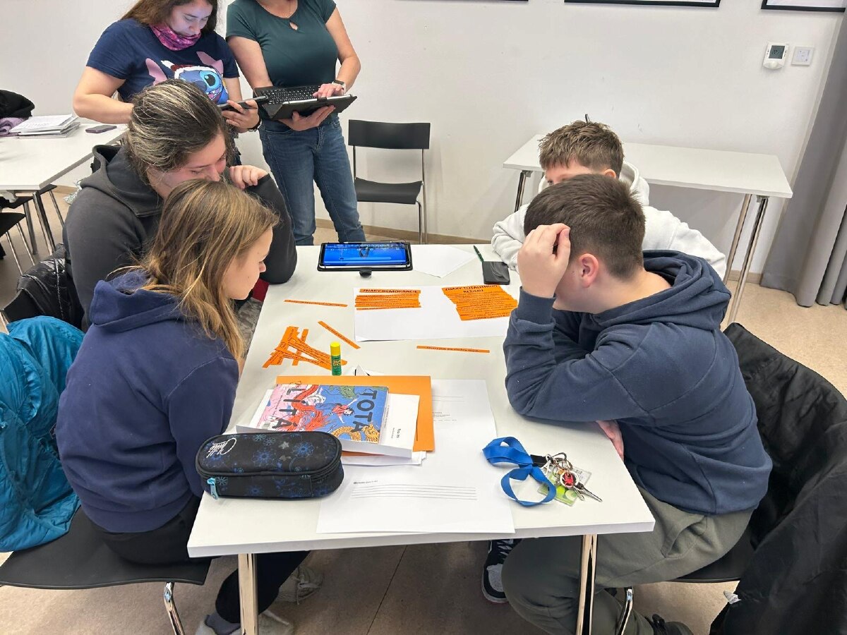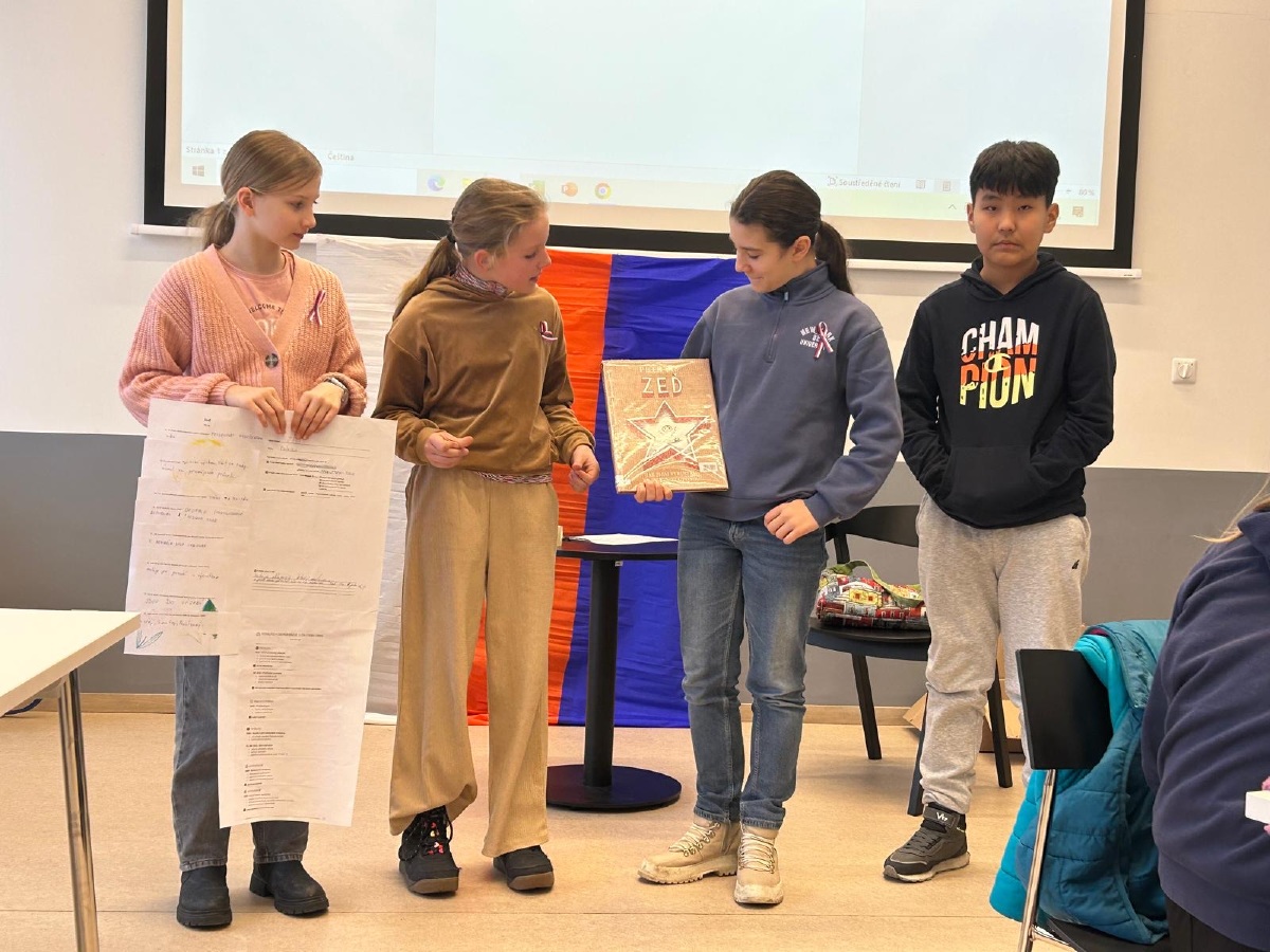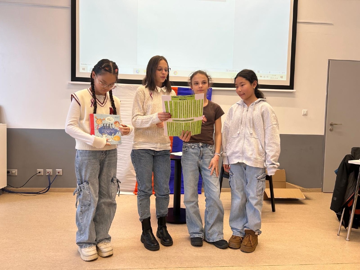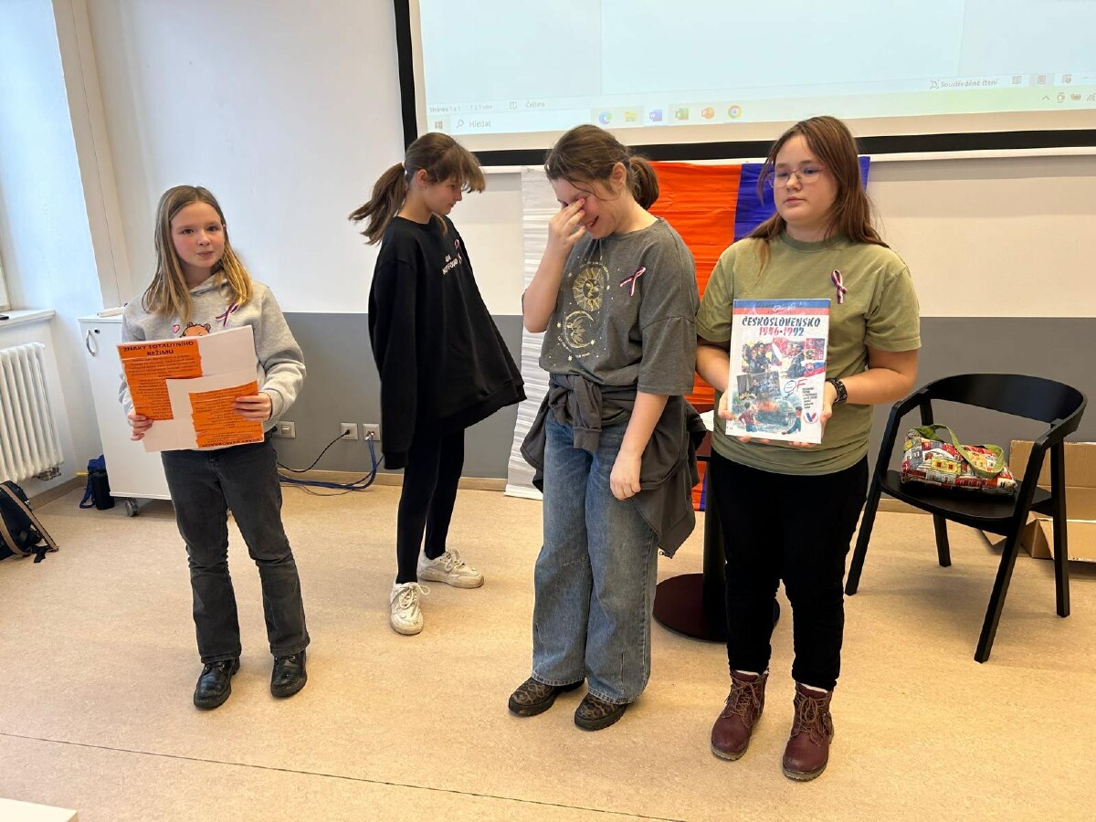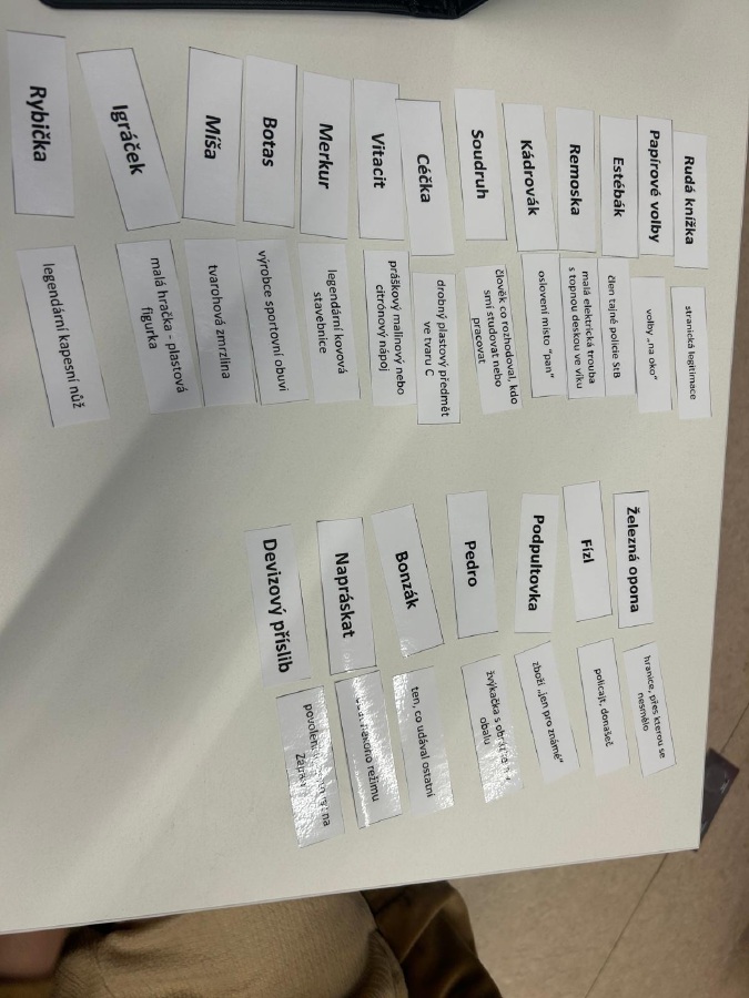 Následovala skupinová práce s knihami, tvorba plakátů a plnění dalších úkolů – třídění znaků totality a demokracie, kvízy, doplňovačky, pracovní listy či vysvětlování pojmů z dané doby (např. estébák, disident, Pedro, remoska). Součástí dne byly prezentace, společná reflexe i prostor pro vlastní názory a myšlenky.