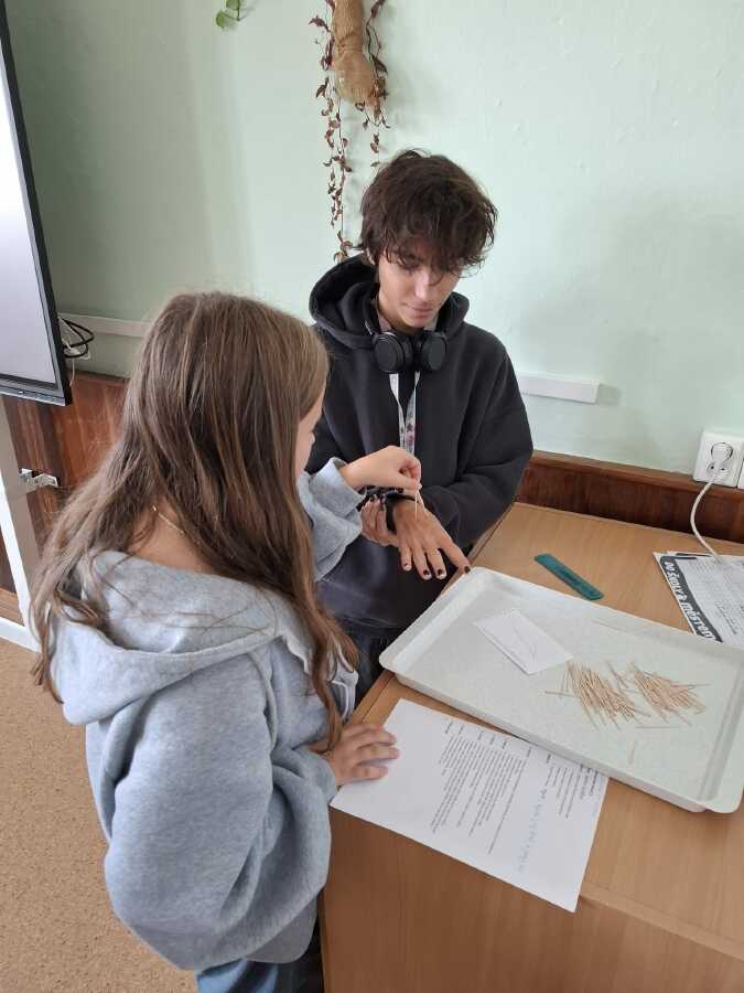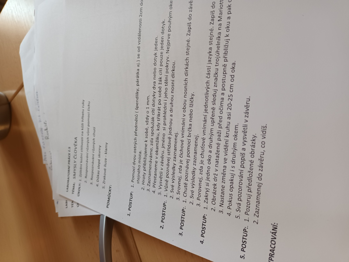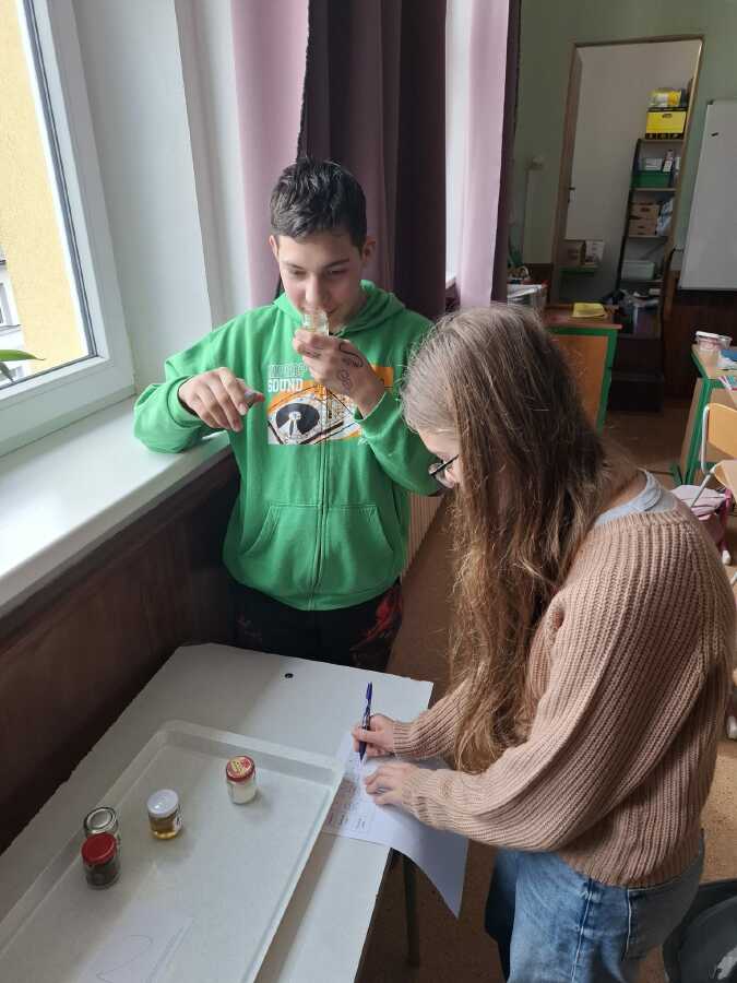 Při laboratorní práci z přírodopisu se žáci devátých tříd zaměřili na lidské smysly. Během své práce zjišťovali, jak dobře jejich smyslové orgány fungují, ale i jak mohou někdy klamat. Žáci pracovali ve dvojicích, aby mohli vzájemně porovnat své výsledky vnímání. Nejpodrobněji se věnovali svému zraku, ale nejvíce zážitků si odnesli z ověřování svých čichových a chuťových buněk.