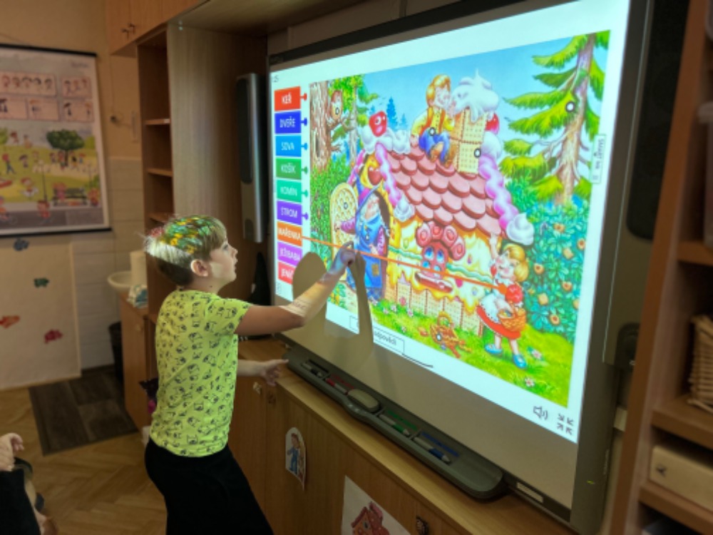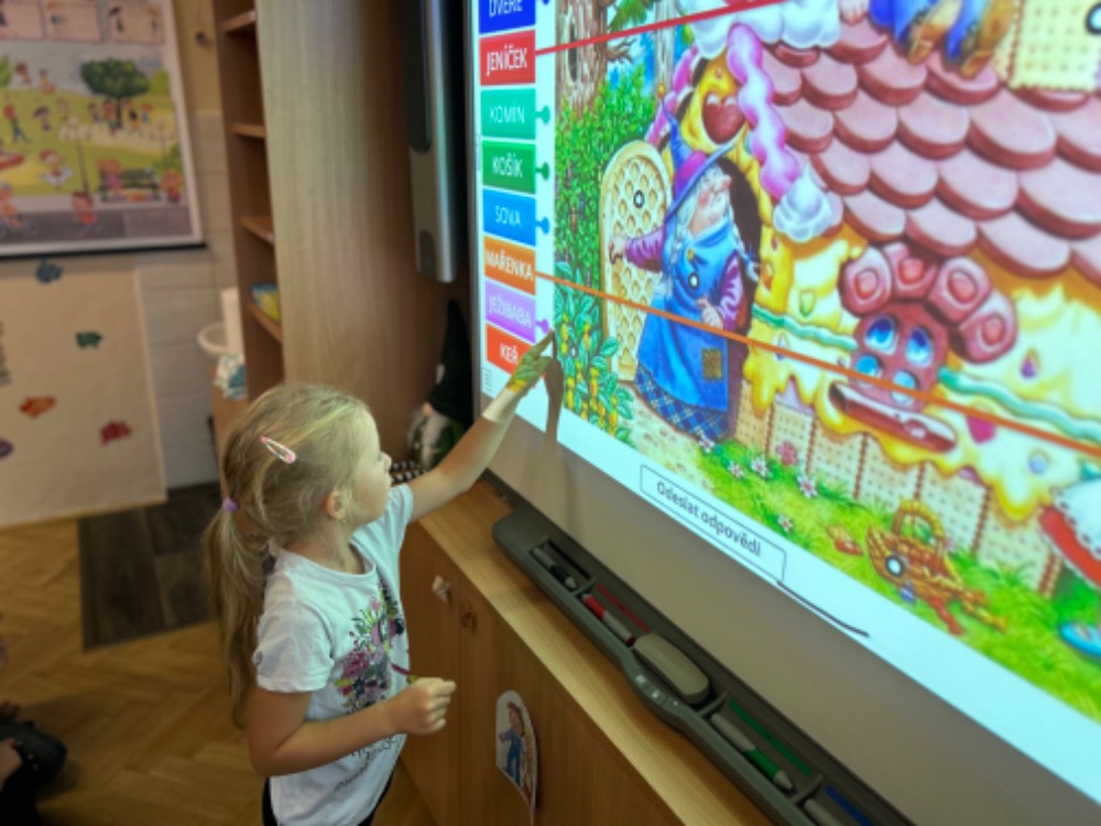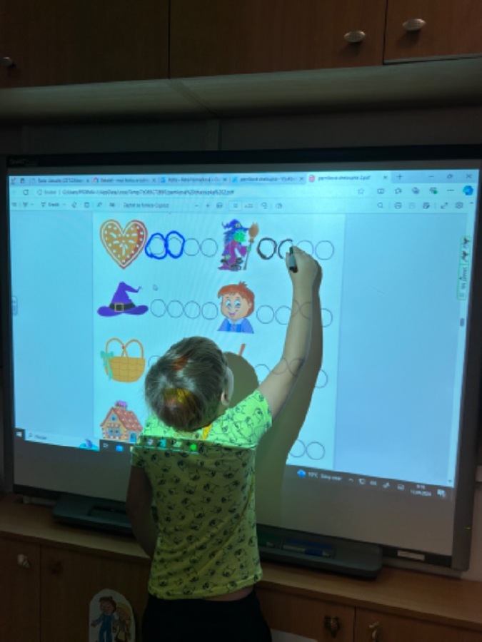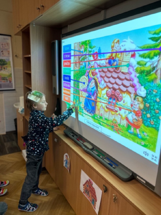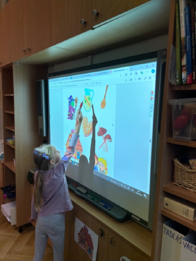 Dnes jsme si připomněli pohádku Perníková chaloupka. Společně jsme si ji převyprávěli za pomoci obrázkové osnovy. Pak už na nás čekaly jednotlivé úkoly. Děti pomáhaly najít cestu Jeníčkovi a Mařence od ježibaby zpět domů, určovaly velikost záporné pohádkové postavy, zároveň si procvičily orientaci, počítaly jednotlivé perníčky, vytleskávaly slova a označovaly počet jejich slabik, doplňovaly neúplné obrázky, vyznačovaly motivy patřící k dnešnímu tématu, to vše u interaktivní tabule. V lavici pak v pracovním listě děti bystřily svůj postřeh a zrakové vnímání, také si procvičovaly grafomotoriku. Také jsme se naučili hru Já mám, kdo má?. Ta se nám moc líbila a pro úspěch jsme ji hráli 2x. V závěru jsme si ještě v aplikaci Wordwall upevnili základní pojmy z pohádky.