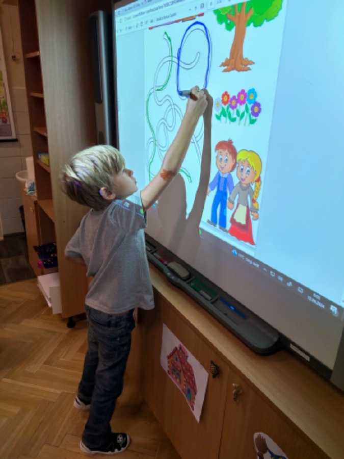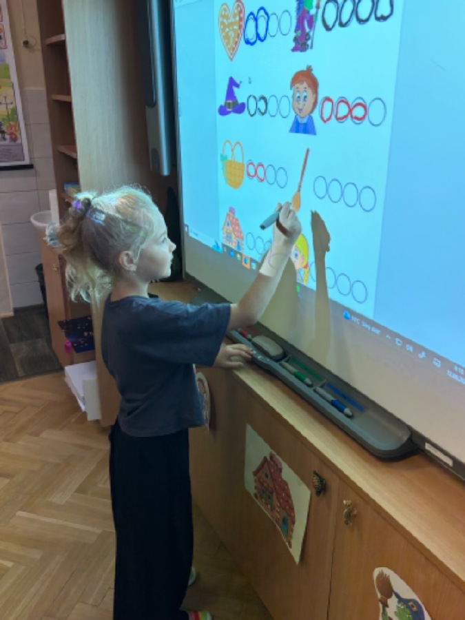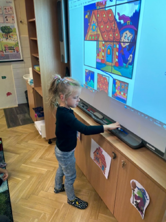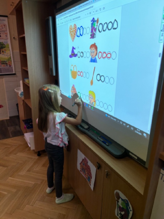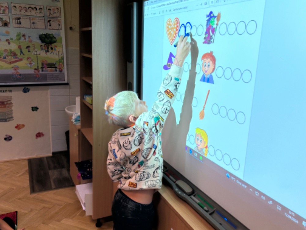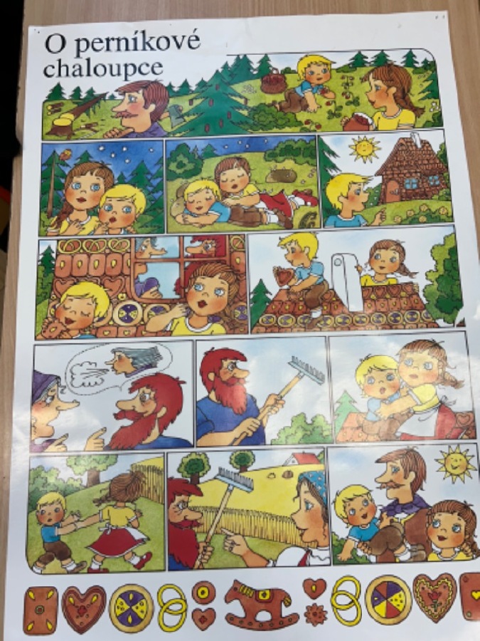 Dnes jsme si připomněli pohádku Perníková chaloupka. Společně jsme si ji převyprávěli za pomoci obrázkové osnovy. Pak už na nás čekaly jednotlivé úkoly. Děti pomáhaly najít cestu Jeníčkovi a Mařence od ježibaby zpět domů, určovaly velikost záporné pohádkové postavy, zároveň si procvičily orientaci, počítaly jednotlivé perníčky, vytleskávaly slova a označovaly počet jejich slabik, doplňovaly neúplné obrázky, vyznačovaly motivy patřící k dnešnímu tématu, to vše u interaktivní tabule. V lavici pak v pracovním listě děti bystřily svůj postřeh a zrakové vnímání, také si procvičovaly grafomotoriku. Také jsme se naučili hru Já mám, kdo má?. Ta se nám moc líbila a pro úspěch jsme ji hráli 2x. V závěru jsme si ještě v aplikaci Wordwall upevnili základní pojmy z pohádky.