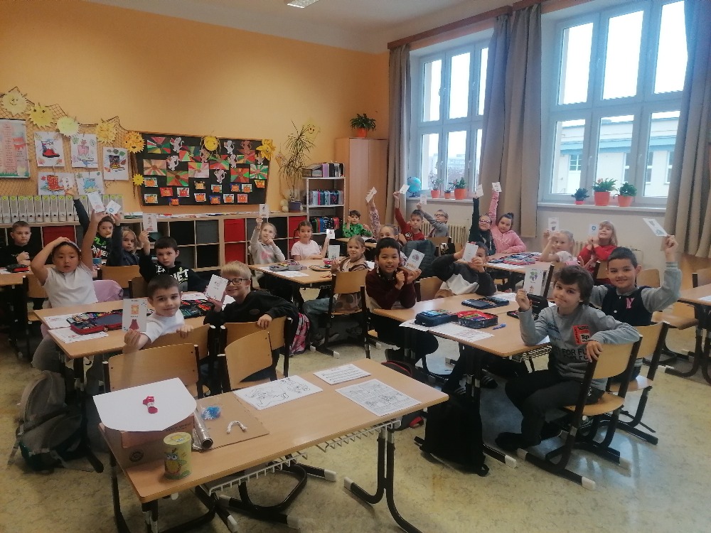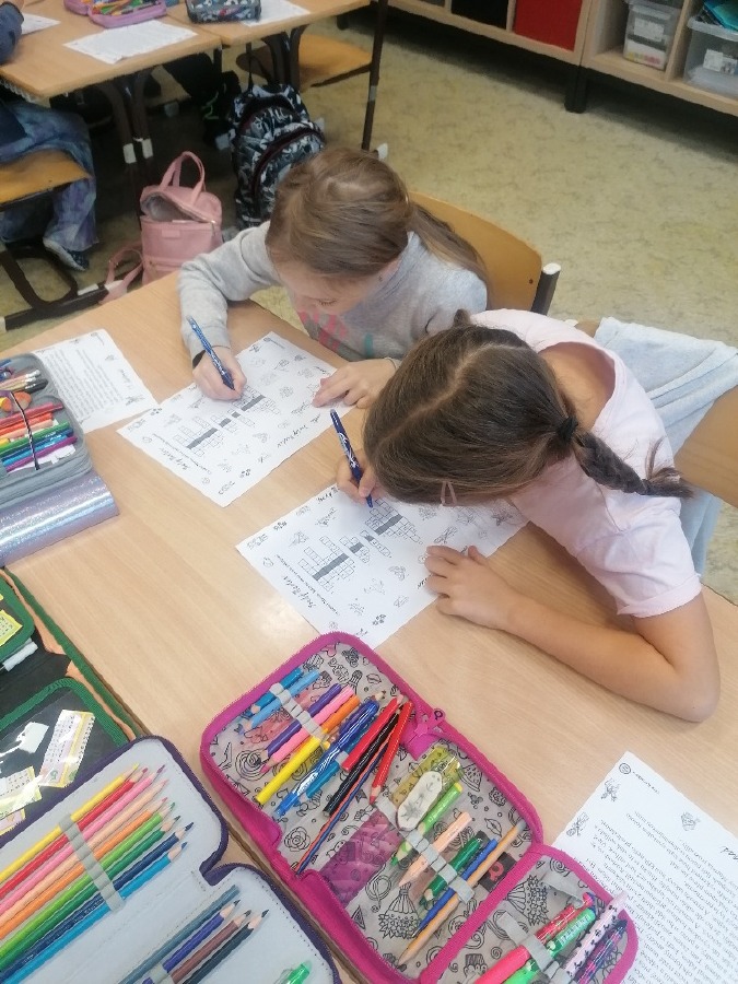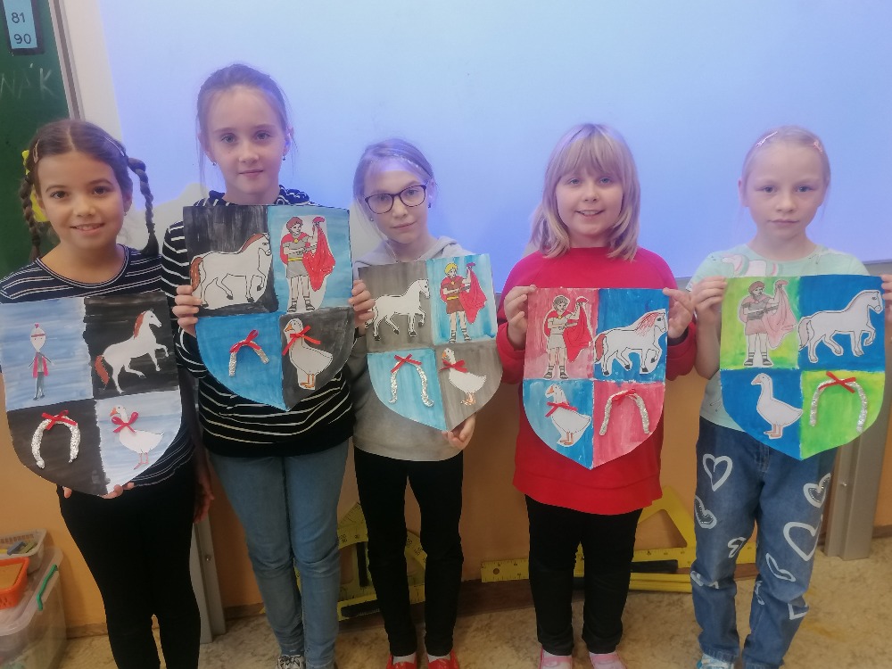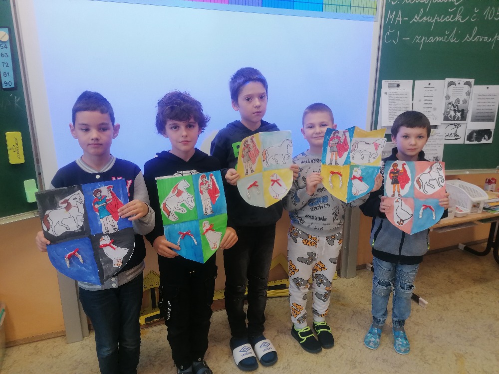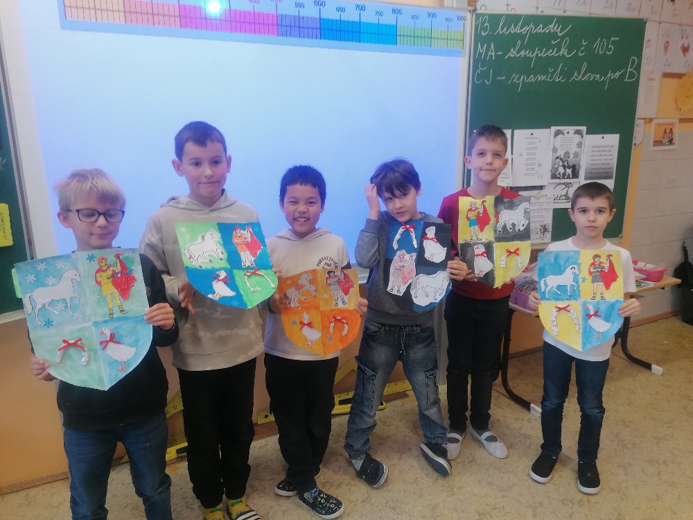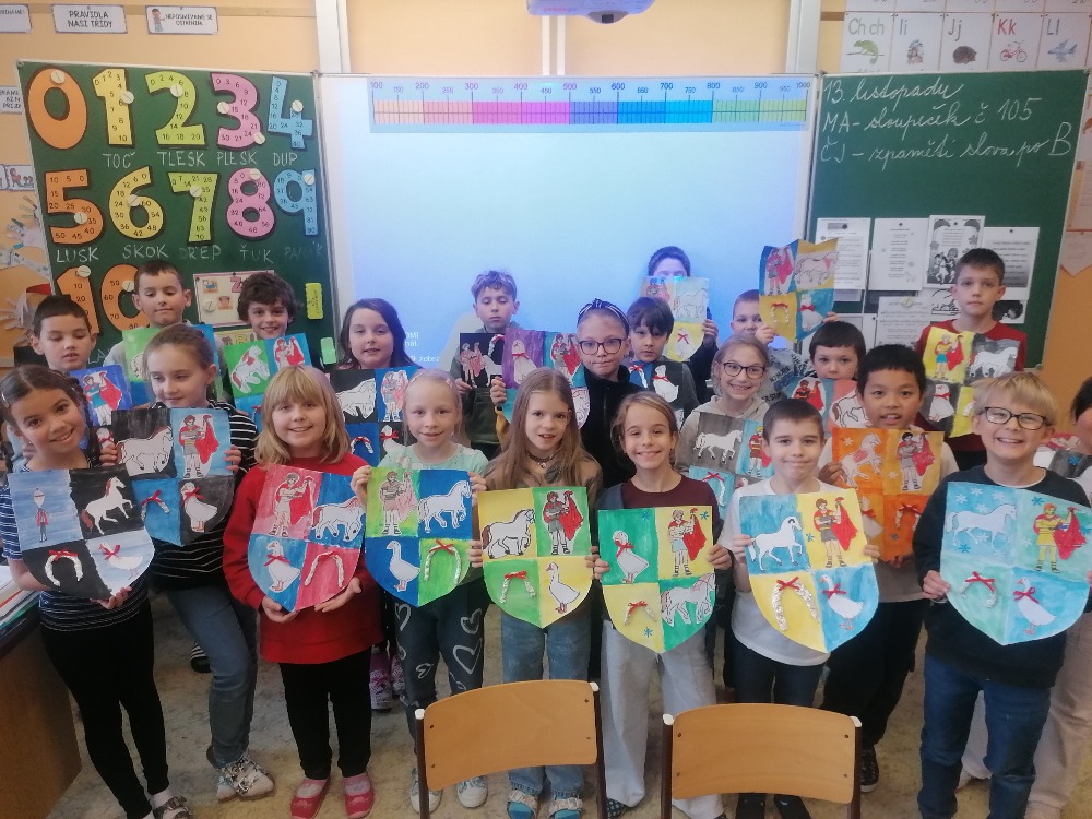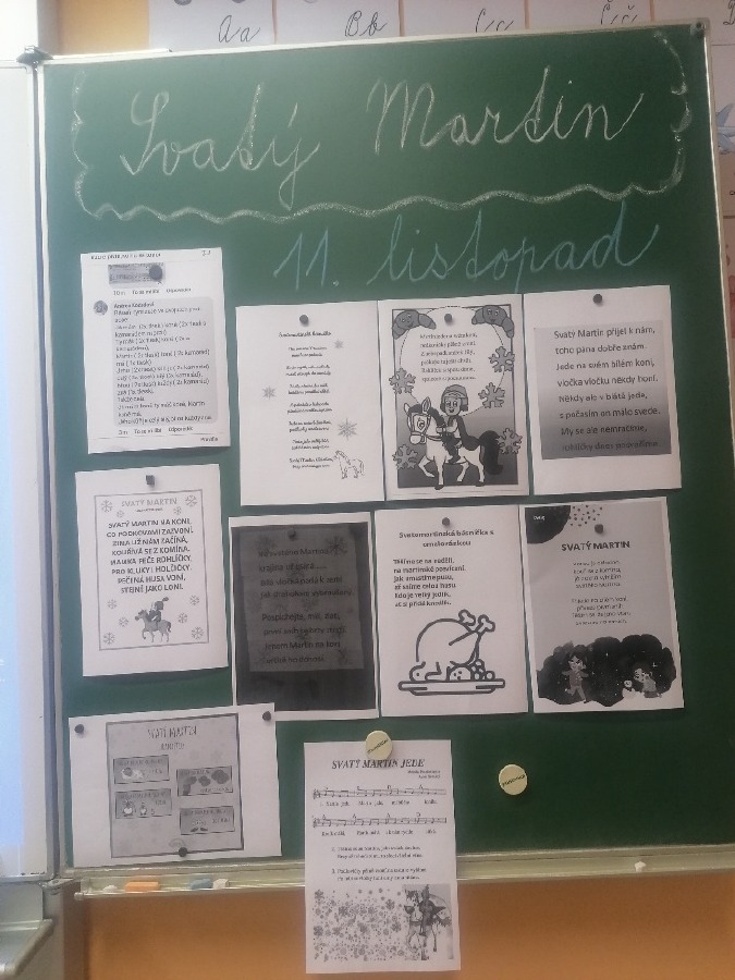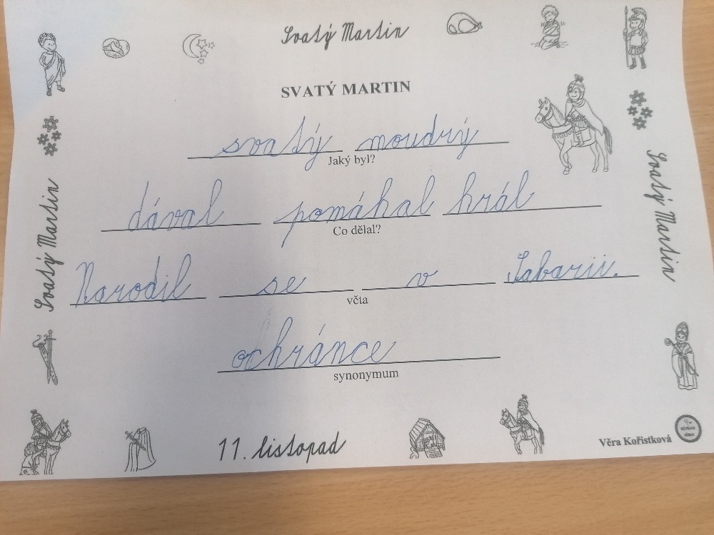 V pondělí 11. listopadu si žáci 3. C užili projektový den se sv. Martinem. Celé dopoledne poznávali zábavnou formou jeho příběh. Úvodem si přečetli text, sestavili ve skupinách komiksový příběh, přiřazovali obrázky k textu, vyluštili křížovku, dokreslovali obrázek podle zadání, doplnili pětilístek. Nechyběla recitace, zpívání a hra Já mám, kdo má. Závěrem žáci vytvořili erby se svatomartinskými symboly. Podzimní čas nám tak přinesl nejen padající listí a první mrazíky, ale i příběh o muži, který se proslavil svou dobrotou.