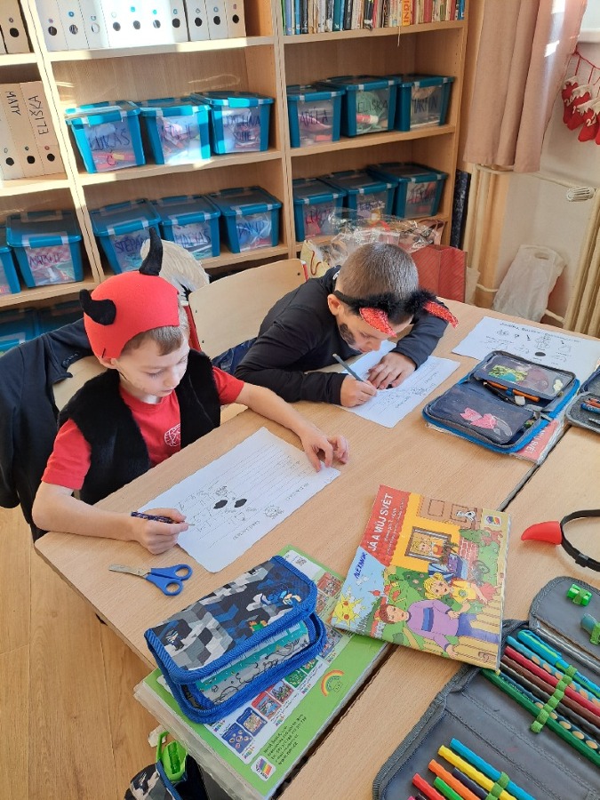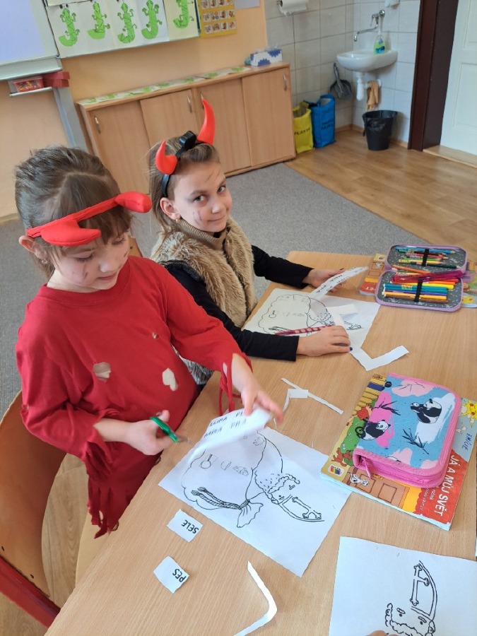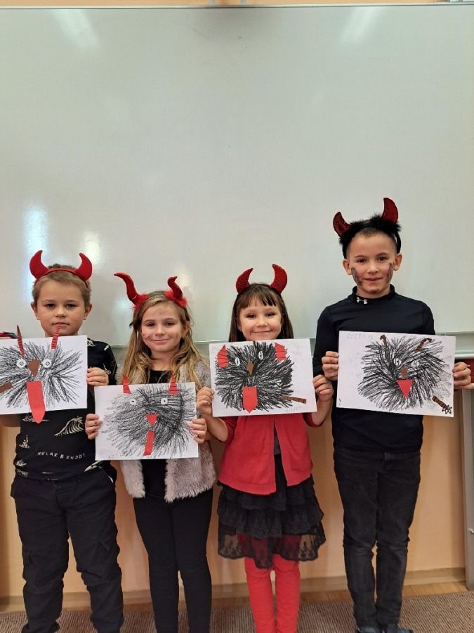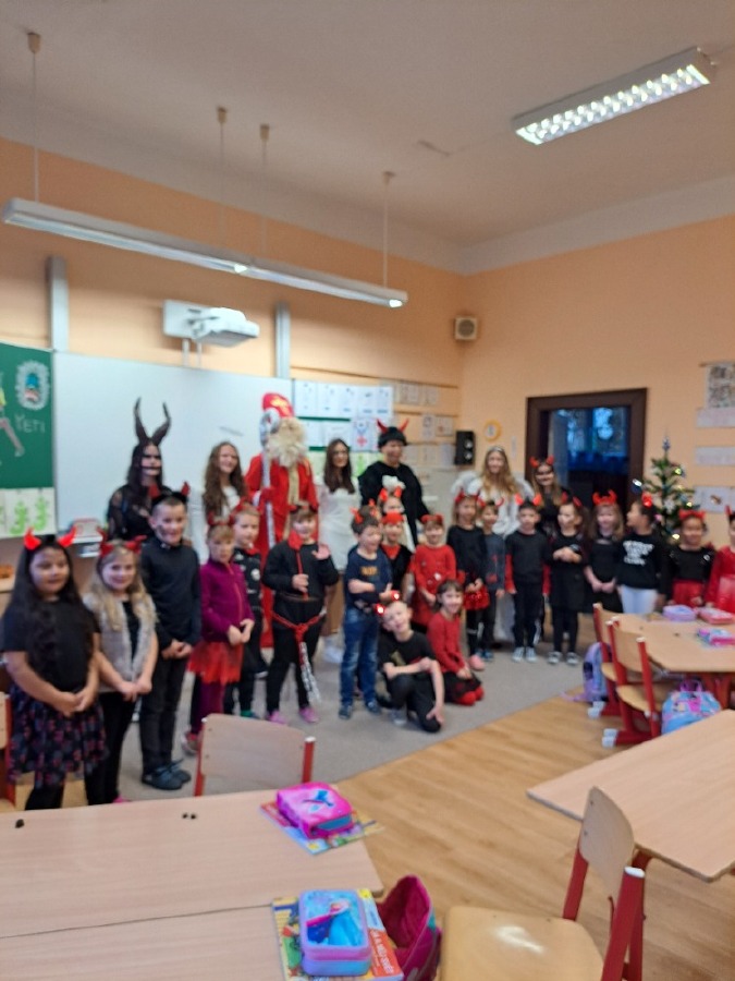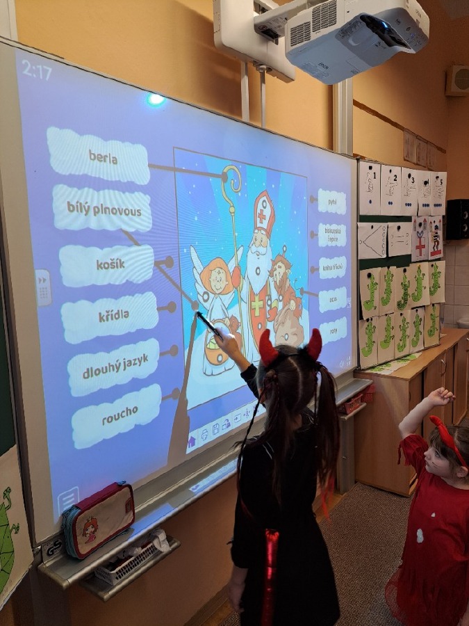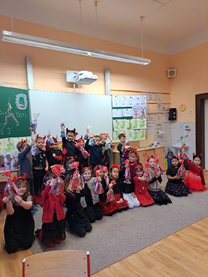 Ve čtvrtek 5.12. nejdříve navštívil naši třídu svatý Mikuláš se svou družinou a všem hodným prvňáčkům rozdal bohatou nadílku. Potom se všichni žáci proměnili v malé čertíky, které čertice Belzebína pozvala do čertovské školy. Čertíci plnili různé čertovské úkoly, hráli čertí hry, zpívali, tančili, pracovali na interaktivní tabuli, sledovali Mikulášskou pohádku a nakreslili čertovský portrét. Celé dopoledne pracovali ve skupinkách, učili se spolupracovat a pomáhat si. Byl to po čertech zábavný den.