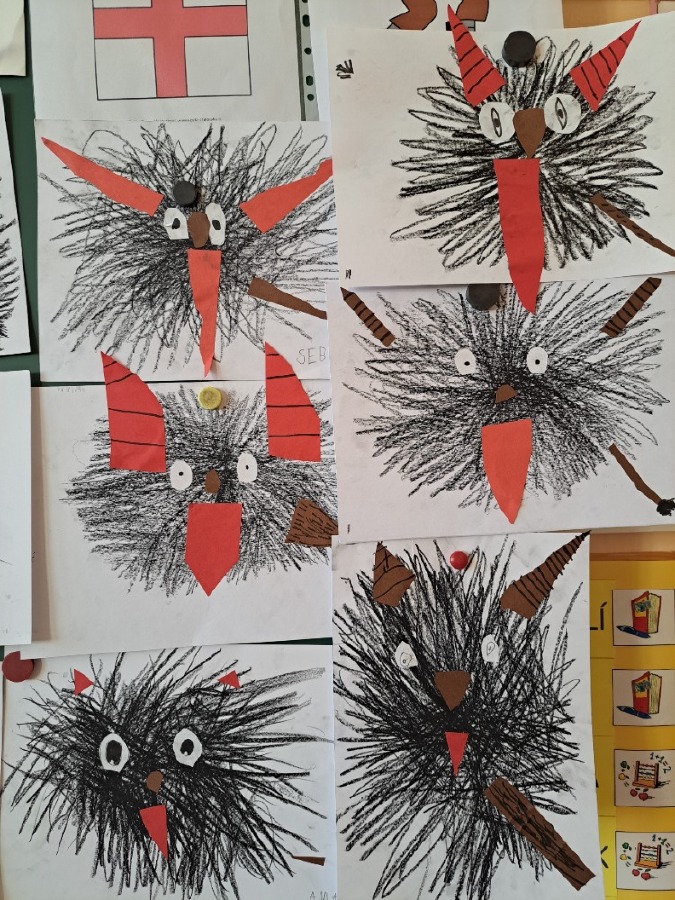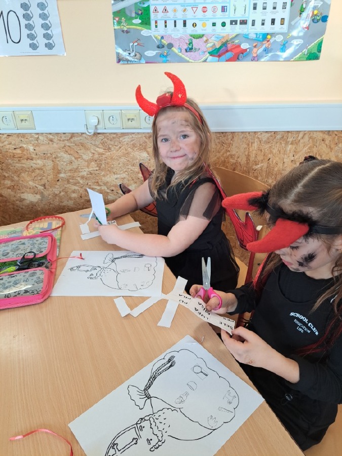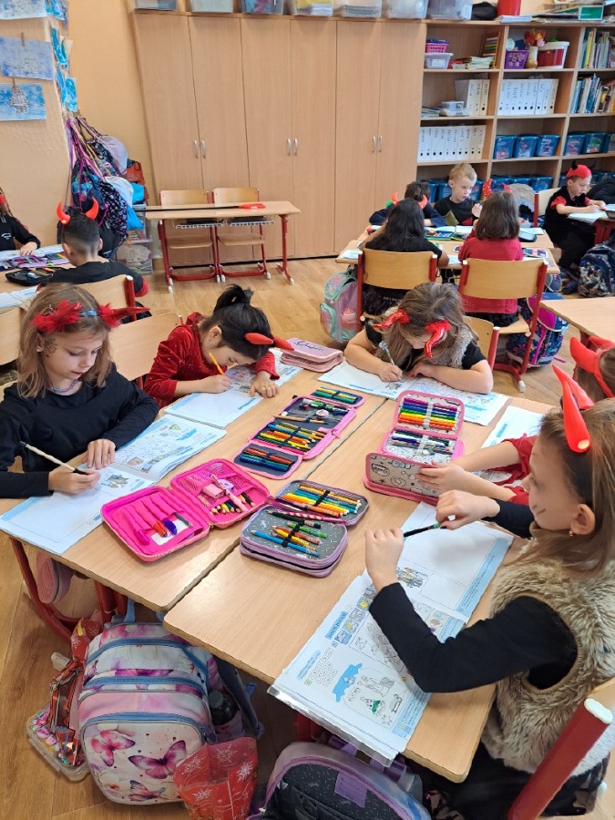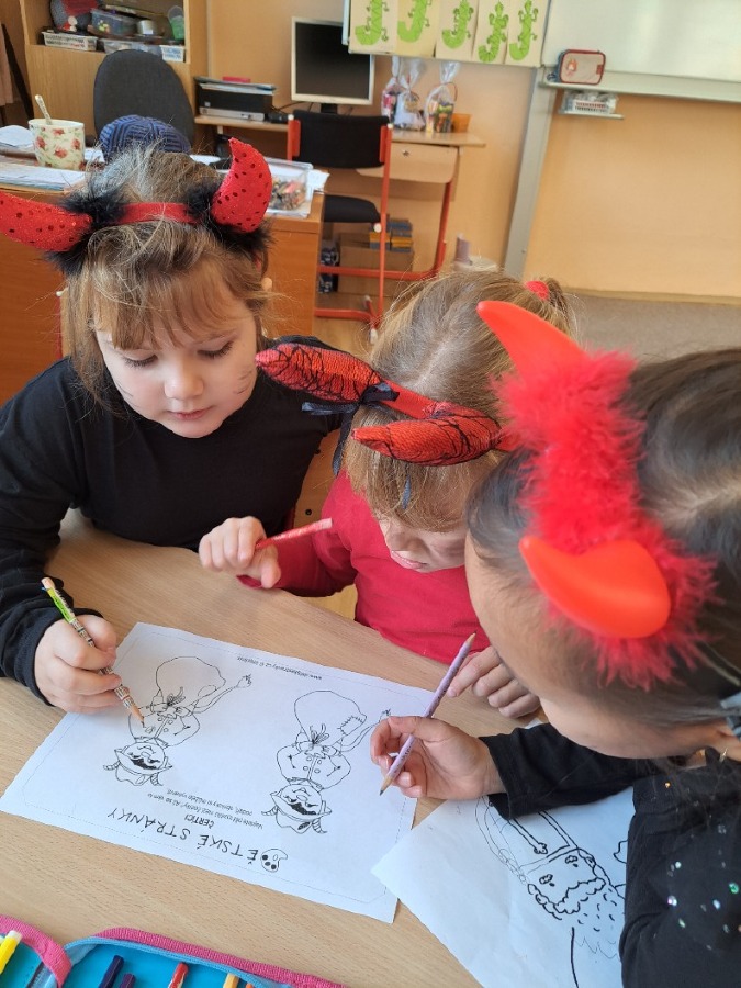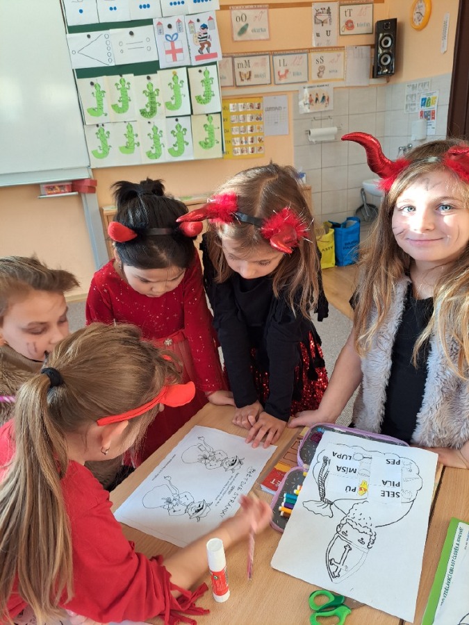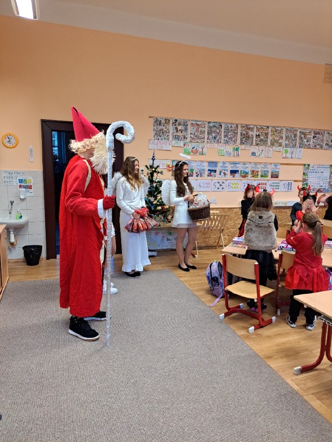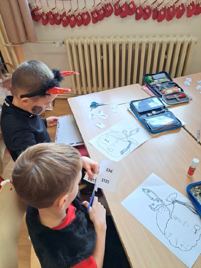 Ve čtvrtek 5.12. nejdříve navštívil naši třídu svatý Mikuláš se svou družinou a všem hodným prvňáčkům rozdal bohatou nadílku. Potom se všichni žáci proměnili v malé čertíky, které čertice Belzebína pozvala do čertovské školy. Čertíci plnili různé čertovské úkoly, hráli čertí hry, zpívali, tančili, pracovali na interaktivní tabuli, sledovali Mikulášskou pohádku a nakreslili čertovský portrét. Celé dopoledne pracovali ve skupinkách, učili se spolupracovat a pomáhat si. Byl to po čertech zábavný den.