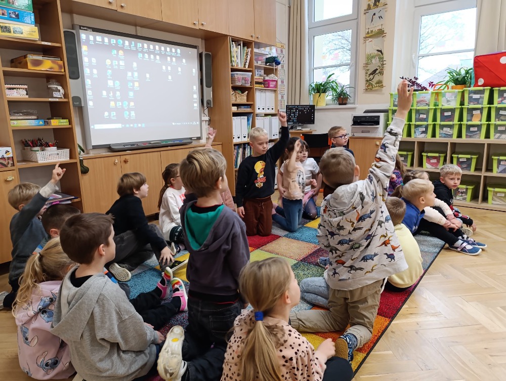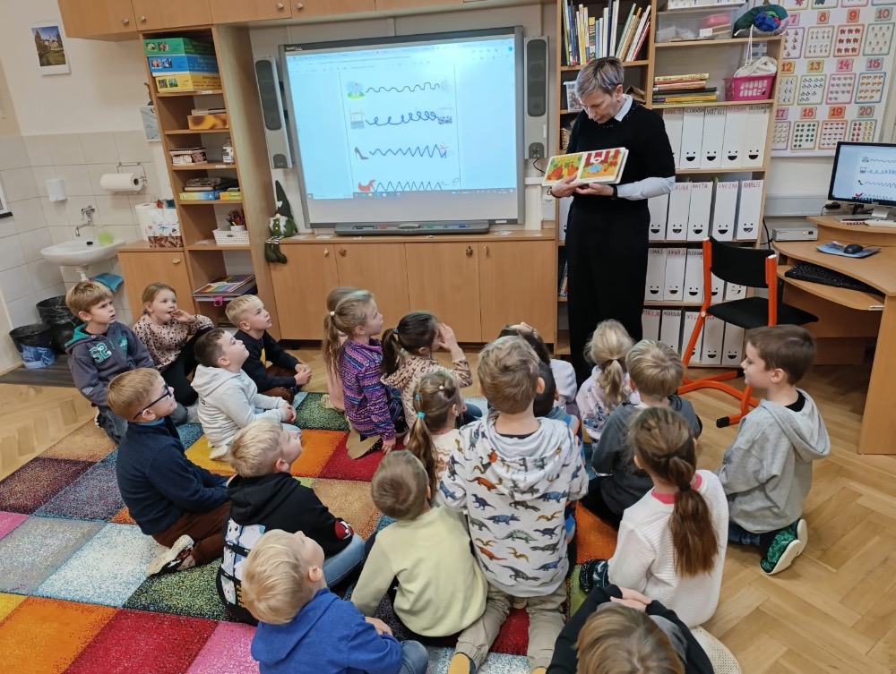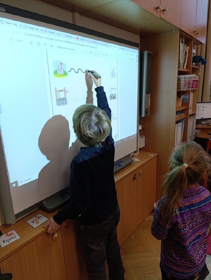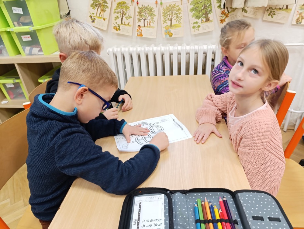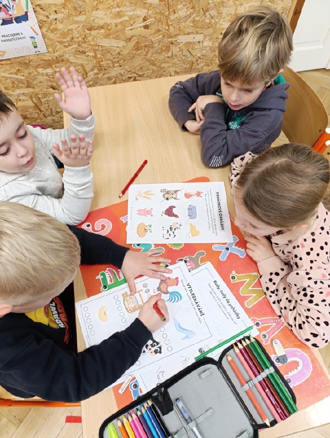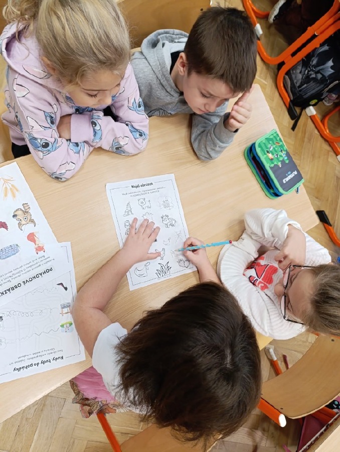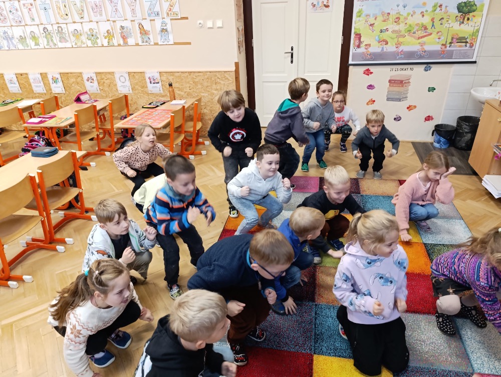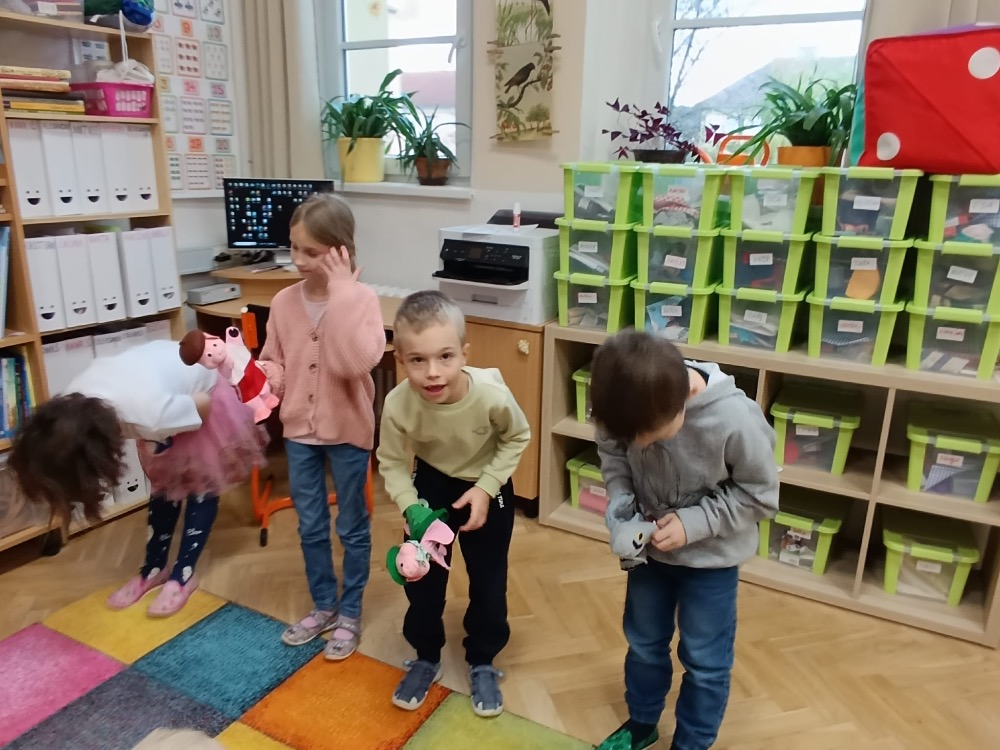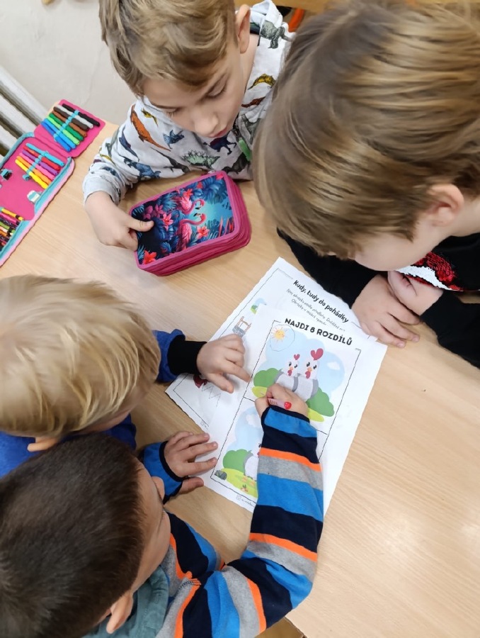 Ráno jsme odstartovali slepičí rozcvičkou. Děti se pak rozdělily do skupin. V nich společně řešily úkoly. Hledaly cestu z bludiště, vytleskávaly slova a určovaly počet slabik, určovaly, co do pohádky nepatří, hledaly rozdíly mezi obrázky, atd. V případě první pohádky nesměl chybět Ptačí tanec, který se velmi líbil. Druhý příběh si děti po jeho vyslechnutí ještě zahrály s pomocí maňásků. V závěru dnešního bloku jsme z pohádek vyvodili ponaučení, že si máme navzájem pomáhat, dělit se, neodbývat svoji práci a dbát rad rodičů.