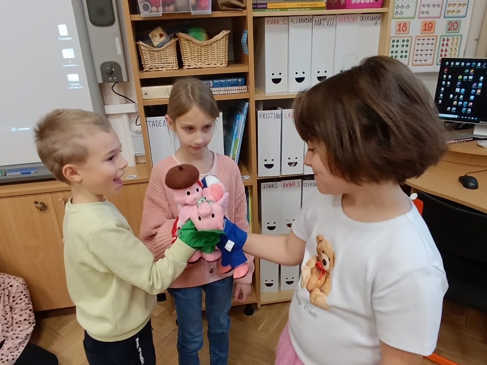 Ve středu jsme pokračovali v našem putování pohádkovou říší pomocí pohádek O slepičce a kohoutkovi a O třech prasátkách.