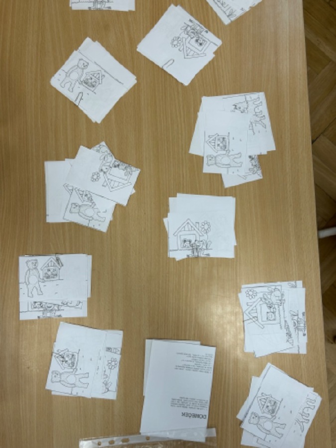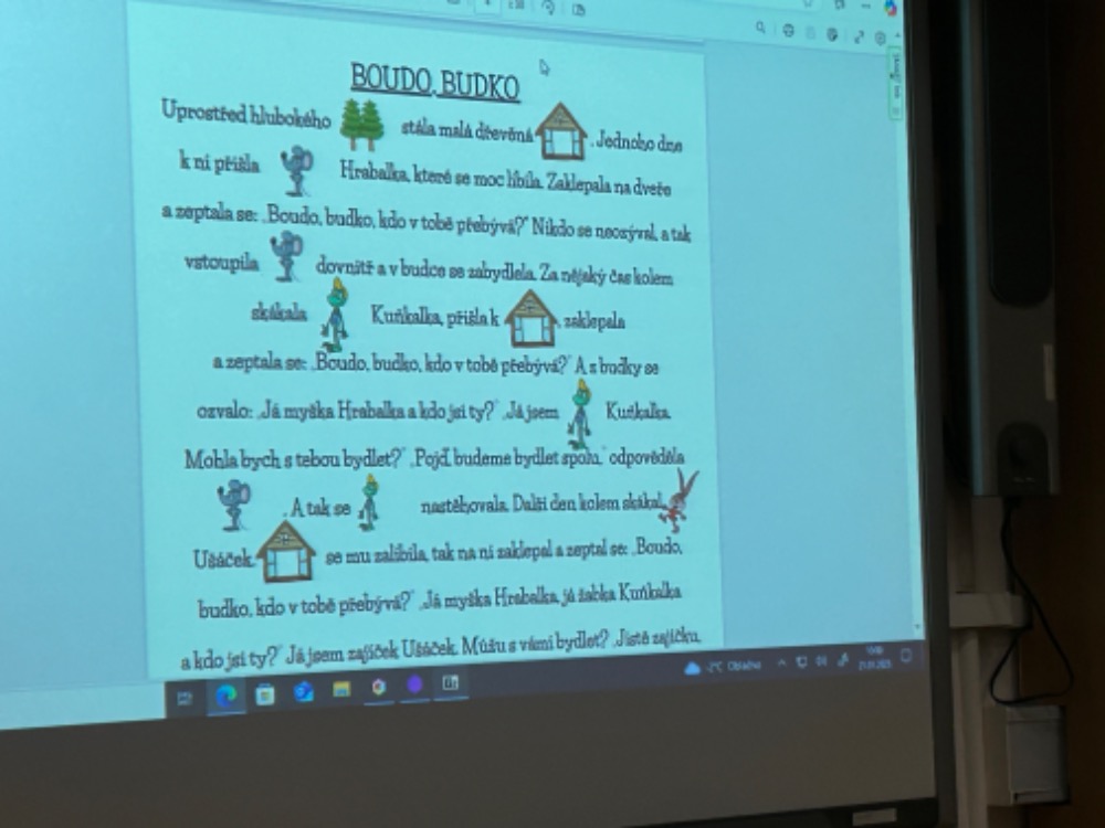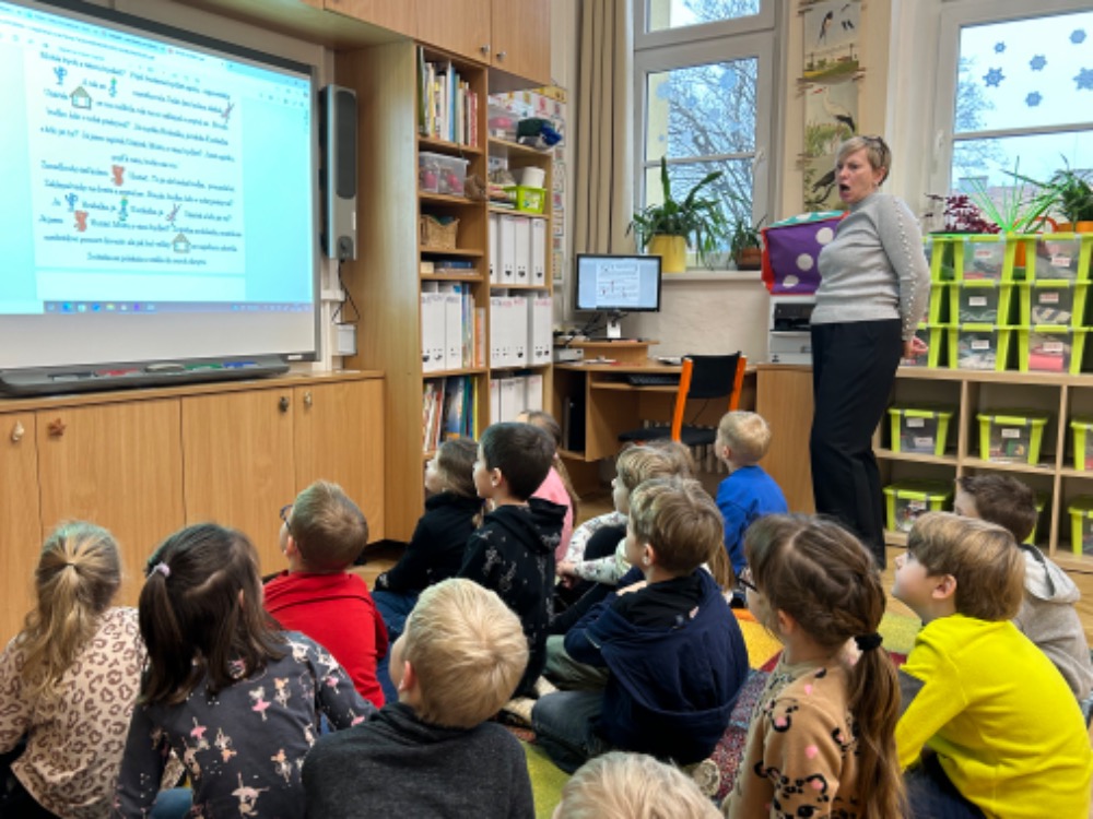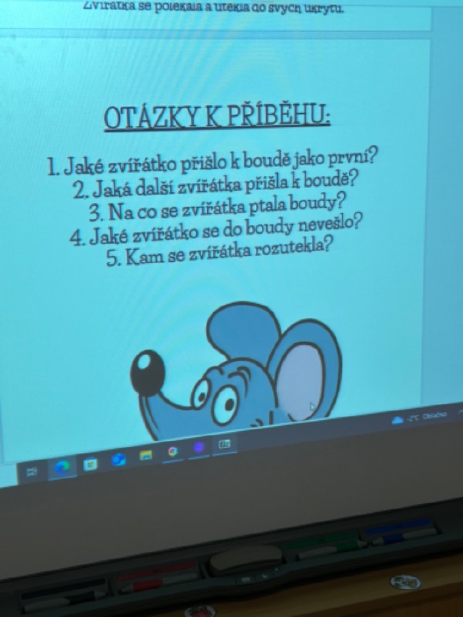 Společně jsme si děj přečetli. Děti pak odpovídaly na otázky různými styly. Procvičili jsme slabikování slov, hledali rozdíly mezi obrázky, skládali děj pomocí obrázků, pohádku zdramatizovali.
