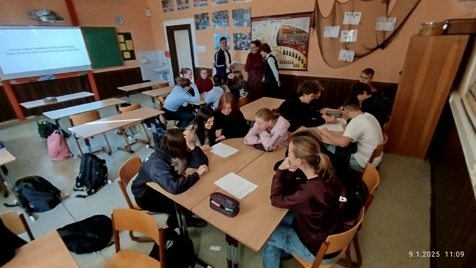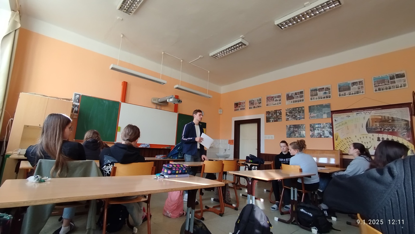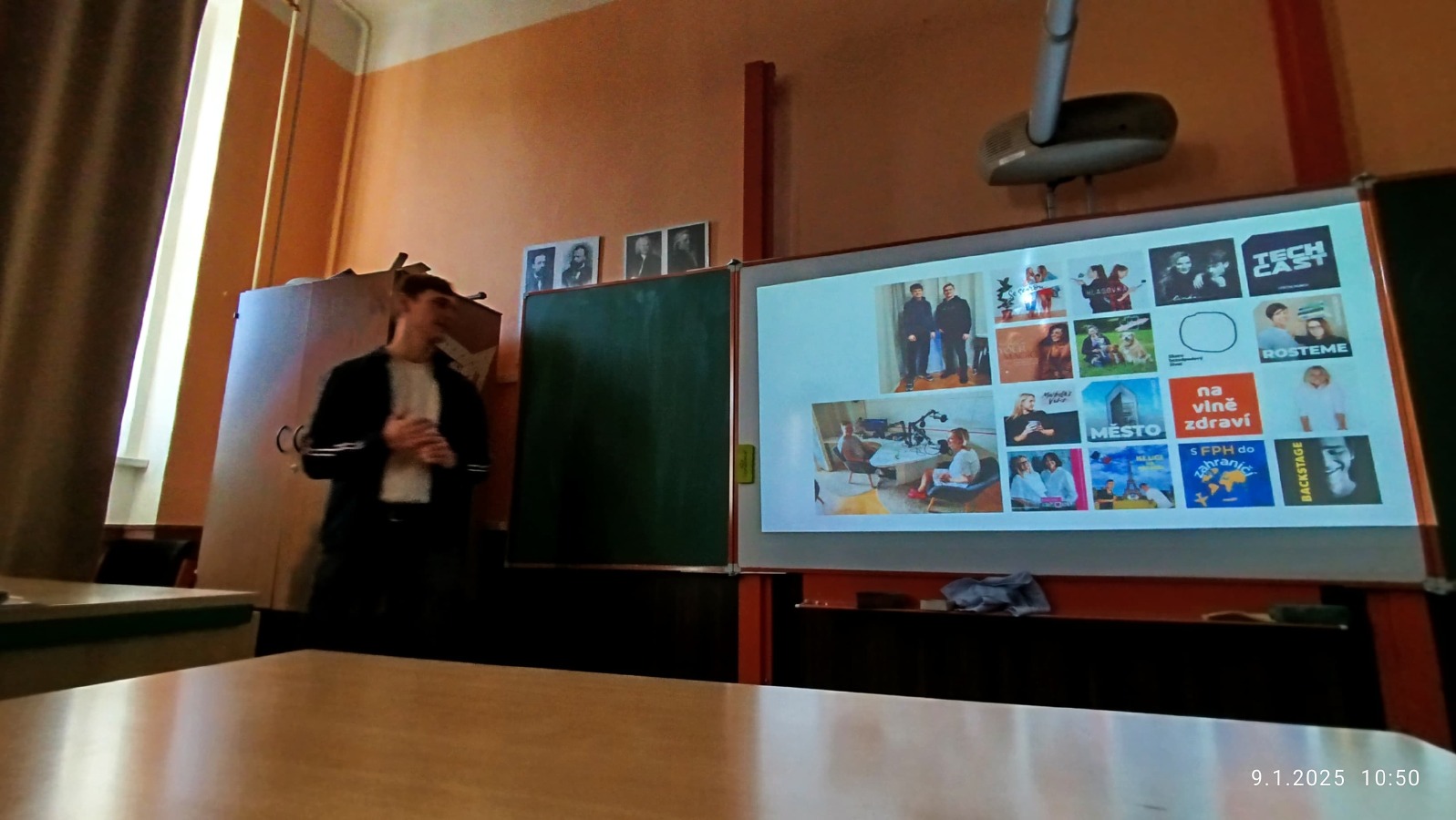 Dne 9.1. absolvovala třída 9.A v rámci projektu Den pro školu dvouhodinový program s naším bývalým žákem Václavem Vágnerem. Ten nyní dobrovolně spolupracuje s Nadací České spořitelny a v roli odborníka z praxe se snaží svým příběhem inspirovat žáky a pomáhá jim odhalovat jejich silné stránky a nadchnout je pro určitý obor.