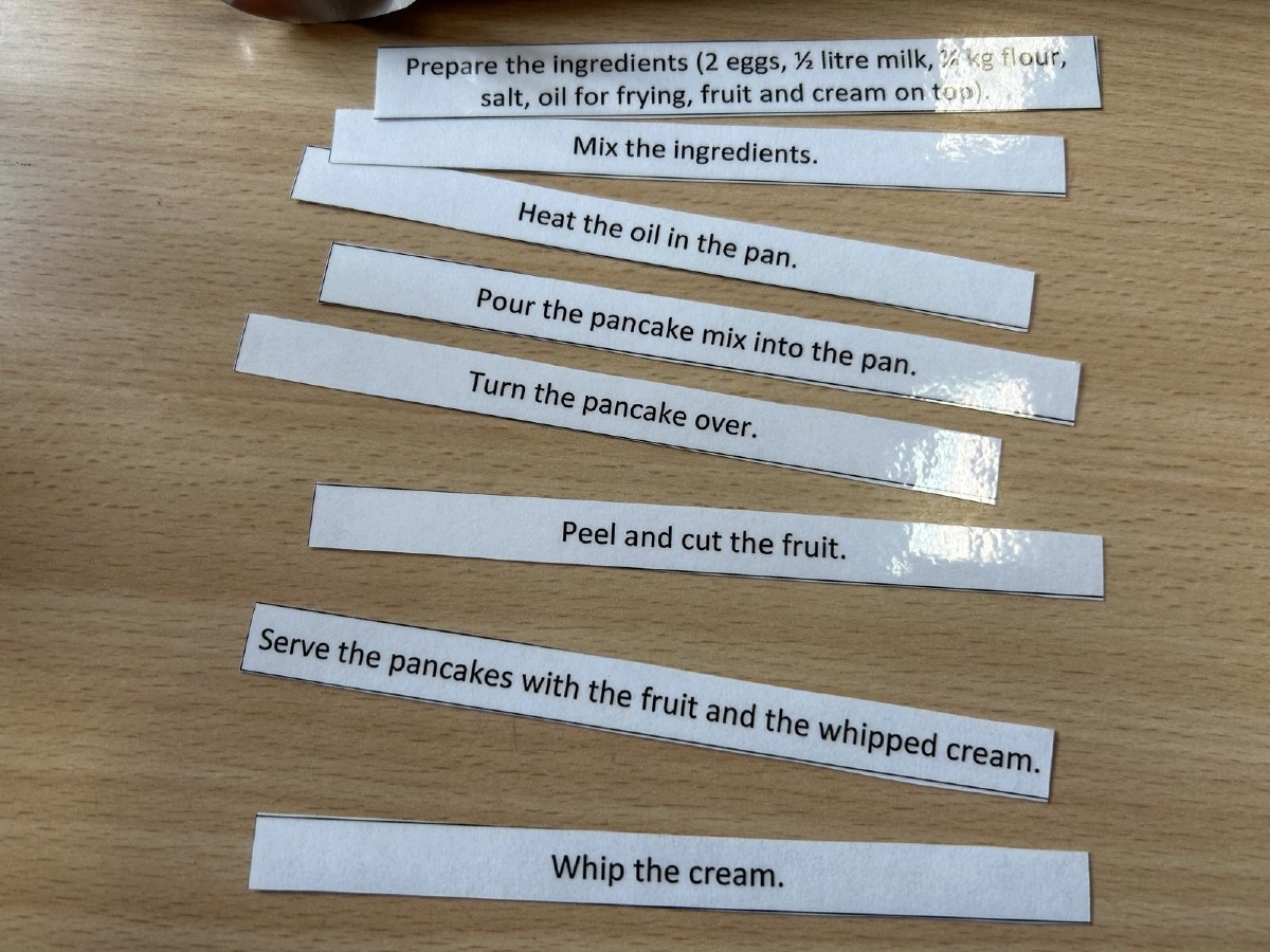 Na začátku dne jsme se rozhodli, že společně sestavíme recept na palačinky. Děti pracovaly ve skupinkách a pomocí překladače se snažily vytvořit recept v anglickém jazyce a pak v českém. Během práce jsme si také ujasnili, jaké ingredience potřebujeme: mouku, mléko, vejce, sůl a trochu cukru.