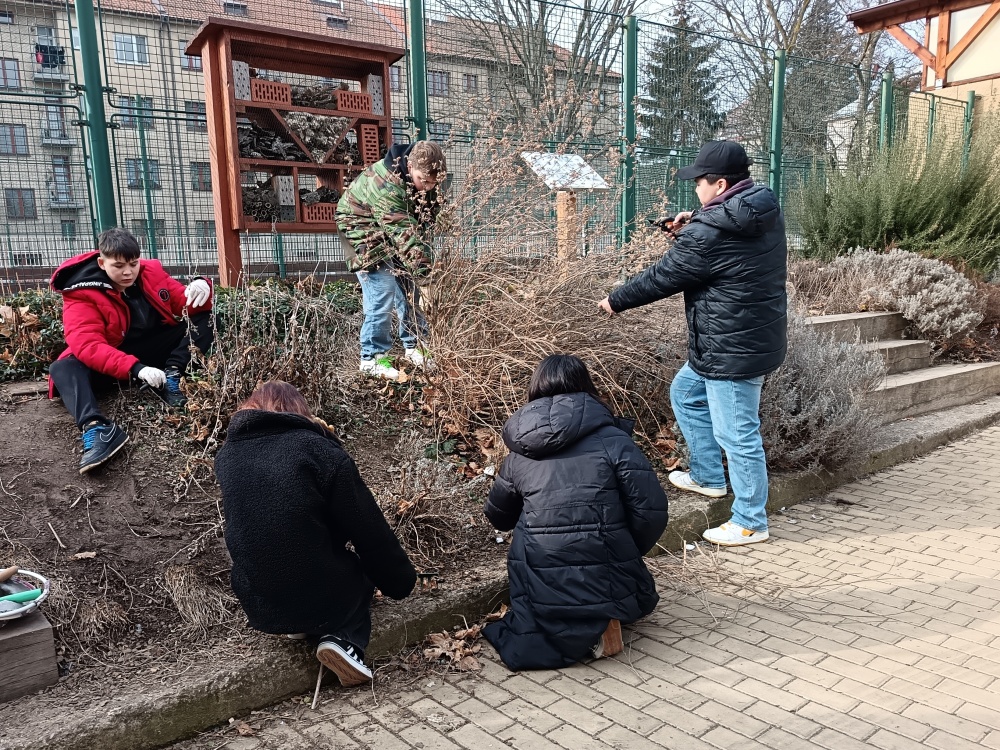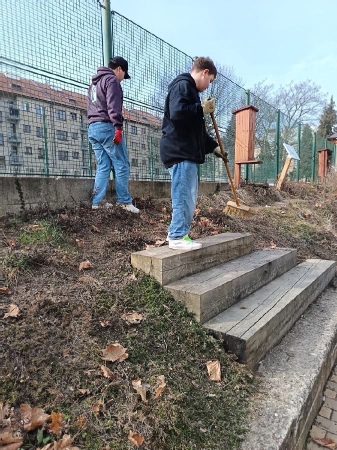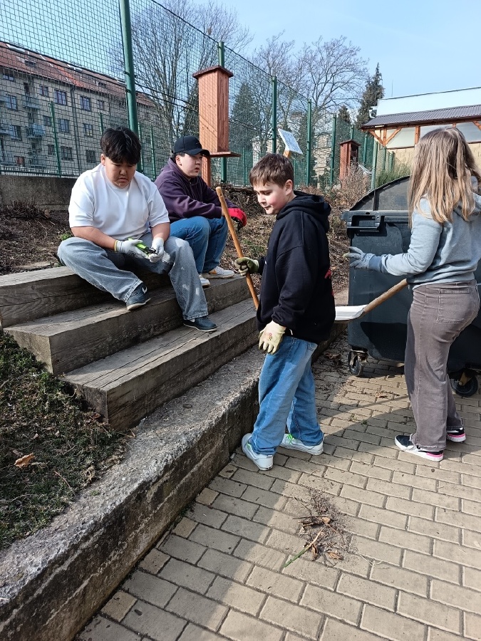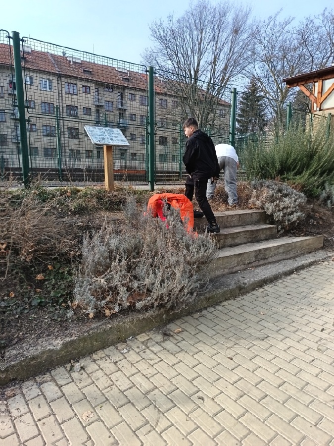 Počasí se zlepšilo, a tak se mohli sedmáci konečně vydat o pracovních činnostech ven. Ve středu čistili žáci ze 7.C venkovní záhon u cesty k jídelně. Ostříhali suché odumřelé květiny a bylinky a vysbírali suché listy.