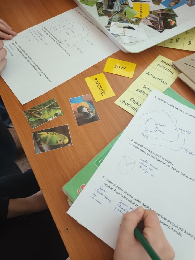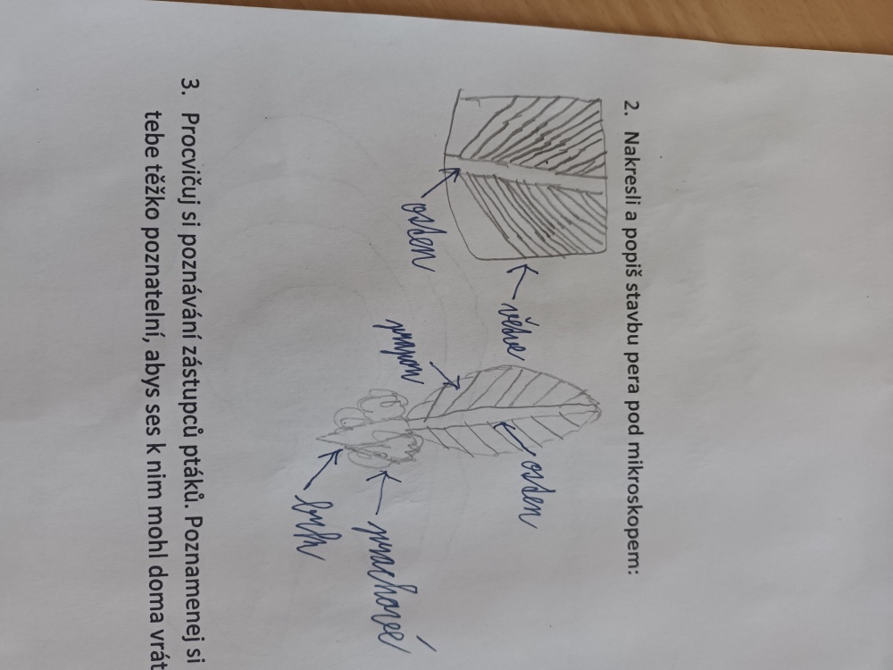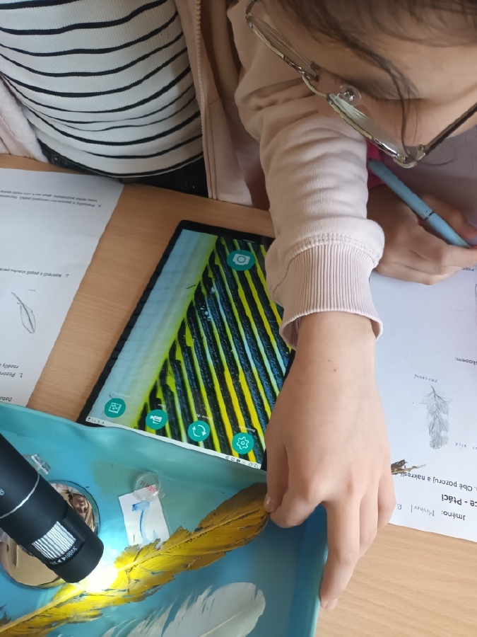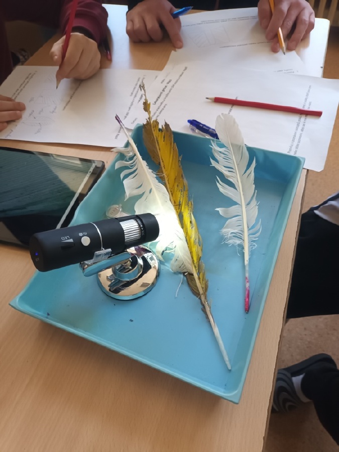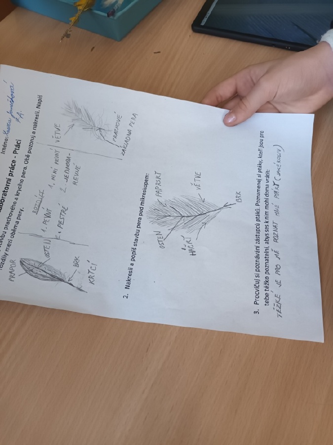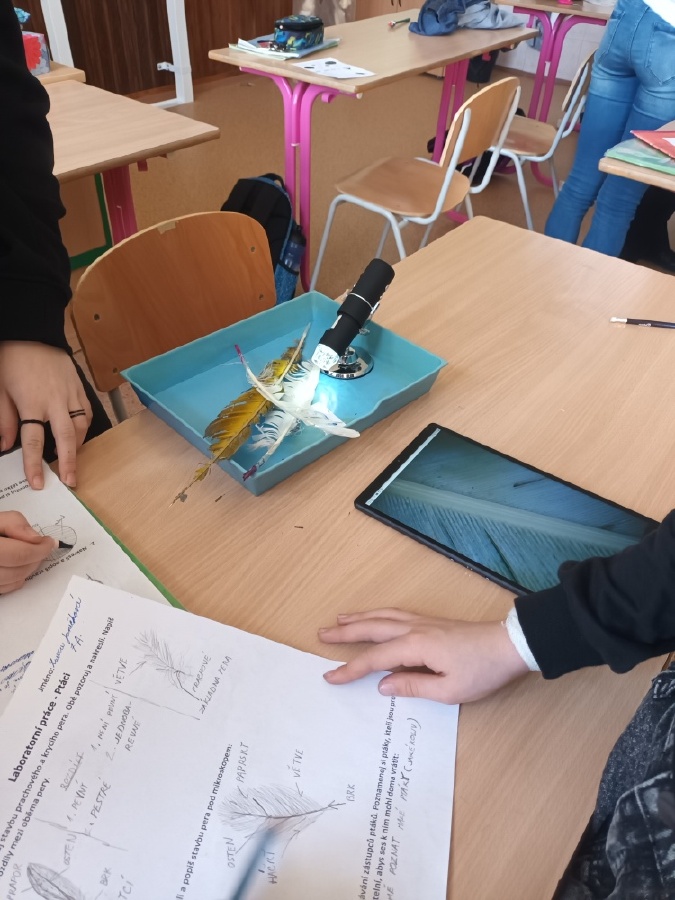V rámci laboratorní práce na téma ptáci žáci 7.ročníků objevovali tajemství stavby ptačího peří a vejce. Pomocí mikroskopů zkoumali strukturu ptačího peří a pomocí lupy skořápku vejce i jeho vnitřní stavbu. Žáci se také učili poznávat různé druhy ptáků podle jejich charakteristických znaků. Výsledky pozorování a určování si zaznamenávali do svých protokolů a vzájemně ověřovali jejich správnost s pomocí literatury a dostupných zdrojů.