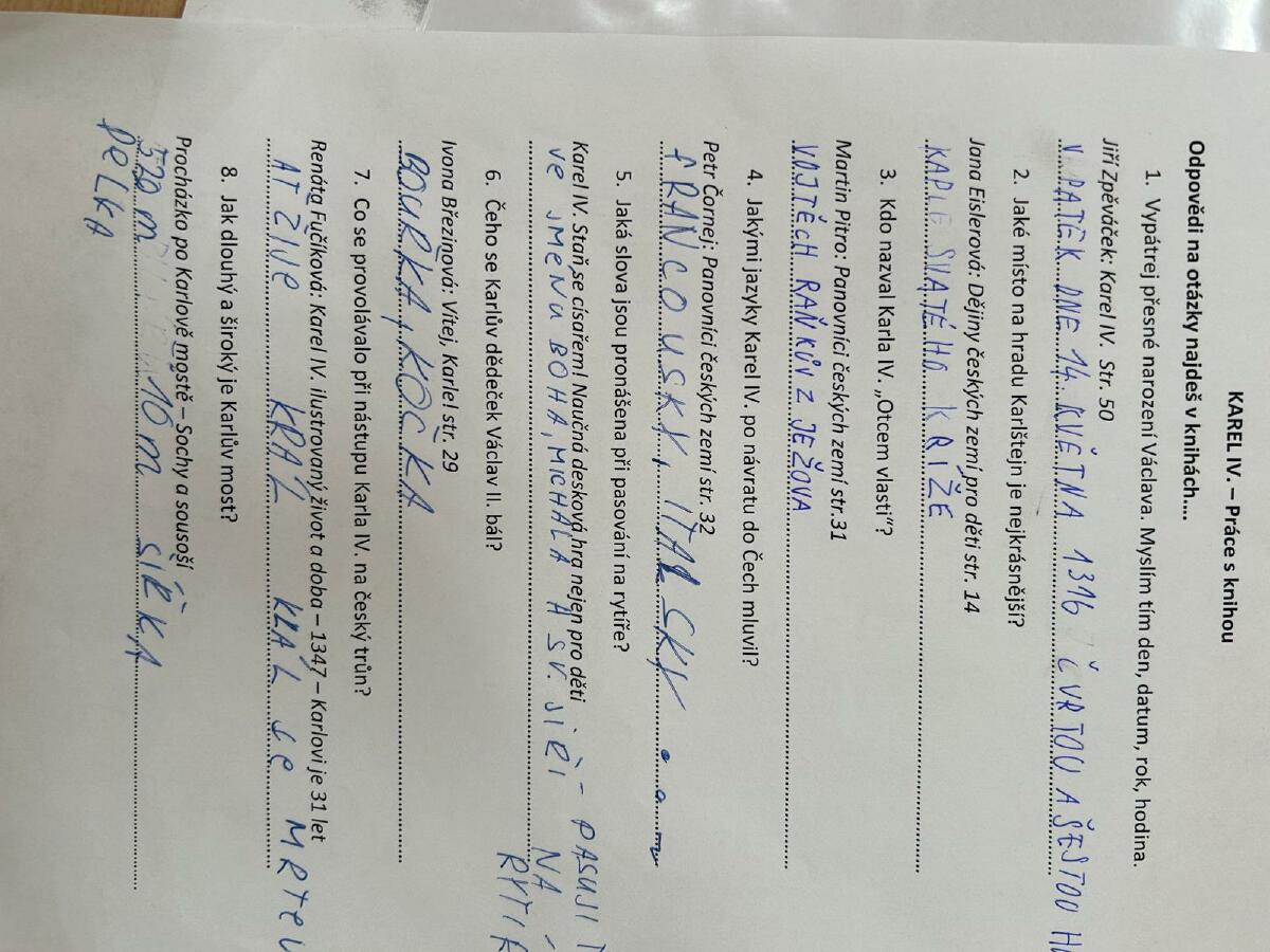 Zhlédli jsme animovaný film a rozdělili se do několika pracovních skupin. Poté jsme zpracovávali několik úkolů. Prvním úkolem bylo sestavit stručný životopis Karla IV., ve kterém jsme shrnuli klíčové body jeho života. Následně jsme se pustili do skládání obrázků, které zachycovaly významné osobnosti z jeho života. Další aktivitou bylo doplňování anglických slov do připraveného textu o Karlu IV. Tato část úkolu pomohla dětem rozšířit jejich jazykové dovednosti a pomocí tabletu využít Google překladač.