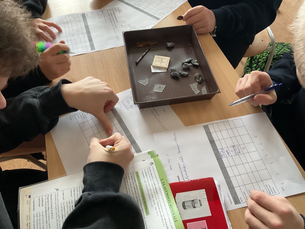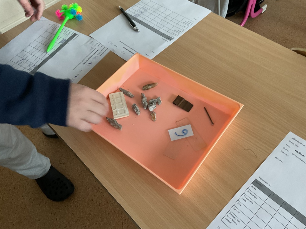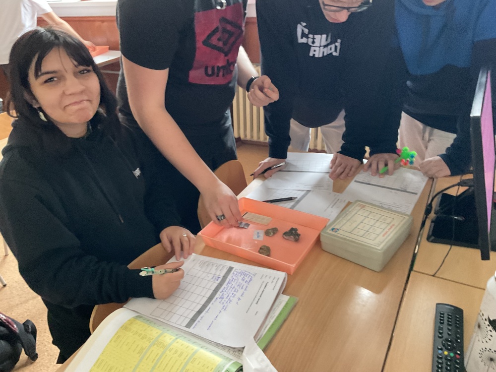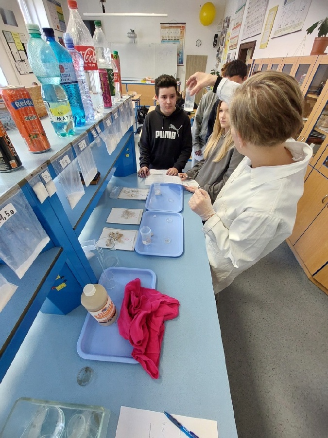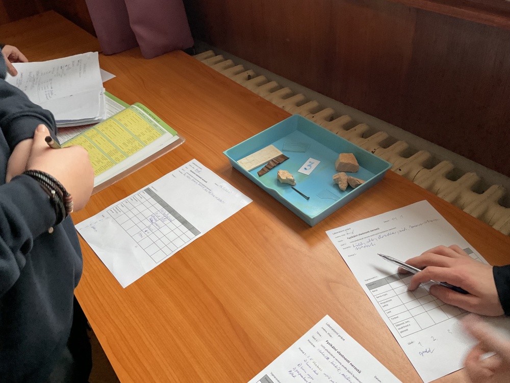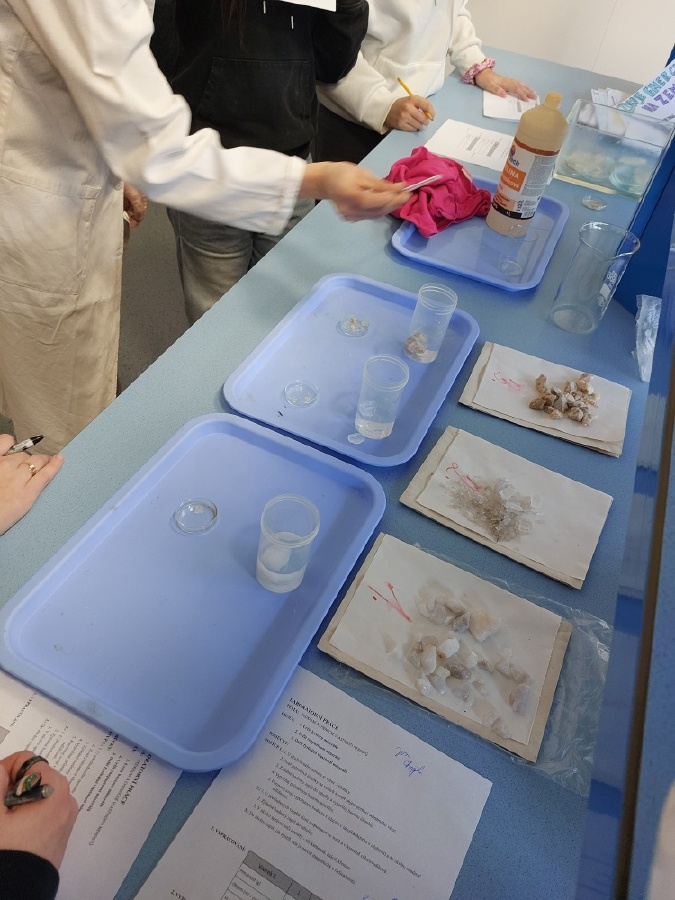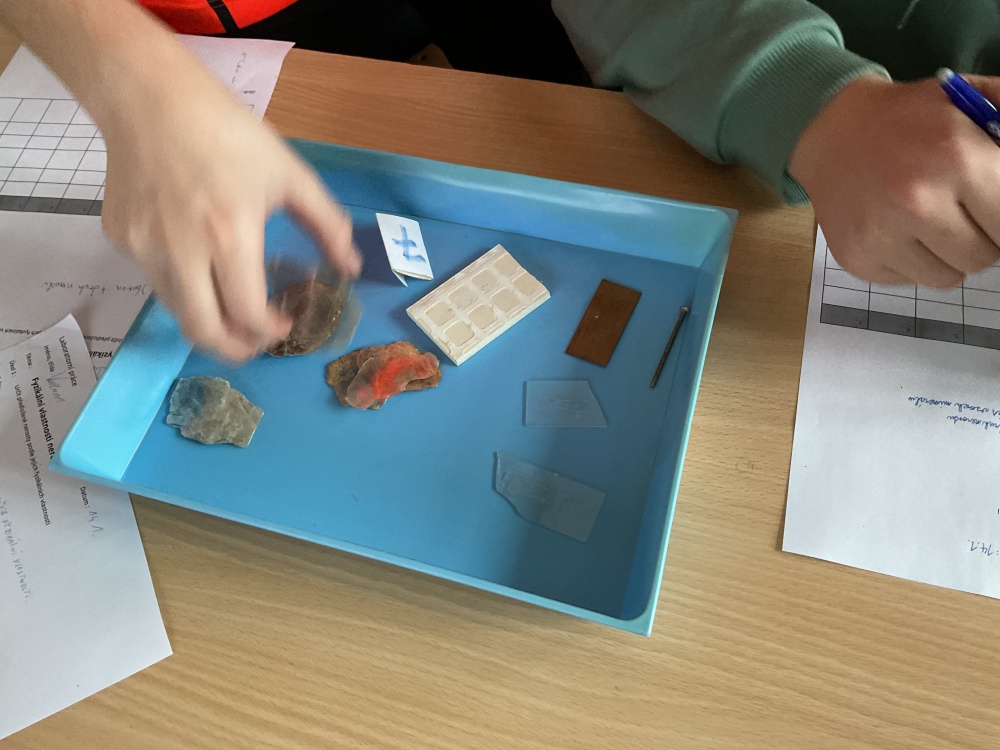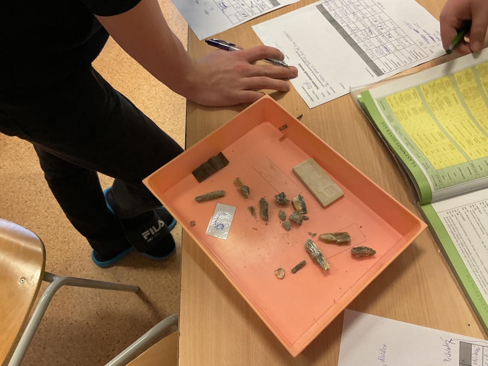 Během posledních dvou laboratorních prací se žáci 9.B věnovali zkoumání fyzikálních a chemických vlastností nerostů. Využívali nejen znalosti geologie, která je náplní přírodopisu 9.ročníku, ale také si zopakovali některá témata z fyziky, matematiky a chemie. Vyzkoušeli si prakticky určení optických vlastností nerostů a stanovení tvrdosti minerálu pomoci Mohsovy stupnice. V rámci science dvouhodiny si zopakovali měření hustoty těles a její výpočet, elektrickou vodivost a magnetismus látek. V chemické části se věnovali rozpustnosti minerálů ve vodě a v kyselině.