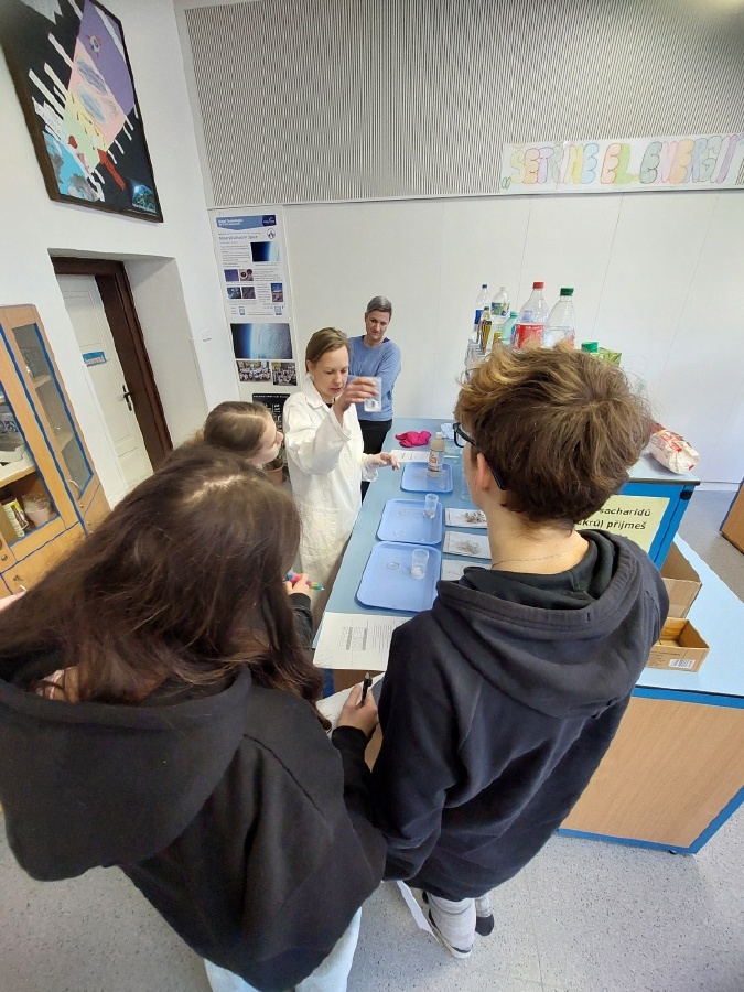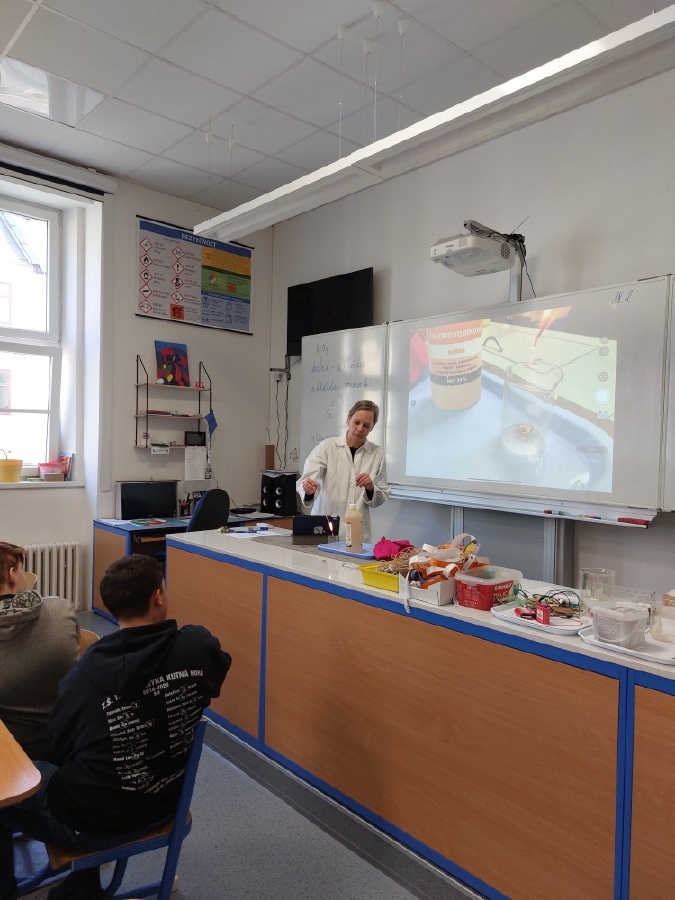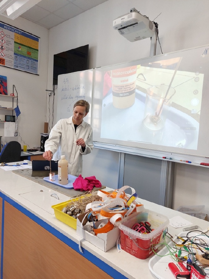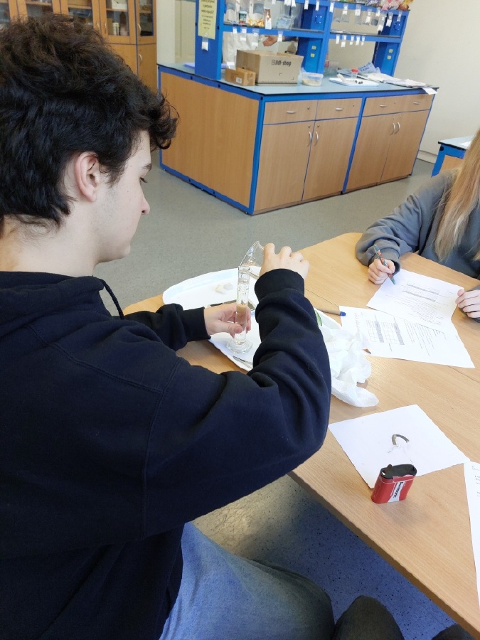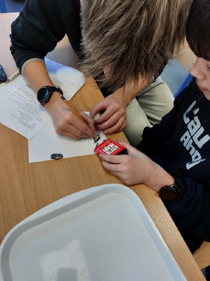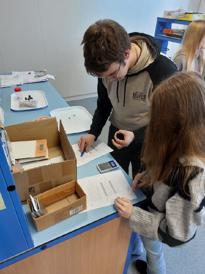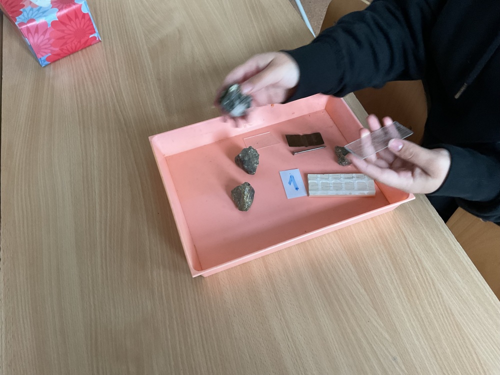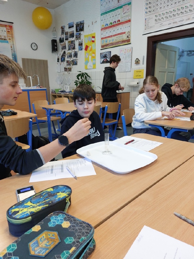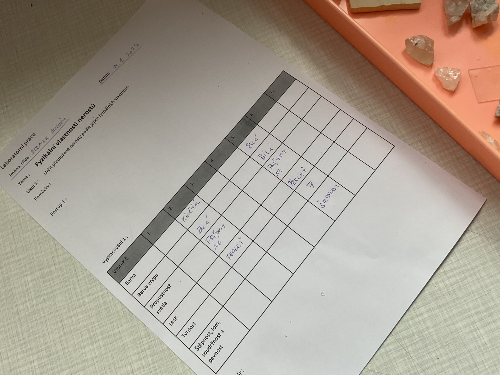 Během posledních dvou laboratorních prací se žáci 9.B věnovali zkoumání fyzikálních a chemických vlastností nerostů. Využívali nejen znalosti geologie, která je náplní přírodopisu 9.ročníku, ale také si zopakovali některá témata z fyziky, matematiky a chemie. Vyzkoušeli si prakticky určení optických vlastností nerostů a stanovení tvrdosti minerálu pomoci Mohsovy stupnice. V rámci science dvouhodiny si zopakovali měření hustoty těles a její výpočet, elektrickou vodivost a magnetismus látek. V chemické části se věnovali rozpustnosti minerálů ve vodě a v kyselině.