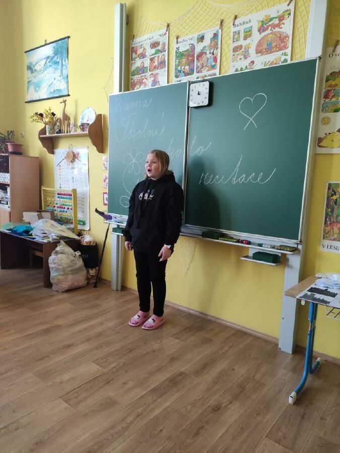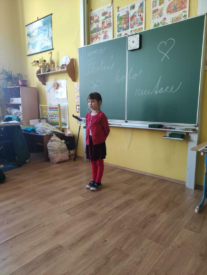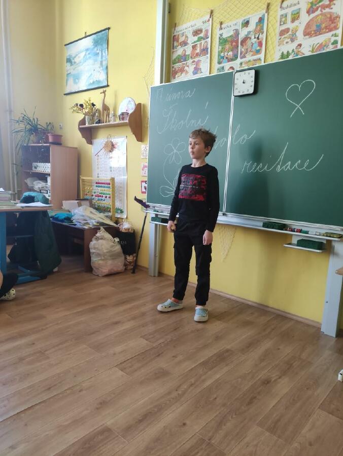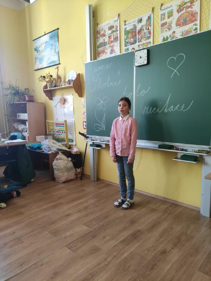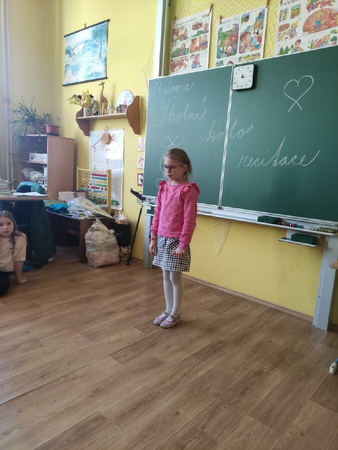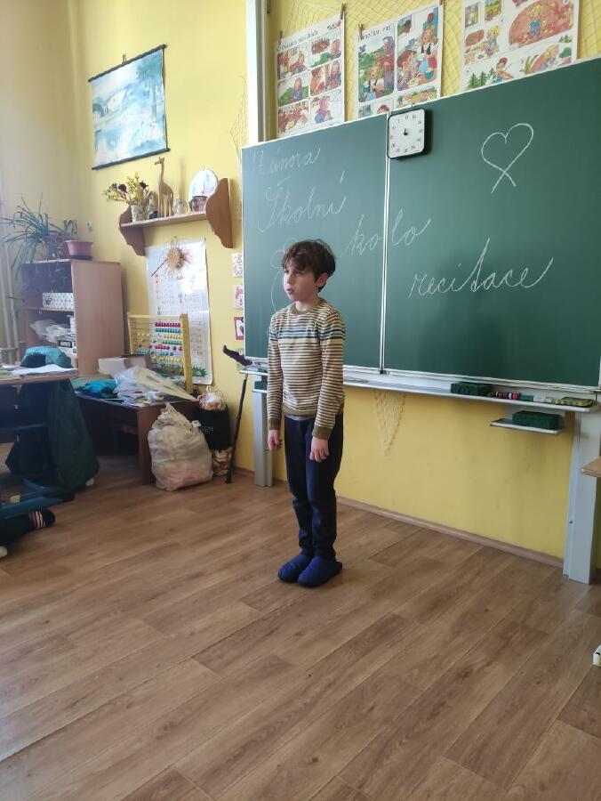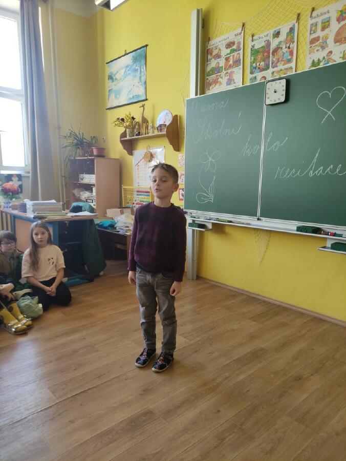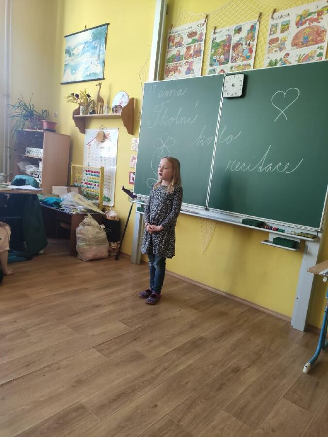Dne 17. a 18. února se na naší škole konala recitační soutěž pro žáky prvního stupně. Soutěž si na zkoušku vyzkoušeli i naši prvňáčci. Měli moc pěkné básničky a bez ostychu se o ně s námi podělili. Moc se jim to povedlo.