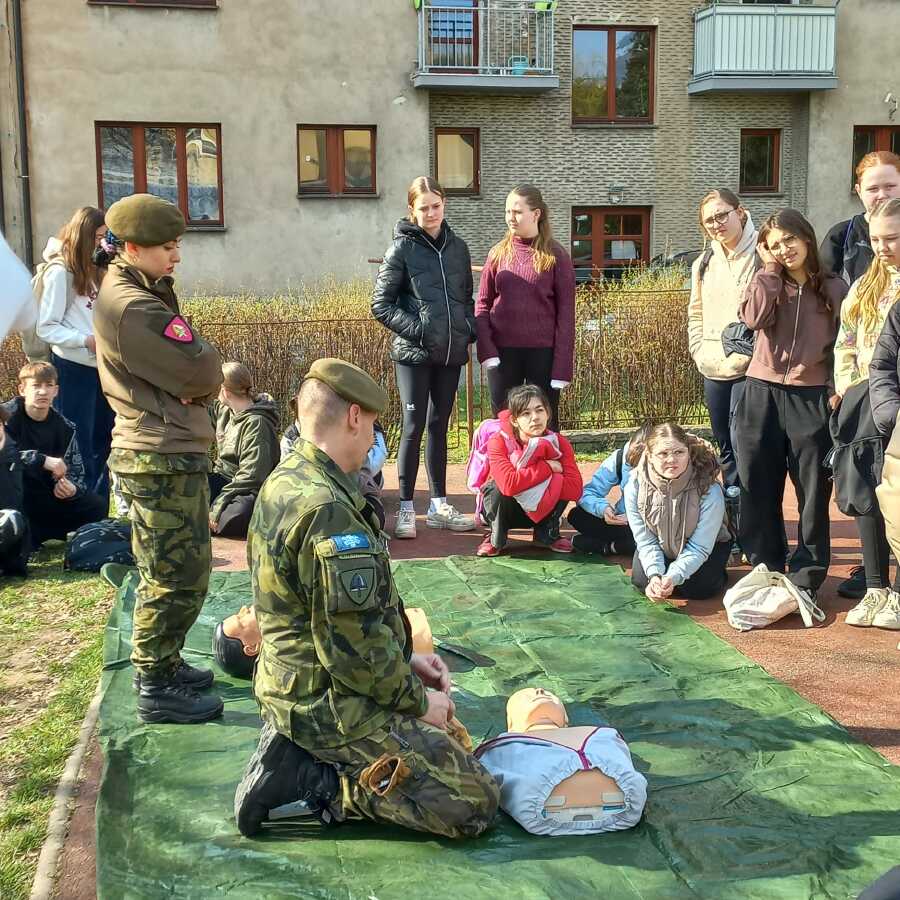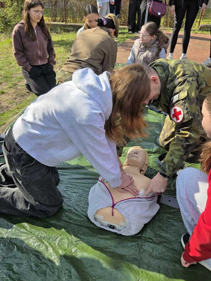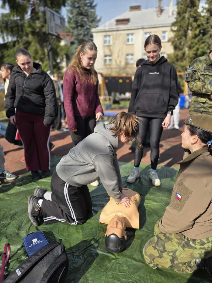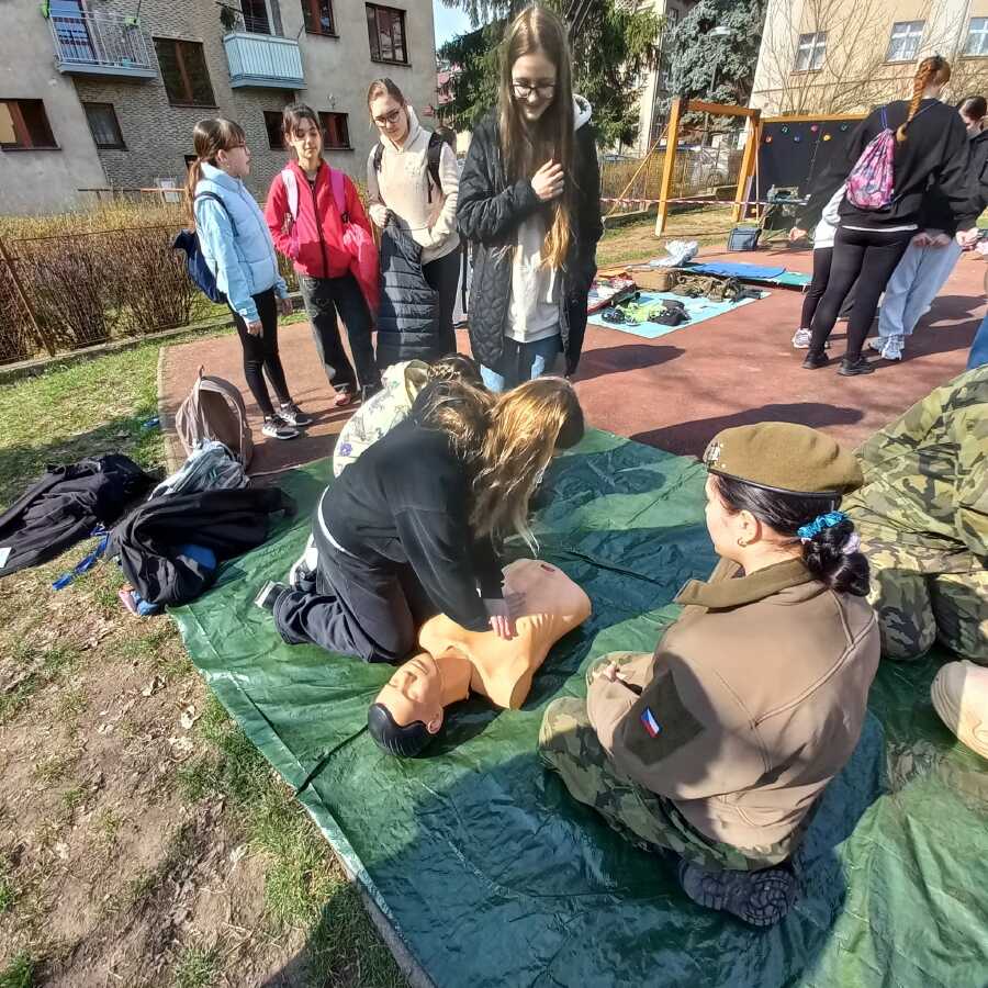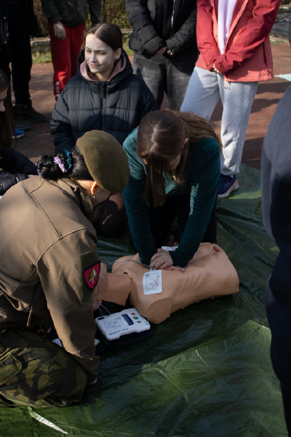 · První pomoc v terénu: Žáci se naučili, jak použít defibrilátor, resuscitaci zraněného a volání první pomoci.