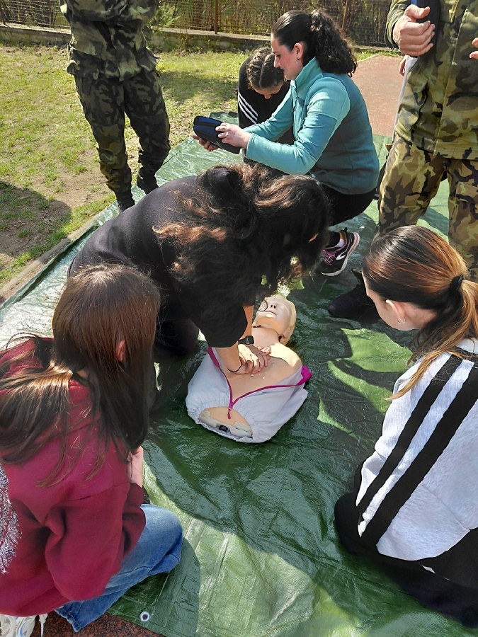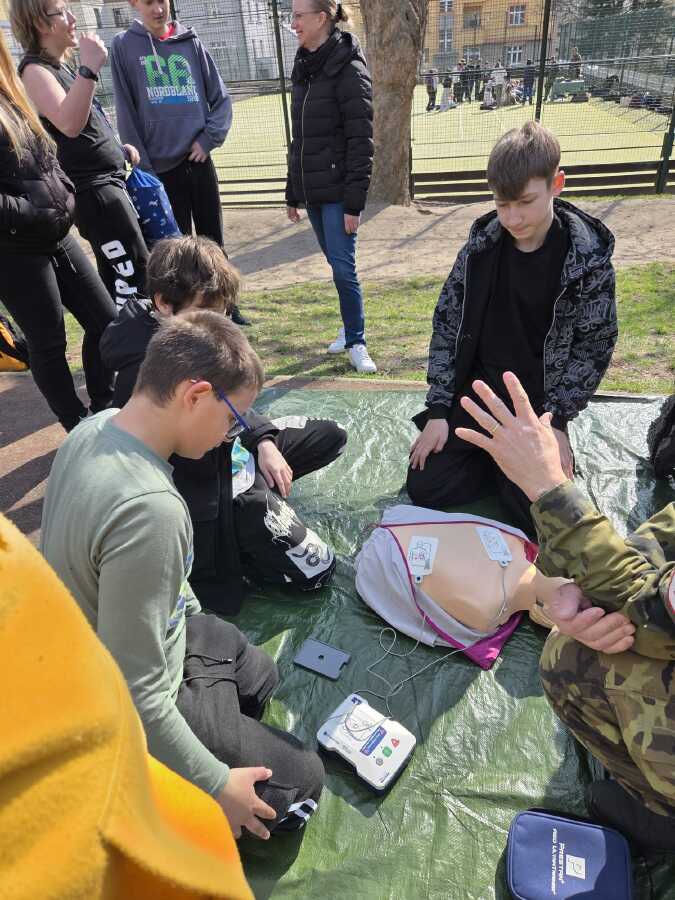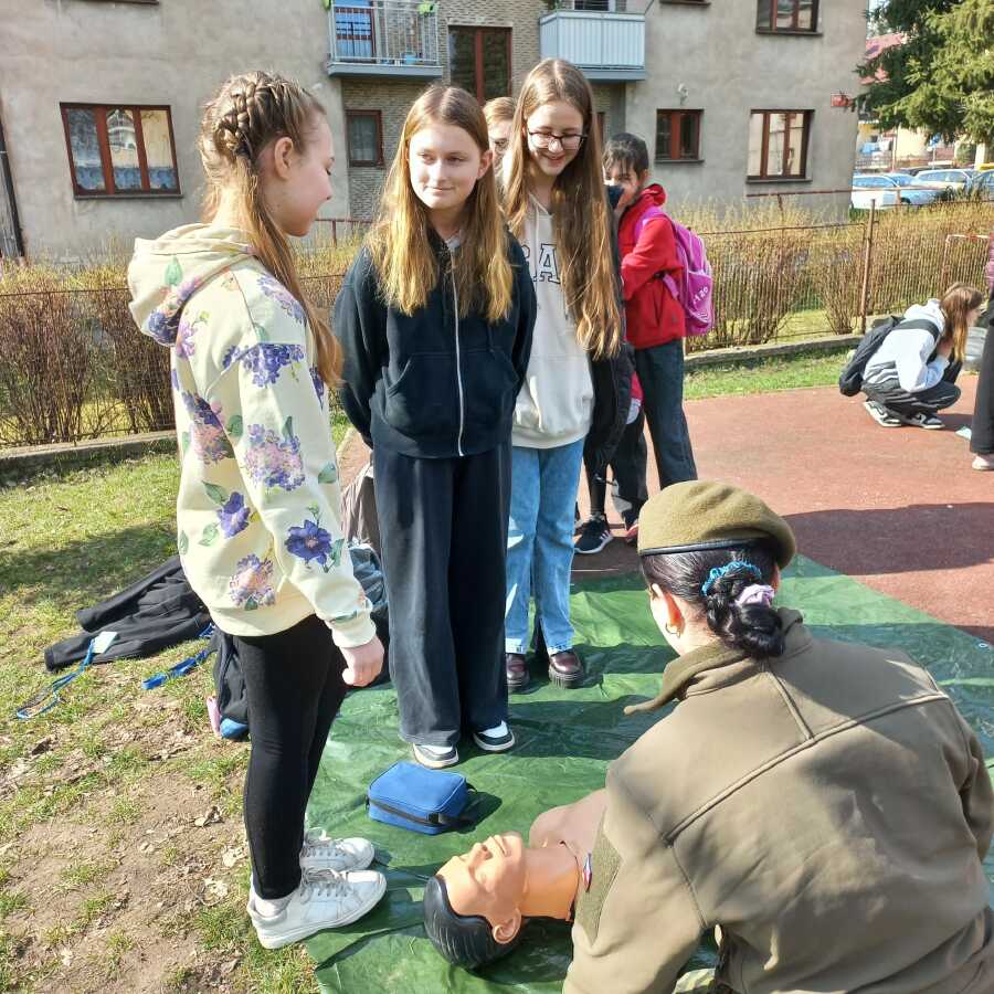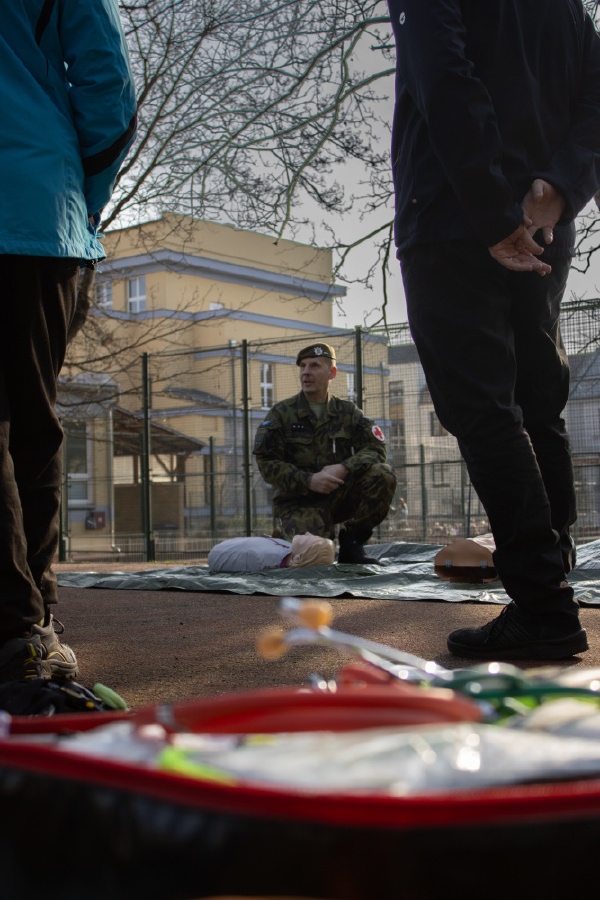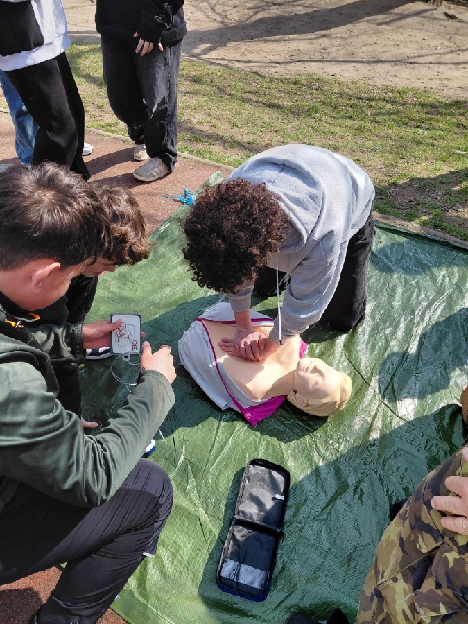 · První pomoc v terénu: Žáci se naučili, jak použít defibrilátor, resuscitaci zraněného a volání první pomoci.