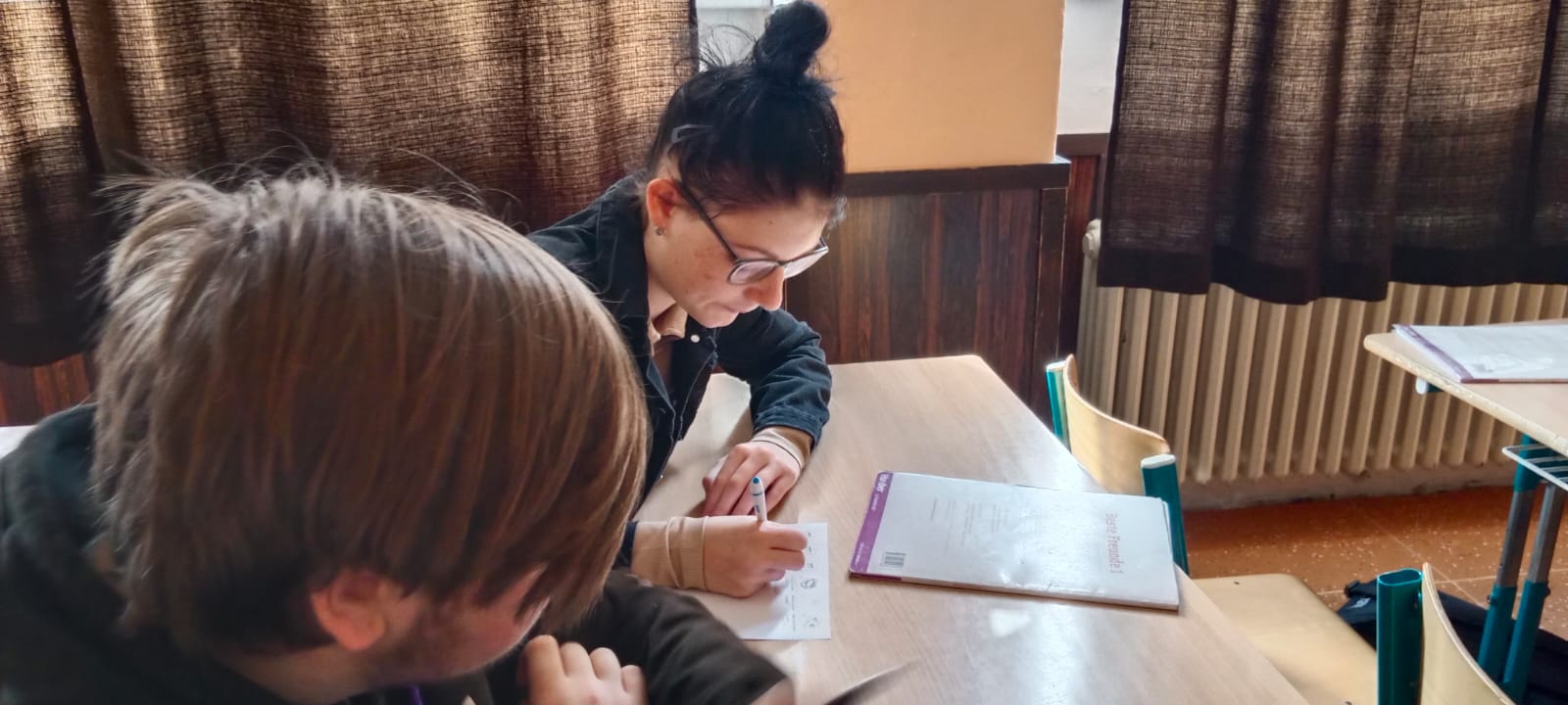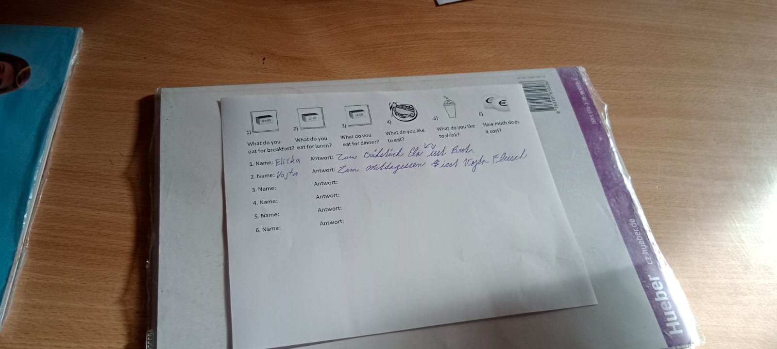 V závěru hodiny měly děti za úkol komunikovat ve třídě s alespoň šesti spolužáky. Každý dostal pracovní list, na němž stály otázky v angličtině. Otázky si při rozhovorech překládaly do němčiny a v němčině na ně i odpovídaly.