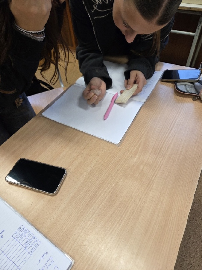 Během posledních dvou hodin přírodopisu se žáci devátých ročníků věnovali zkoumání fyzikálních i chemických vlastností nerostů. Využívali nejen znalosti geologie, která je náplní přírodopisu 9.ročníku, ale také si zopakovali některá témata z fyziky a chemie. Vyzkoušeli si prakticky určení optických vlastností nerostů a stanovení tvrdosti minerálu pomoci Mohsovy stupnice. V dalším zkoumání si vyzkoušeli také magnetismus látek. V chemické části se věnovali rozpustnosti minerálů ve vodě a v kyselině.