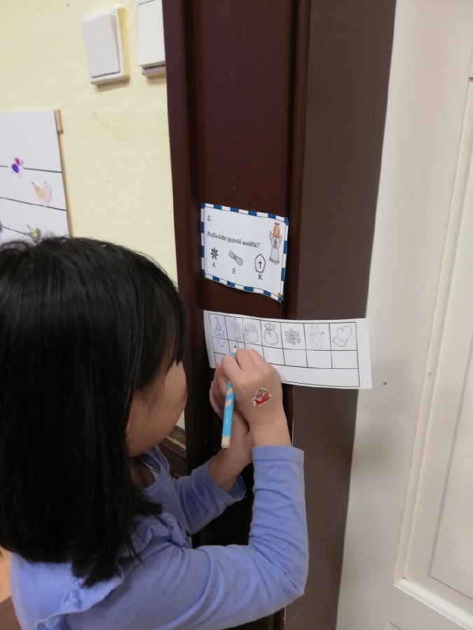 Děti poté pracovaly na tematických stanovištích, kde si procvičovaly počítání a orientaci v číslech hodem „andělskými koulemi“ na terče s různými bodovými hodnotami, které samostatně sčítaly. Současně rozvíjely čtenářskou gramotnost a rychlé myšlení prostřednictvím běhacího luštění a jazykové dovednosti skládáním obrázků podle slabik.
