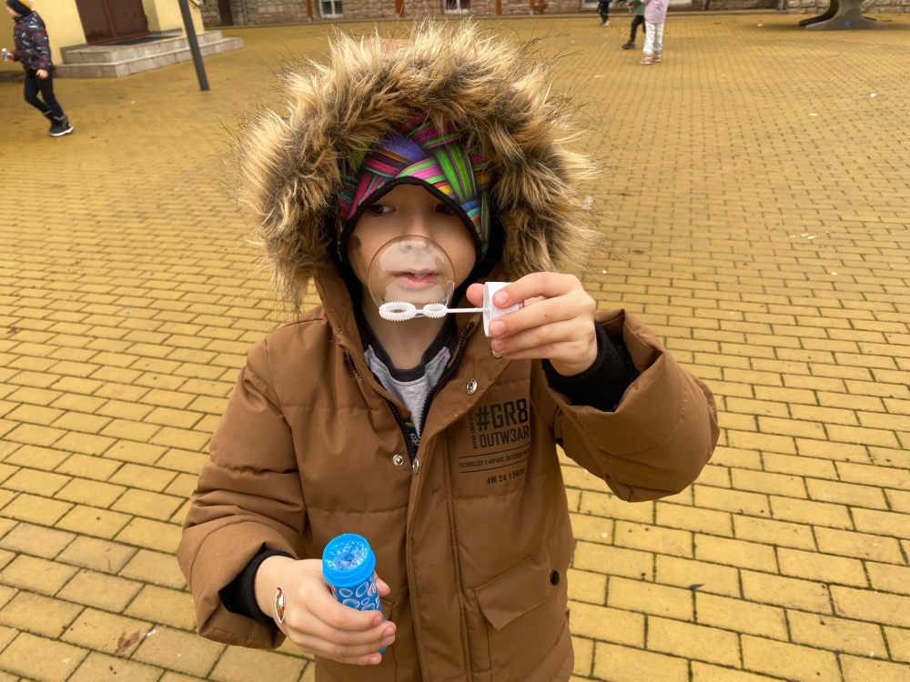Následovala badatelská aktivita – místo původně plánovaných mrznoucích bublin jsme kvůli teplejšímu počasí tvořili co největší a nejdelší řady obyčejných bublin, což děti velmi zaujalo.