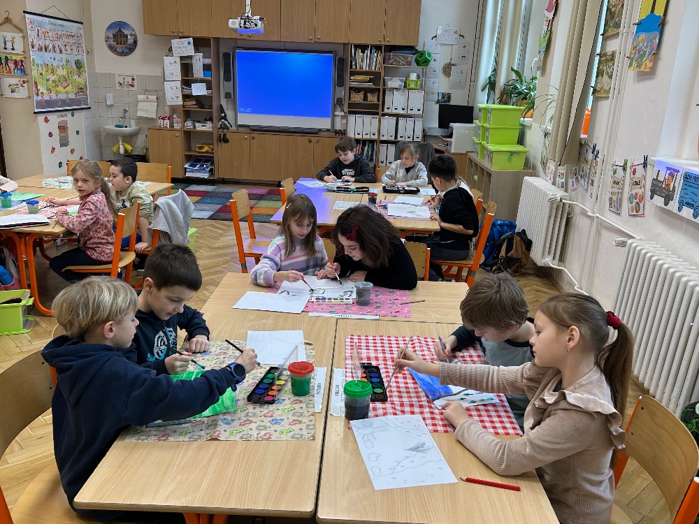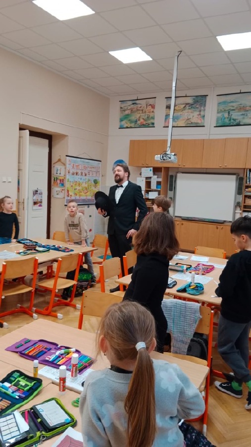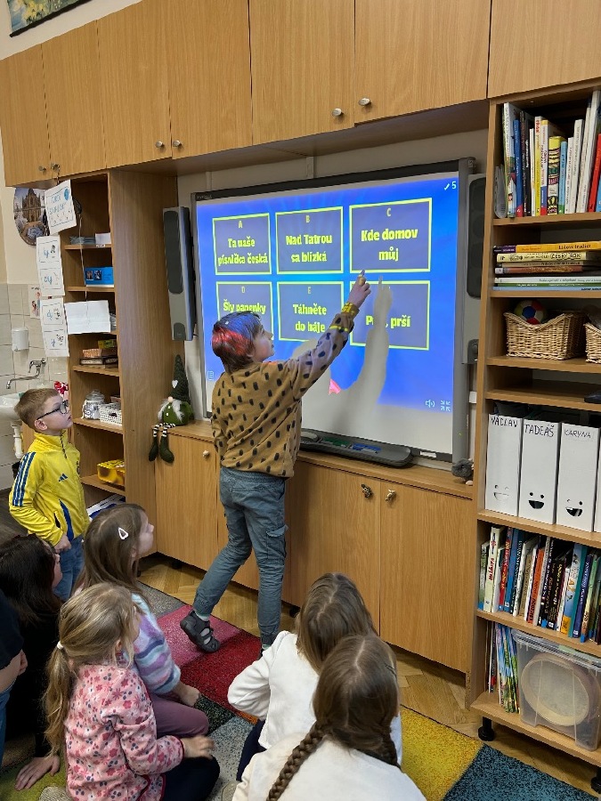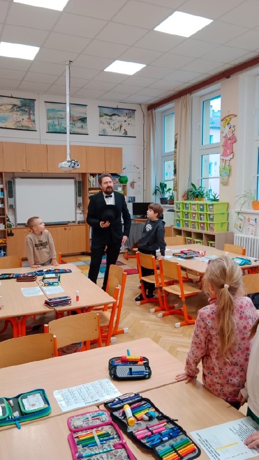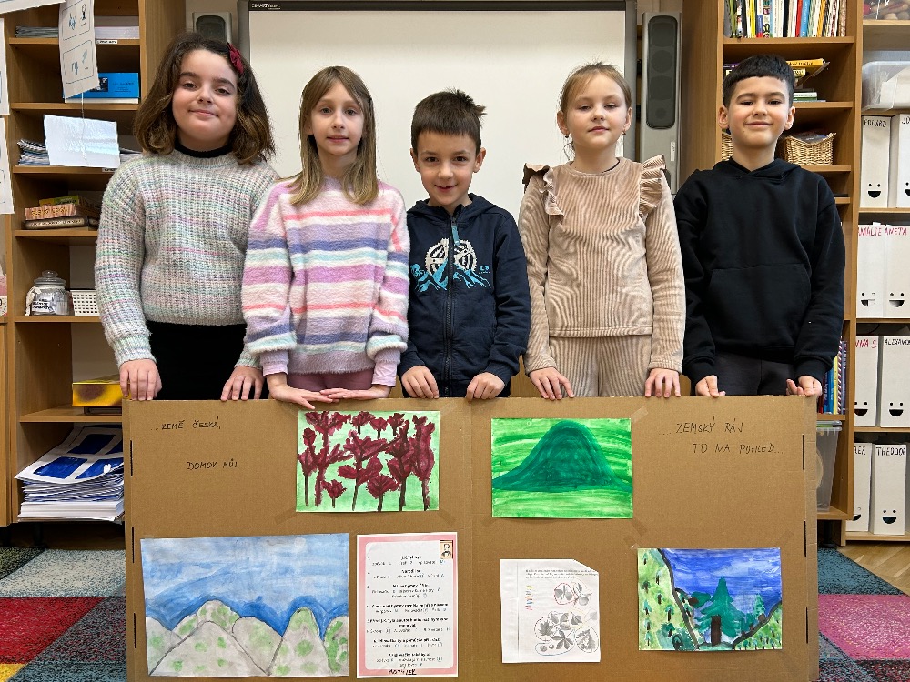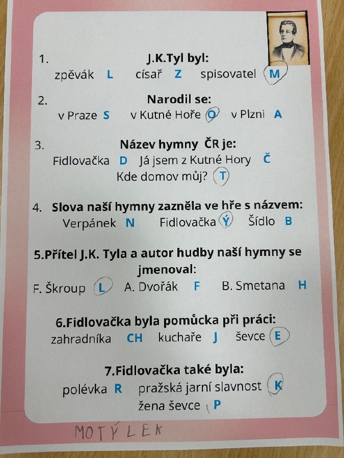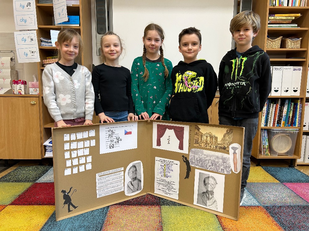 Žáci 2.B ve svém projektovém dni propojili hned několik témat. Přes pojmy vlast, domov jsme došli k naší státní hymně a odsud už to byl jen krůček k jejímu autorovi, Josefu Kajetánu Tylovi. Nejprve jsme přečetli knížku Příběh naší hymny. Tou nás provázel brouček jménem Týlek…. je zde krásně popsána a ilustrována krajina naší vlasti tak, aby vše pochopily malé děti. Týlek putuje českou krajinou a přemýšlí, kde je nejkrásnější místo k životu. Děti pak sestavily mapu naší republiky a ukázaly si na ní náš domov, naše město. V této souvislosti si připomněly, co je pro ně domov, kde se jim nejvíce líbí. Hudebně jsme si téma doprovodili snad nejkrásnější písní na světě, a to právě naší hymnou. Její slova nám pomohla výtvarně zpracovat část projektu. Od slov hymny to byl další krok k tomu, aby se žáci vydali po stopách samotného autora. Takže už ví, co původně znamená fidlovačka a jak to bylo se vznikem naší státní hymny. Zjistili, kde miláček národa žil, působil, jaká díla napsal. Také jsme řešili kvízy, vymýšleli obměny slov hymny. Třešničkou na dortu bylo malé překvapení v podobě návštěvy samotného autora. Samozřejmě herecky ztvárněného členem ochotnického spolku Tyl a zároveň kolegou T. Morawskim. Děkujeme mu tímto, že nás na chvilku vzal do 19. století. Výstupem z tohoto projektu bude velká kniha z kartonu, kde budou pohromadě veškeré aktivity.