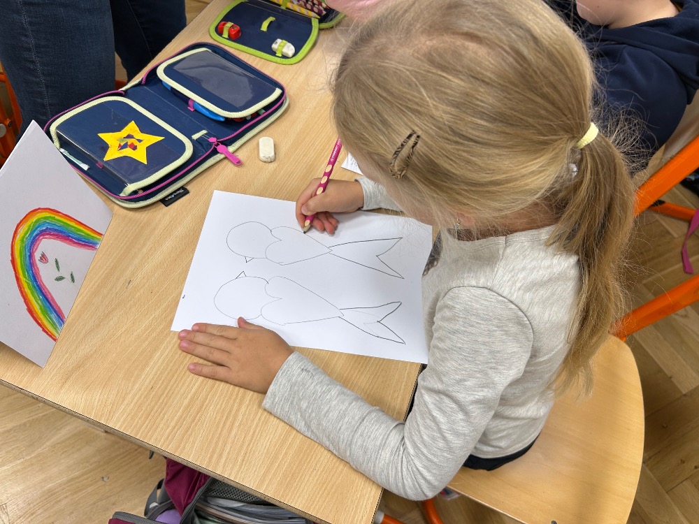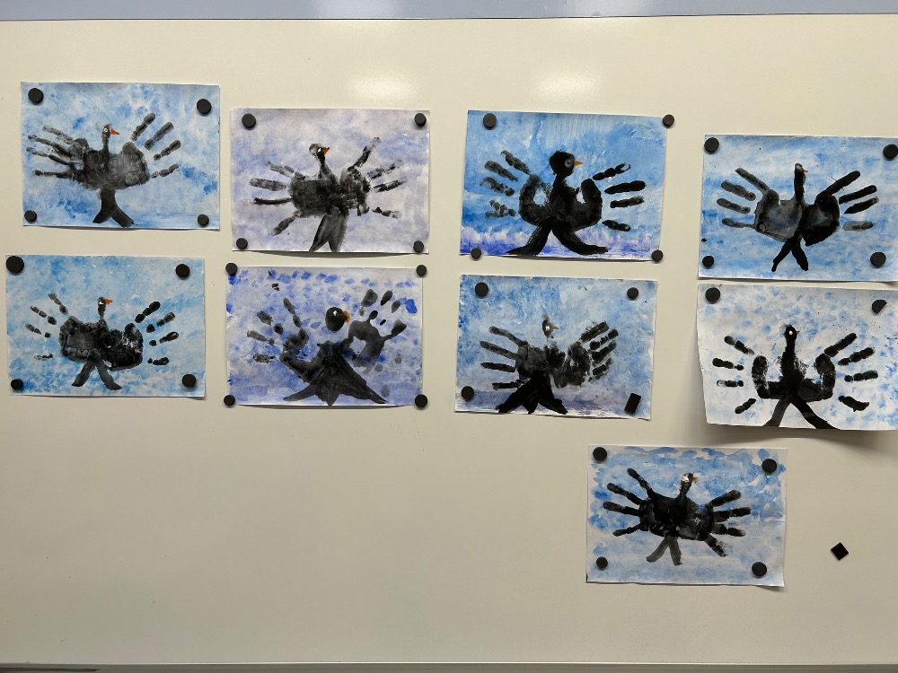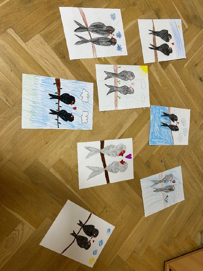 V hodinách výtvarné výchovy si vyzkoušeli různé techniky kreslení a malování tohoto tažného ptáčka. V hudební výchově jsme si o nich zazpívali několik písniček.