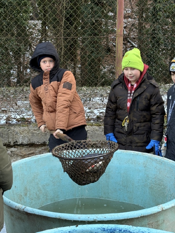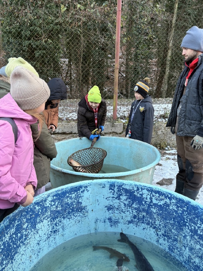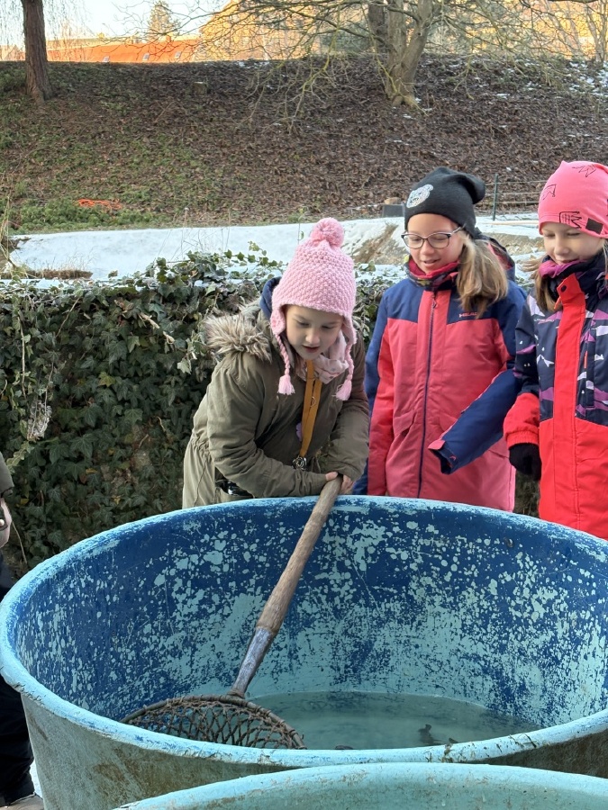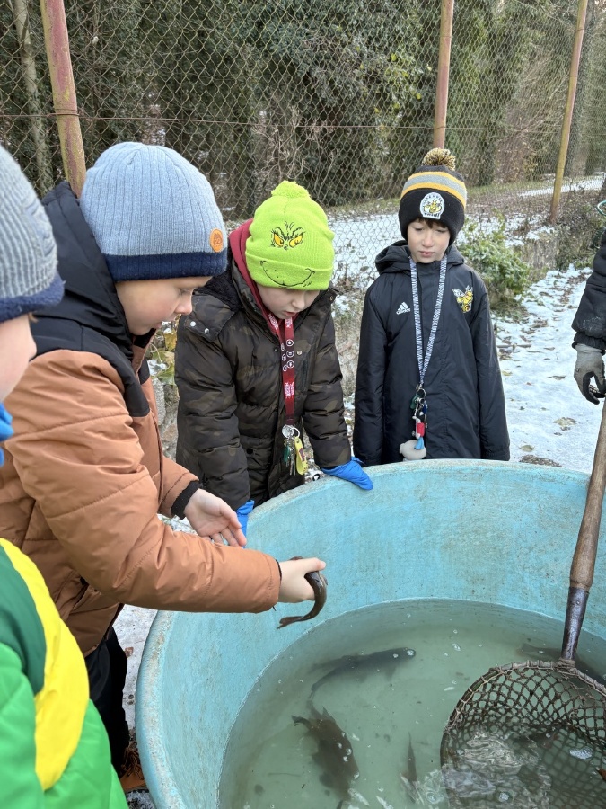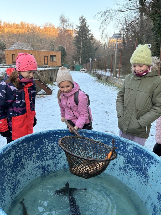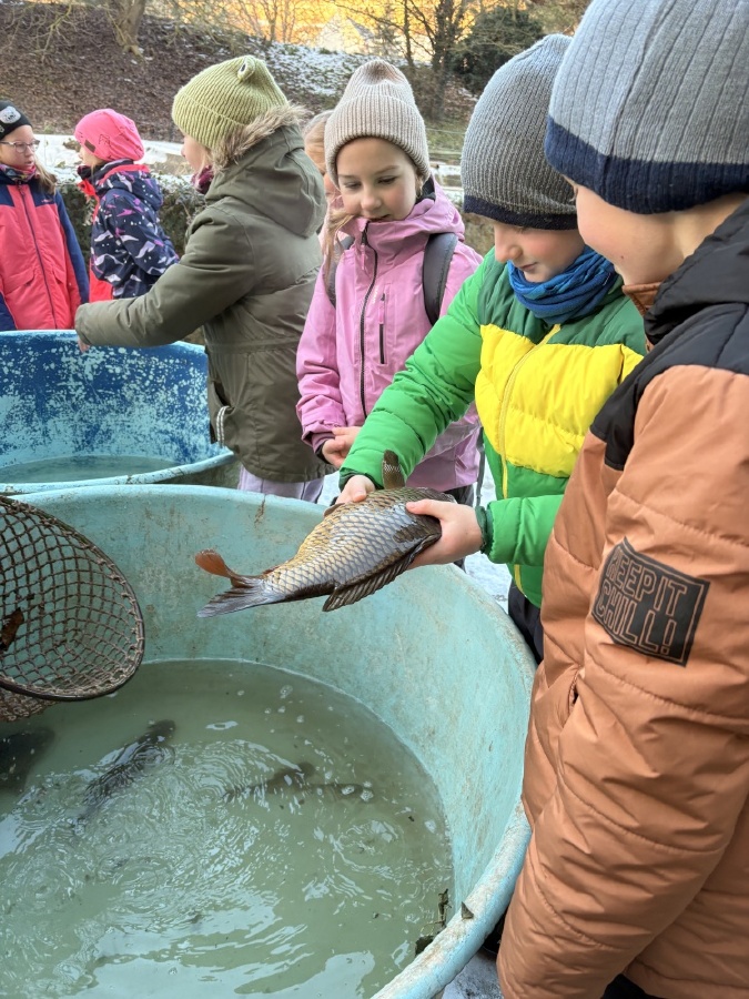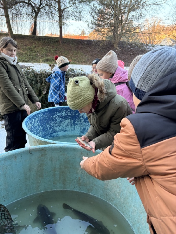 Čtvrťáci se nezalekli mrazivého počasí a s nadšením vyrazili na průzkum života rybníku v rodinném rybářství Haering.