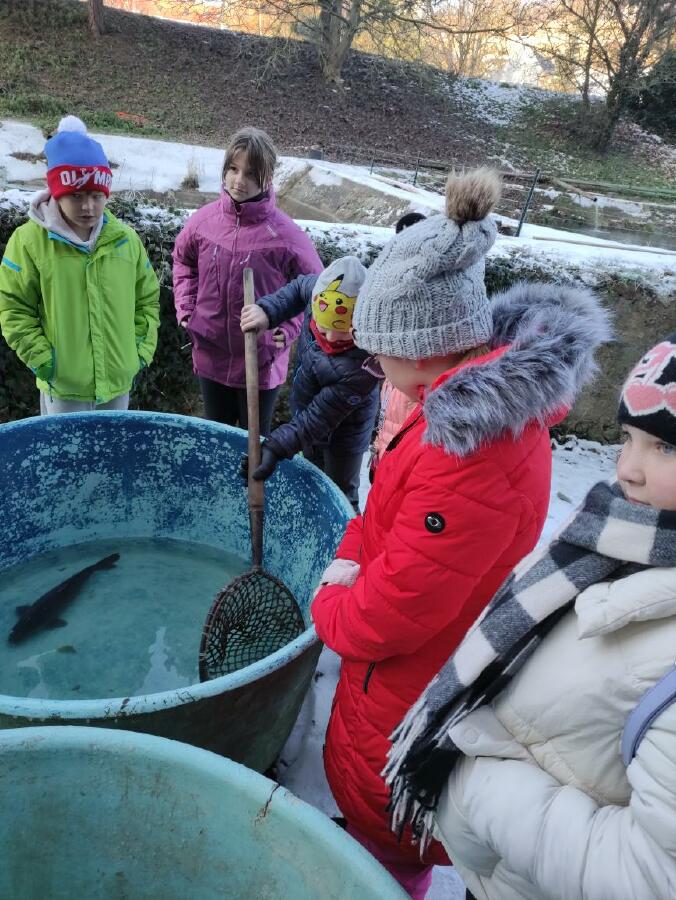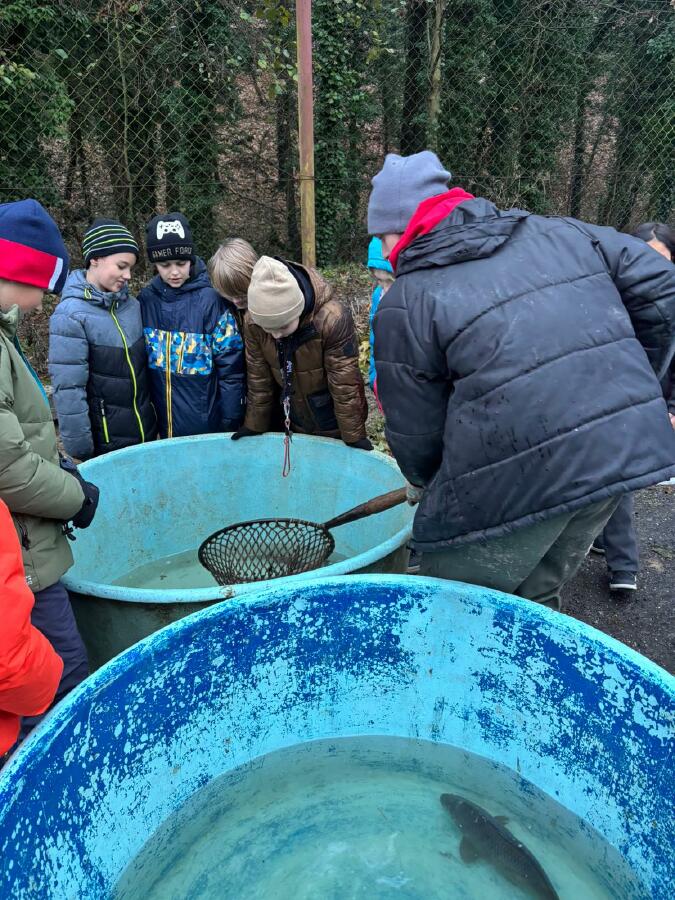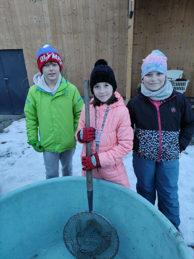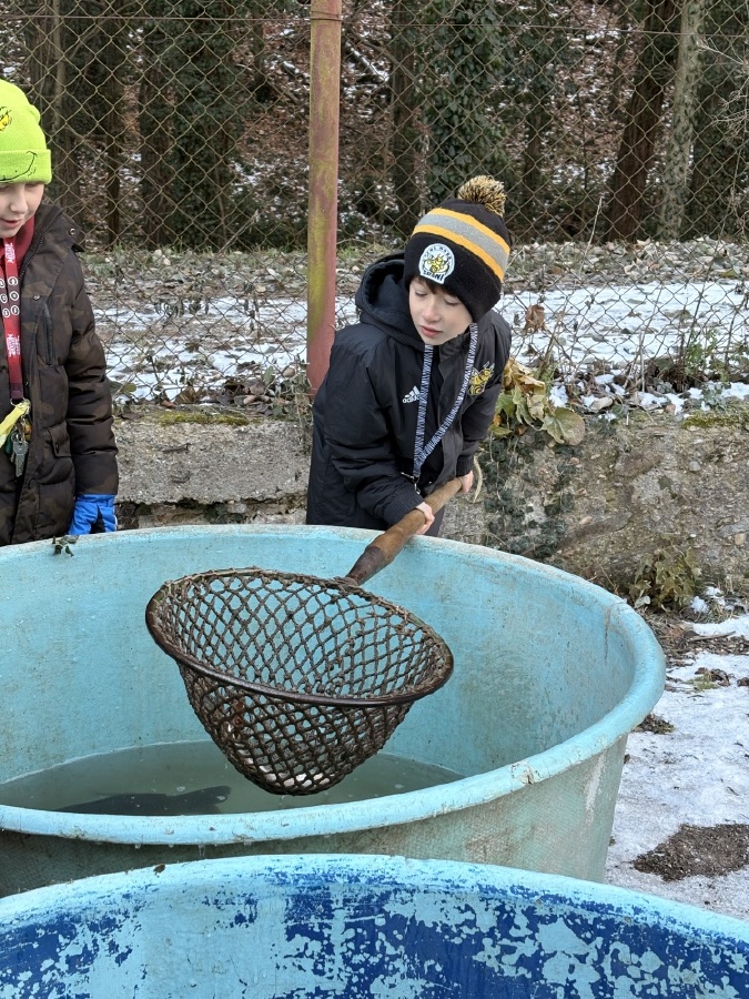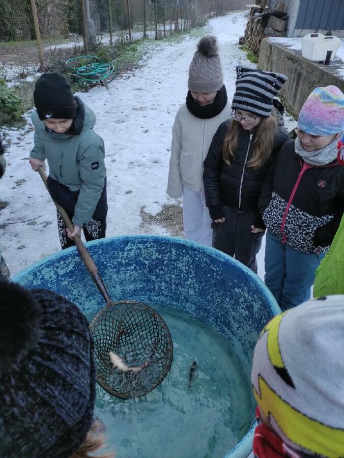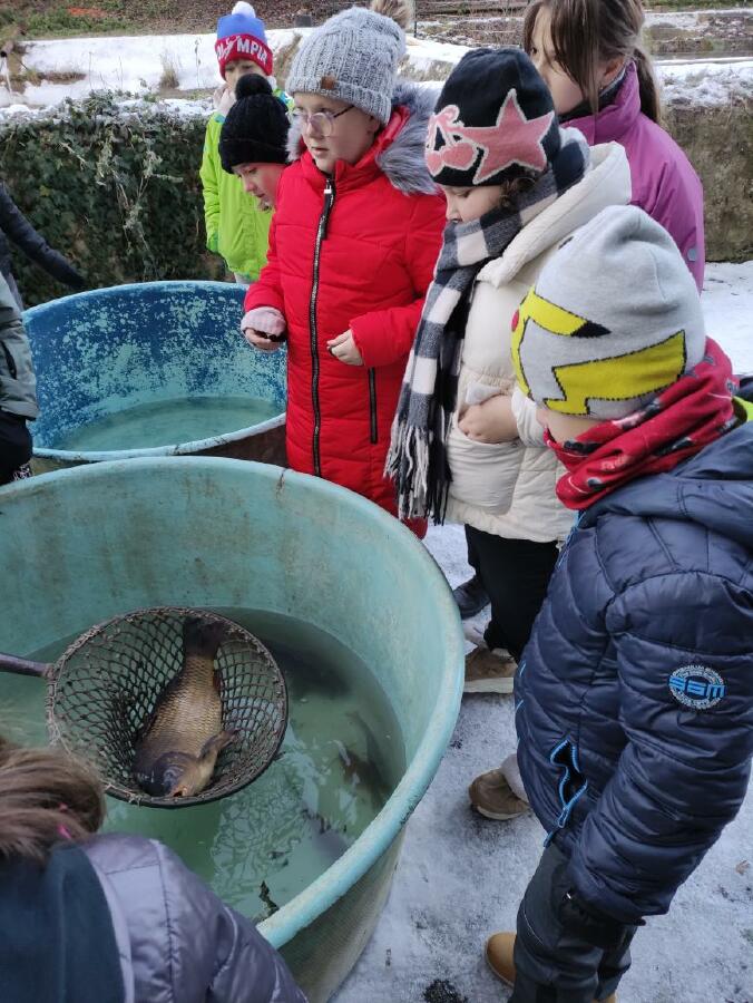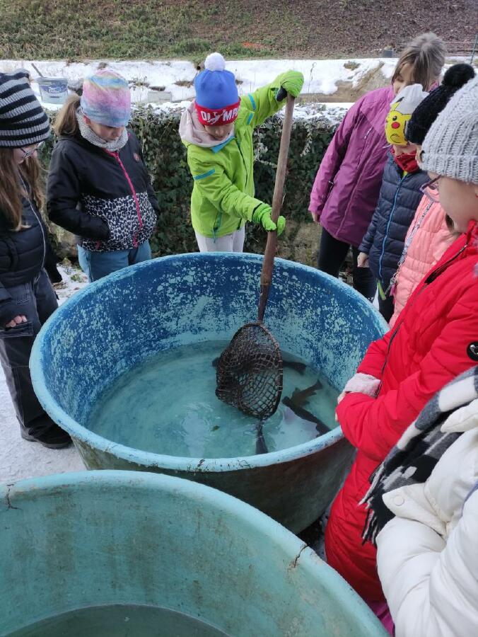 Čtvrťáci se nezalekli mrazivého počasí a s nadšením vyrazili na průzkum života rybníku v rodinném rybářství Haering.