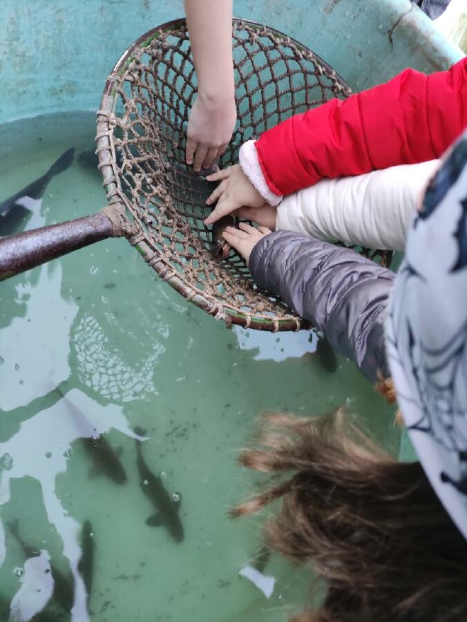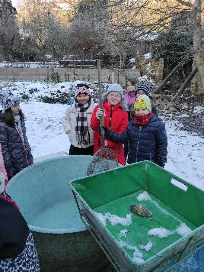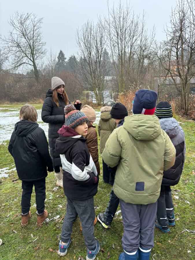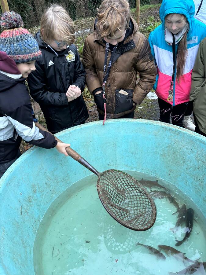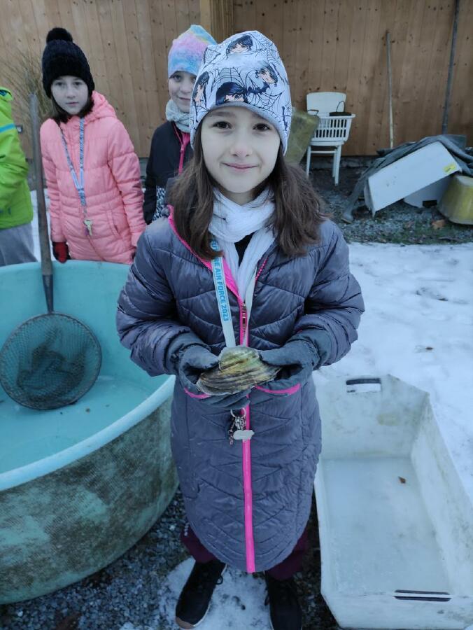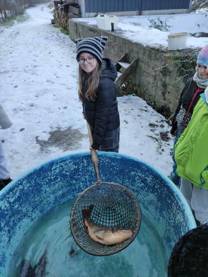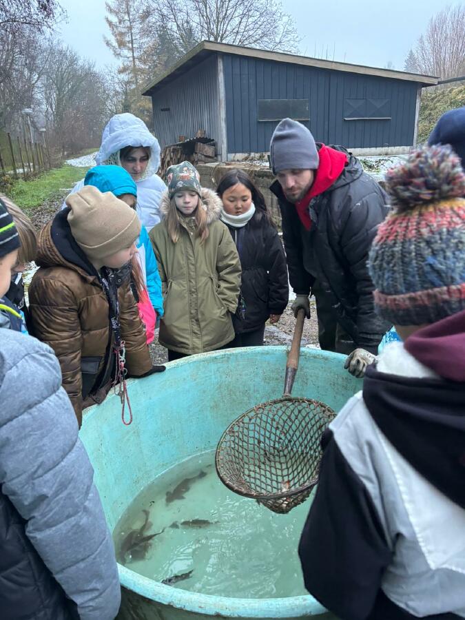 Čtvrťáci se nezalekli mrazivého počasí a s nadšením vyrazili na průzkum života rybníku v rodinném rybářství Haering.