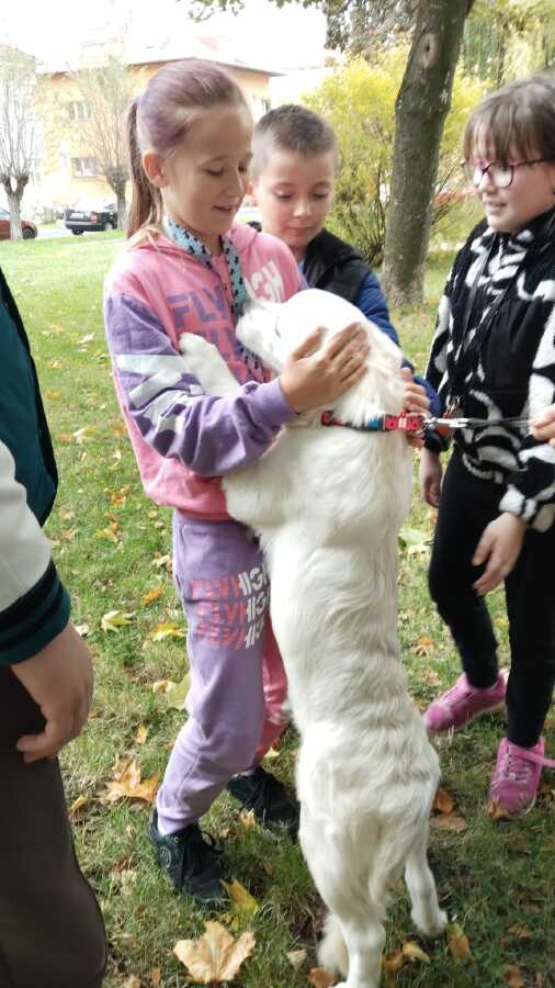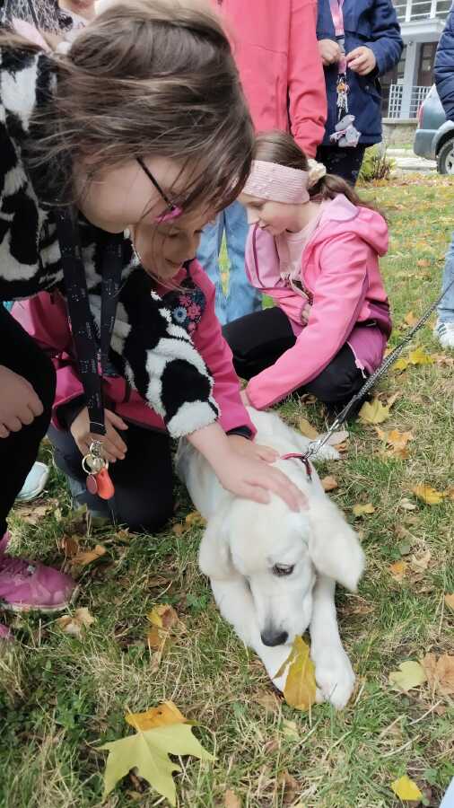 Na závěr projektového dne jsme některé mazlíčky vyvenčili a v parku pomazlili Emičky štěňátko zlatého retrívra Auru.