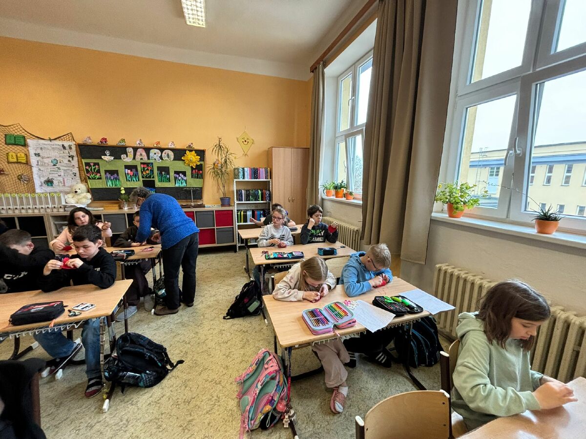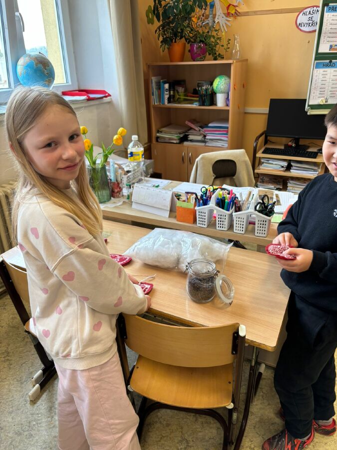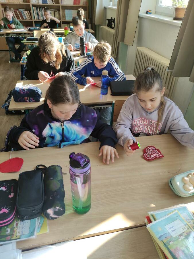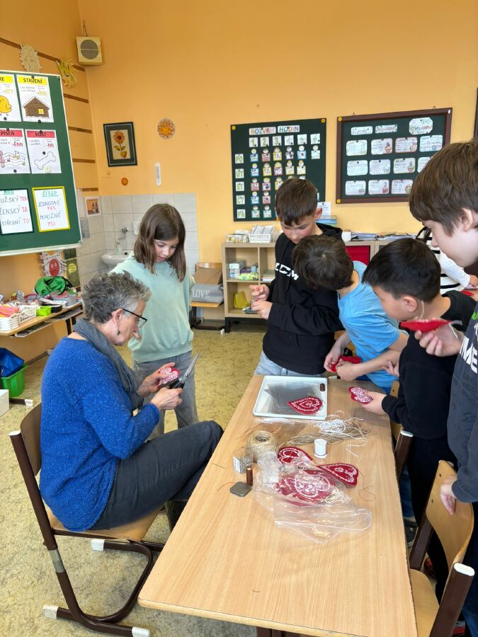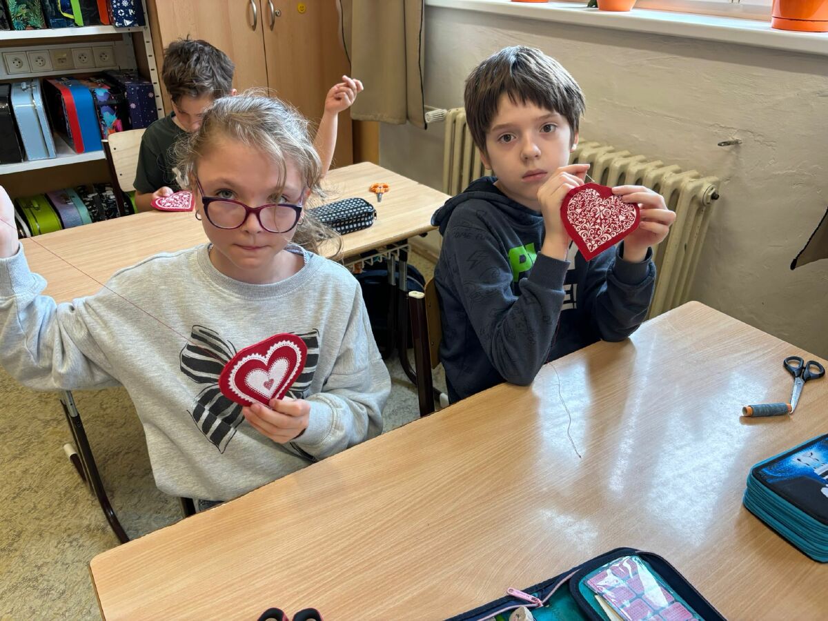 Žáci 4. ročníku se postupně zúčastnili řemeslné dílny spolku Pod horami, kde si připravili dárek ke Dni matek. Z polotovarů si vytvářeli folklórní srdíčka z bavlny a plsti. Vyzkoušeli si základní šicí techniku - přední steh, srdíčka vycpali vatelínem a provoněli sušenou levandulí. Na závěr povedené výrobky doplnili mašličkou, poutkem na zavěšení a svá srdíčka pečlivě dárkově zabalili. Setkání s velmi šikovnou paní lektorkou přineslo dětem radost z tvoření i novou zkušenost s rukodělnou činností.