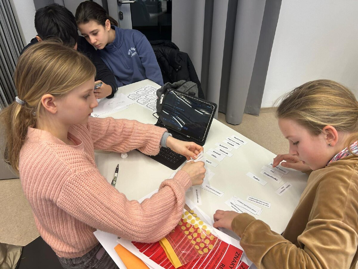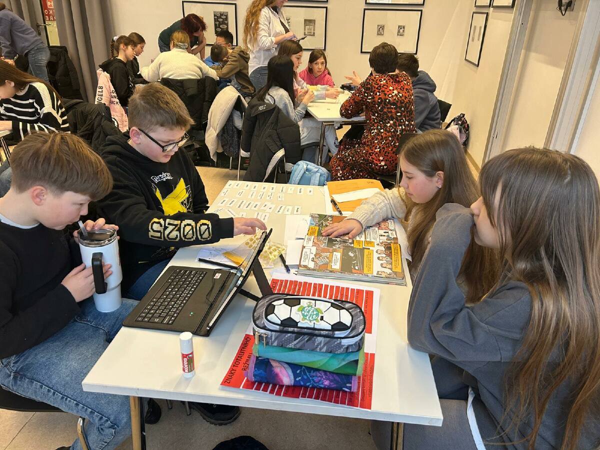 Následovala skupinová práce s knihami, tvorba plakátů a plnění dalších úkolů – třídění znaků totality a demokracie, kvízy, doplňovačky, pracovní listy či vysvětlování pojmů z dané doby (např. estébák, disident, Pedro, remoska). Součástí dne byly prezentace, společná reflexe i prostor pro vlastní názory a myšlenky.