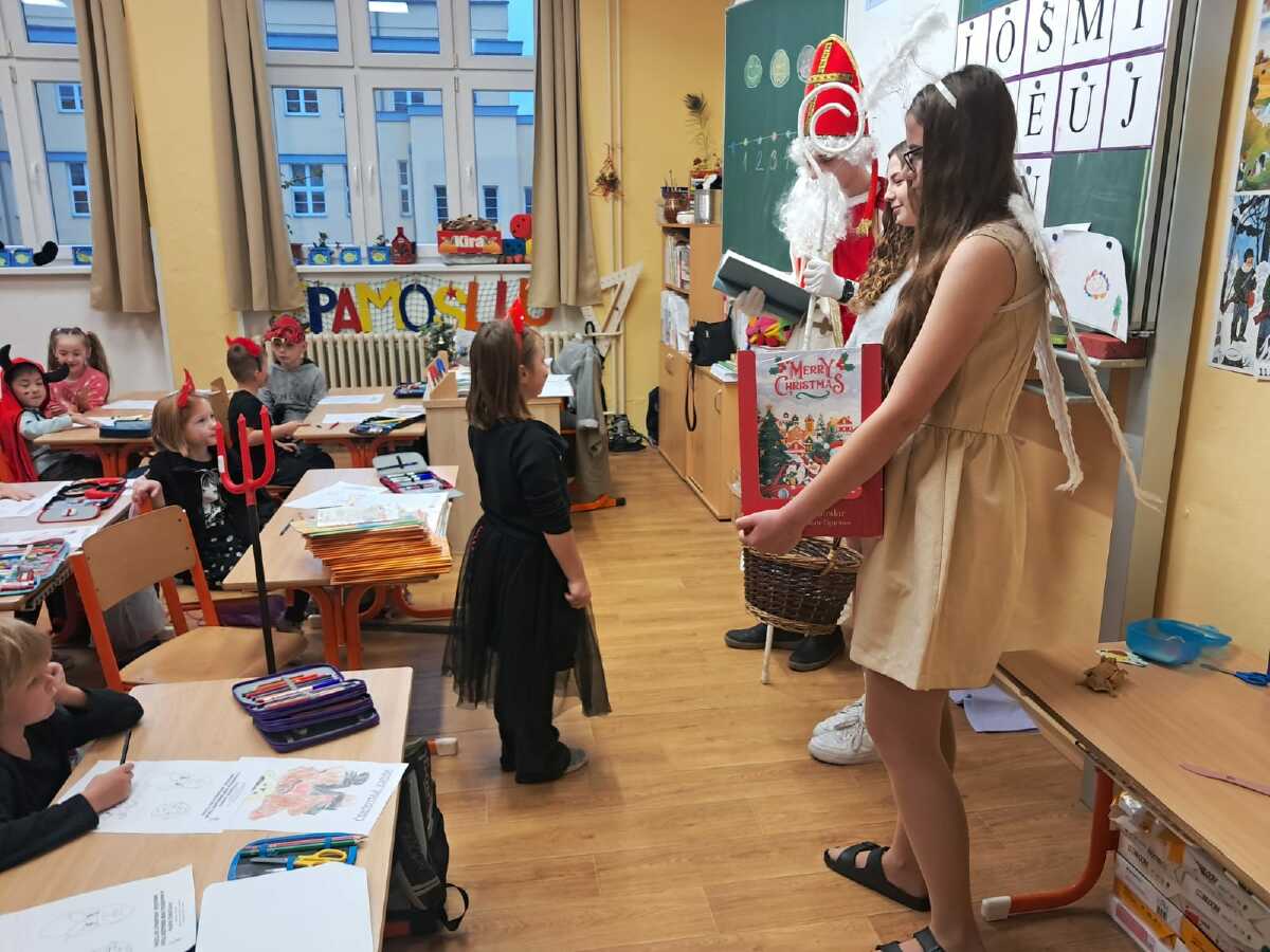 V pátek dopoledne se naše třída proměnila v malou čertovskou učebnu. Pro malé čertíky bylo připraveno čertovské vyučování, ve kterém si zopakovali slabiky, psaní slov a jednoduché počítání. Práci doplňovaly další zábavné úkoly, např. skládání puzzle, řešení bludiště či hledání rozdílů mezi obrázky. Ze všech těchto úkolů si pak každý žák vytvořil svoji "Čertovskou knihu". Prožitek z celého dopoledne ještě umocnila návštěva skutečného Mikuláše, čertů a andělů. Na ně byly děti připravené, přednesly spoustu básniček i společnou píseň.