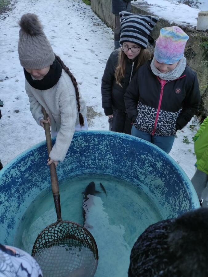 Čtvrťáci se nezalekli mrazivého počasí a s nadšením vyrazili na průzkum života rybníku v rodinném rybářství Haering.