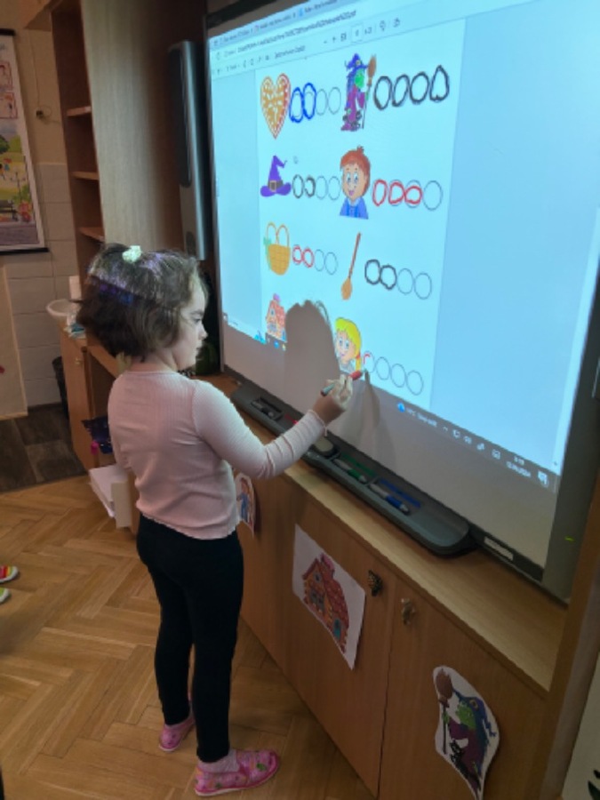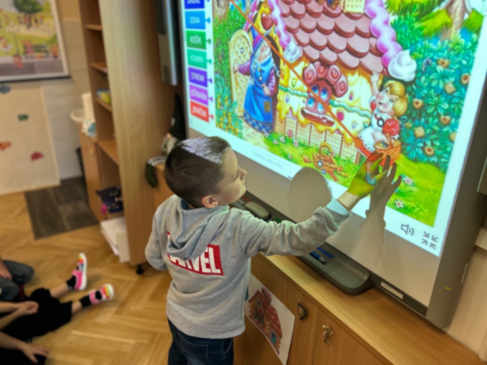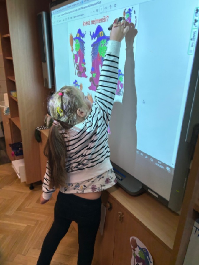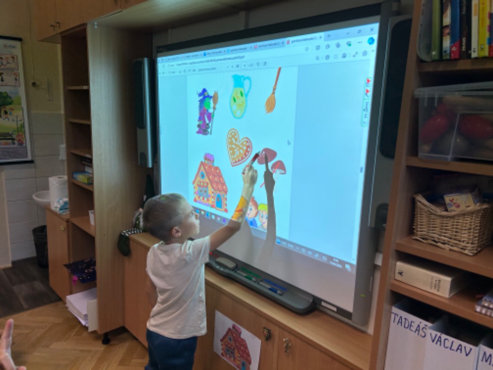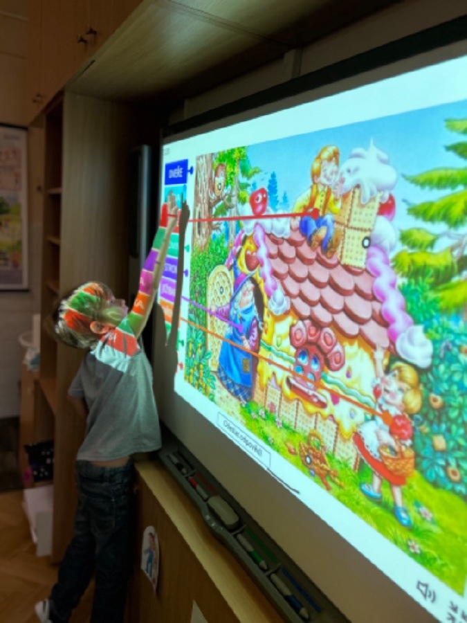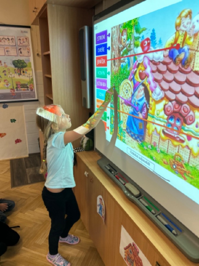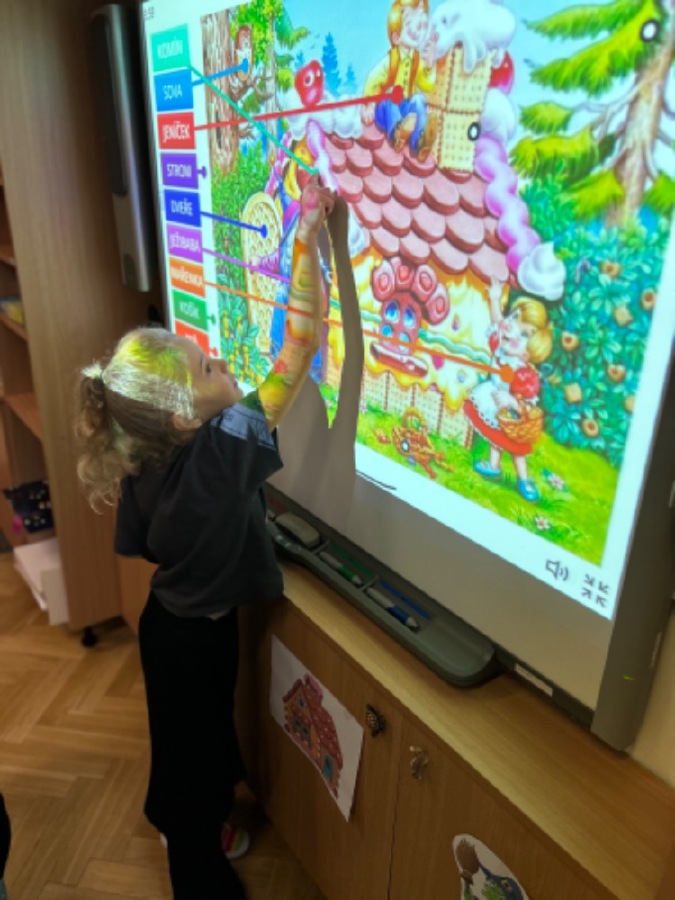 Dnes jsme si připomněli pohádku Perníková chaloupka. Společně jsme si ji převyprávěli za pomoci obrázkové osnovy. Pak už na nás čekaly jednotlivé úkoly. Děti pomáhaly najít cestu Jeníčkovi a Mařence od ježibaby zpět domů, určovaly velikost záporné pohádkové postavy, zároveň si procvičily orientaci, počítaly jednotlivé perníčky, vytleskávaly slova a označovaly počet jejich slabik, doplňovaly neúplné obrázky, vyznačovaly motivy patřící k dnešnímu tématu, to vše u interaktivní tabule. V lavici pak v pracovním listě děti bystřily svůj postřeh a zrakové vnímání, také si procvičovaly grafomotoriku. Také jsme se naučili hru Já mám, kdo má?. Ta se nám moc líbila a pro úspěch jsme ji hráli 2x. V závěru jsme si ještě v aplikaci Wordwall upevnili základní pojmy z pohádky.