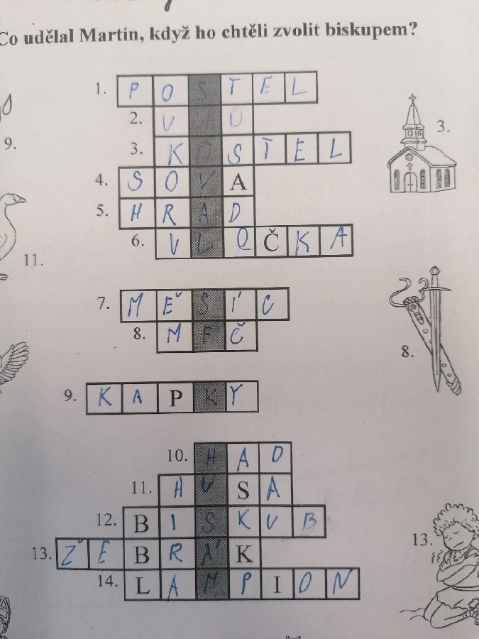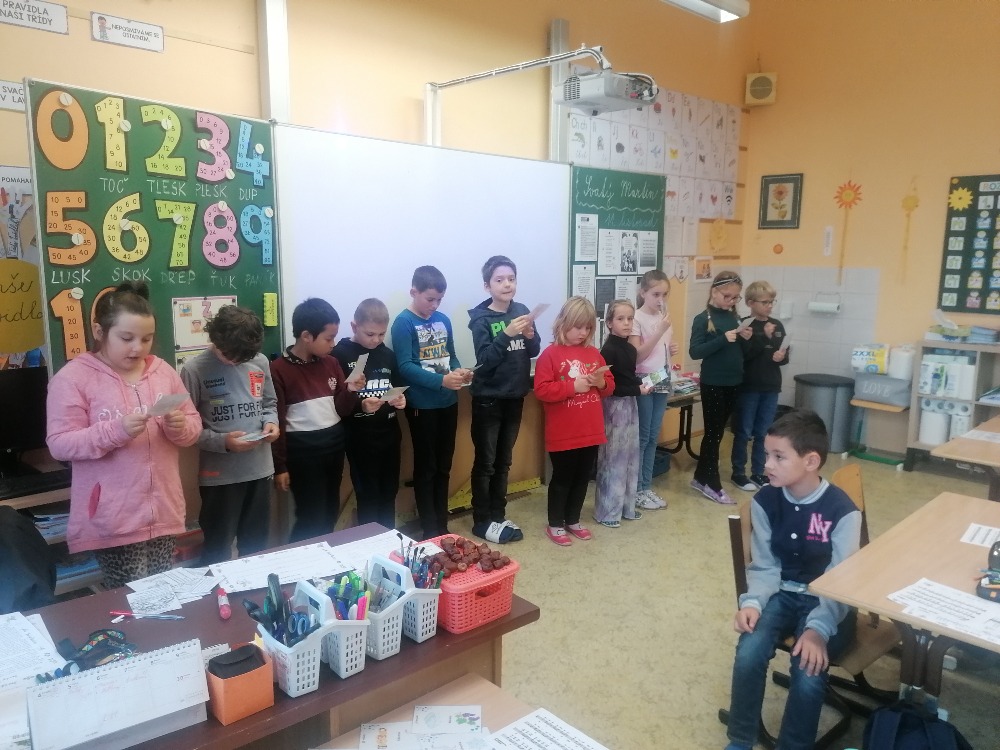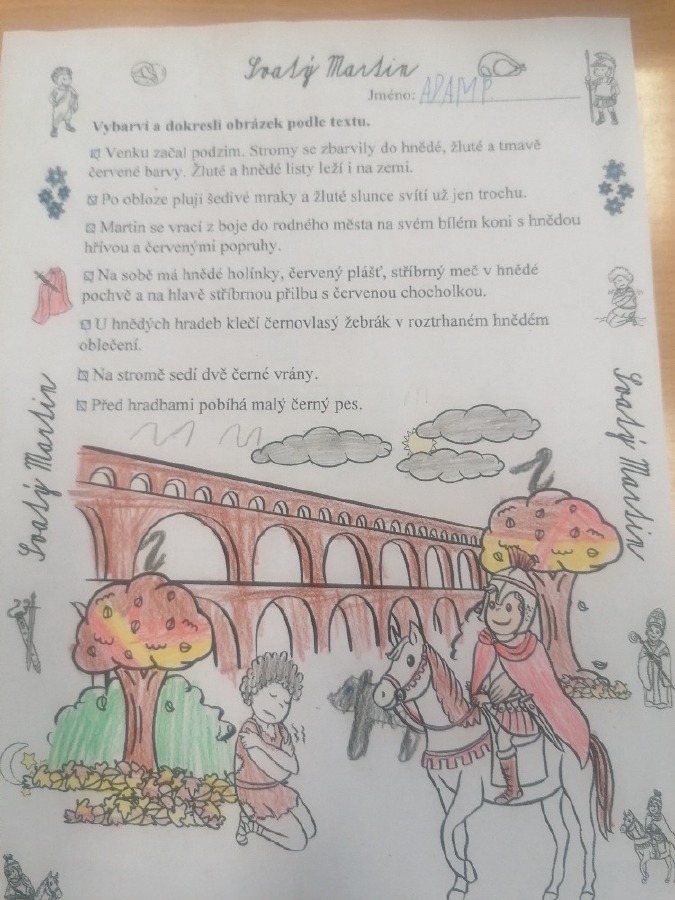 V pondělí 11. listopadu si žáci 3. C užili projektový den se sv. Martinem. Celé dopoledne poznávali zábavnou formou jeho příběh. Úvodem si přečetli text, sestavili ve skupinách komiksový příběh, přiřazovali obrázky k textu, vyluštili křížovku, dokreslovali obrázek podle zadání, doplnili pětilístek. Nechyběla recitace, zpívání a hra Já mám, kdo má. Závěrem žáci vytvořili erby se svatomartinskými symboly. Podzimní čas nám tak přinesl nejen padající listí a první mrazíky, ale i příběh o muži, který se proslavil svou dobrotou.