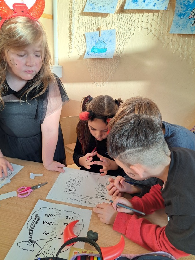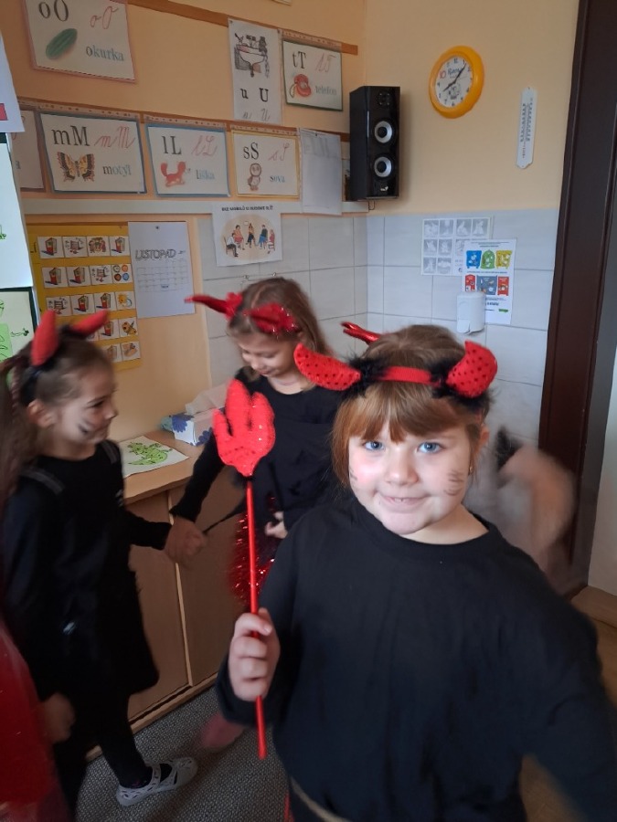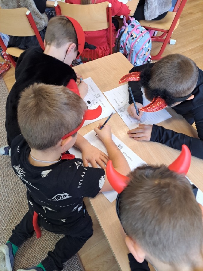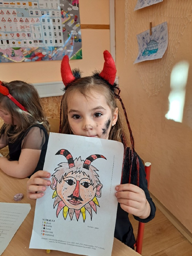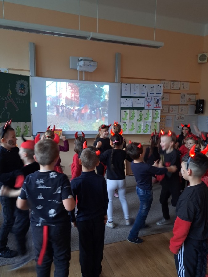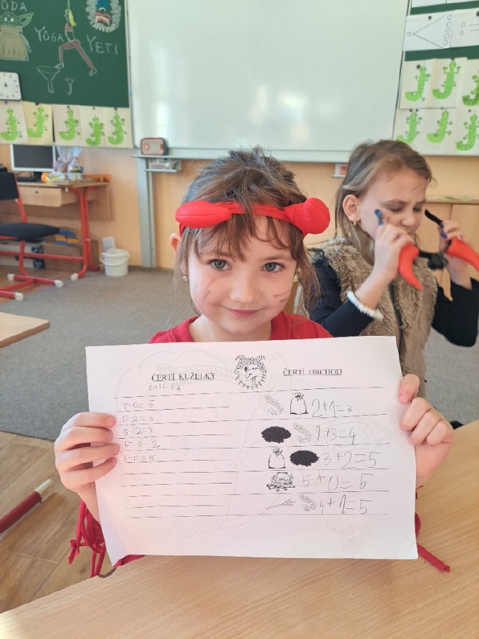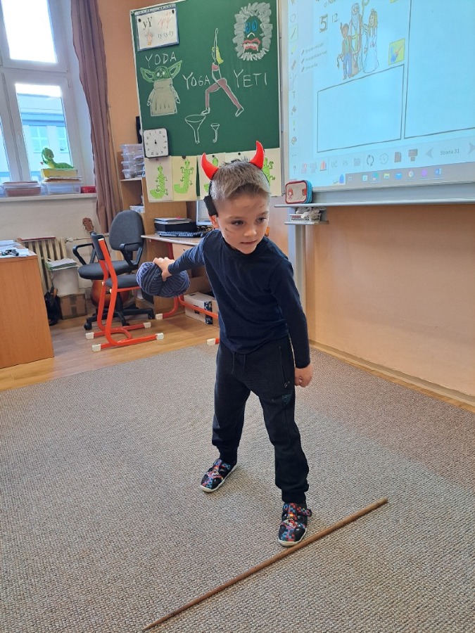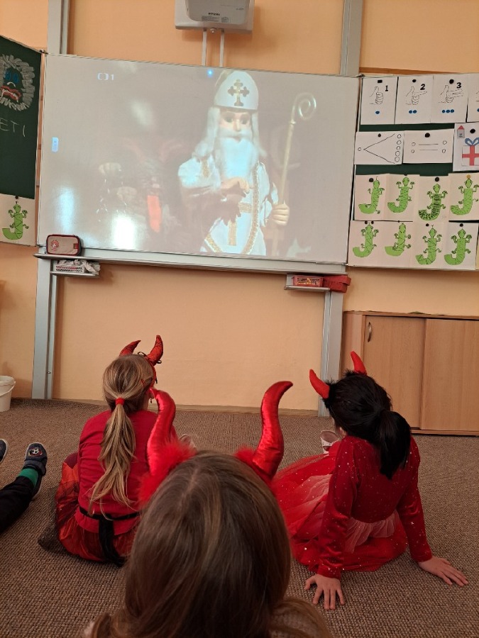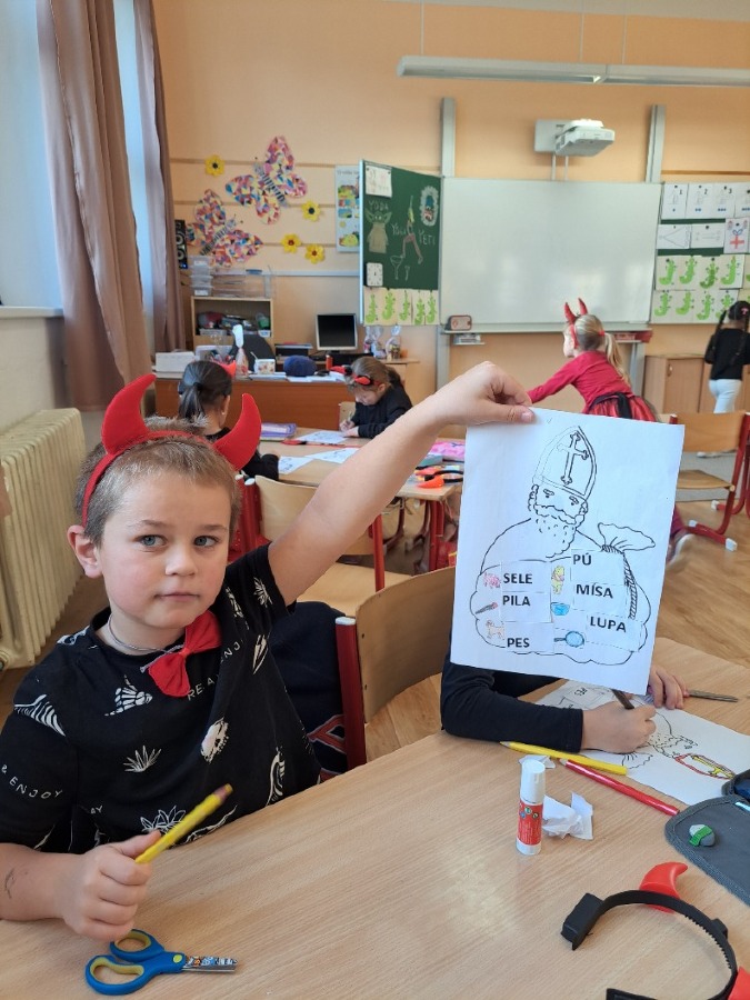 Ve čtvrtek 5.12. nejdříve navštívil naši třídu svatý Mikuláš se svou družinou a všem hodným prvňáčkům rozdal bohatou nadílku. Potom se všichni žáci proměnili v malé čertíky, které čertice Belzebína pozvala do čertovské školy. Čertíci plnili různé čertovské úkoly, hráli čertí hry, zpívali, tančili, pracovali na interaktivní tabuli, sledovali Mikulášskou pohádku a nakreslili čertovský portrét. Celé dopoledne pracovali ve skupinkách, učili se spolupracovat a pomáhat si. Byl to po čertech zábavný den.