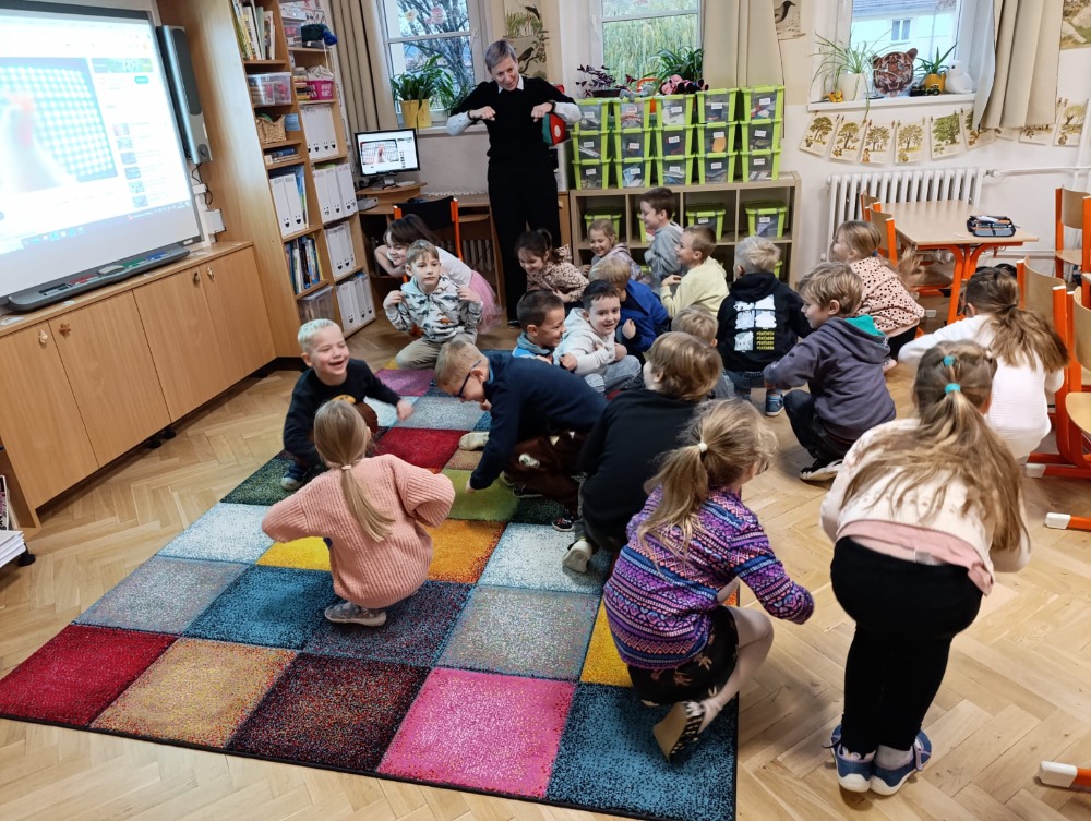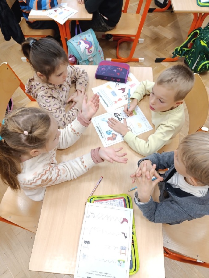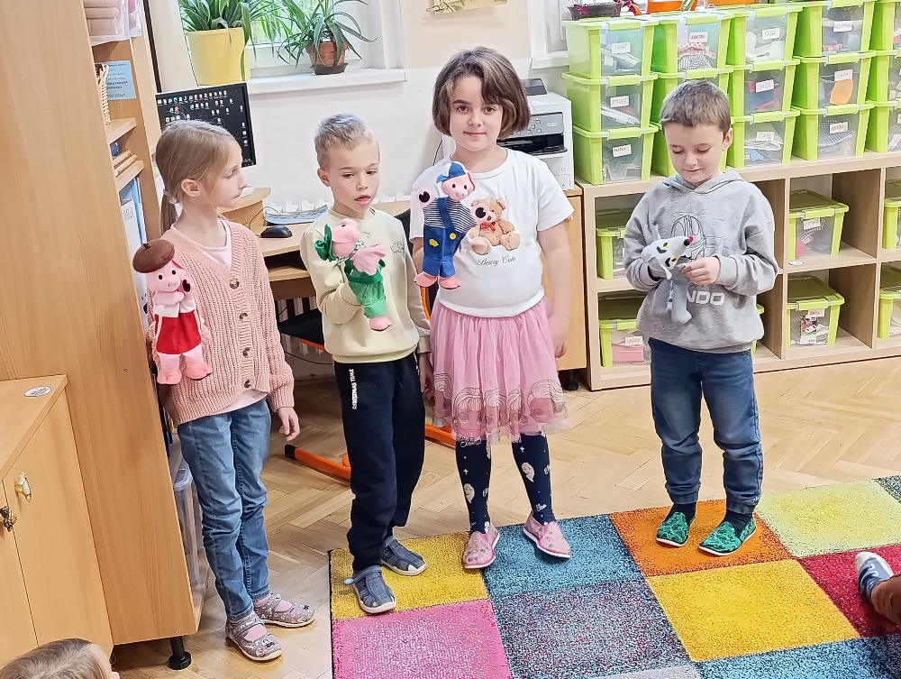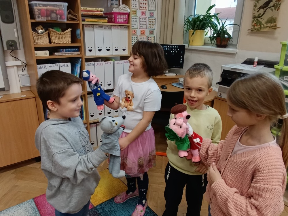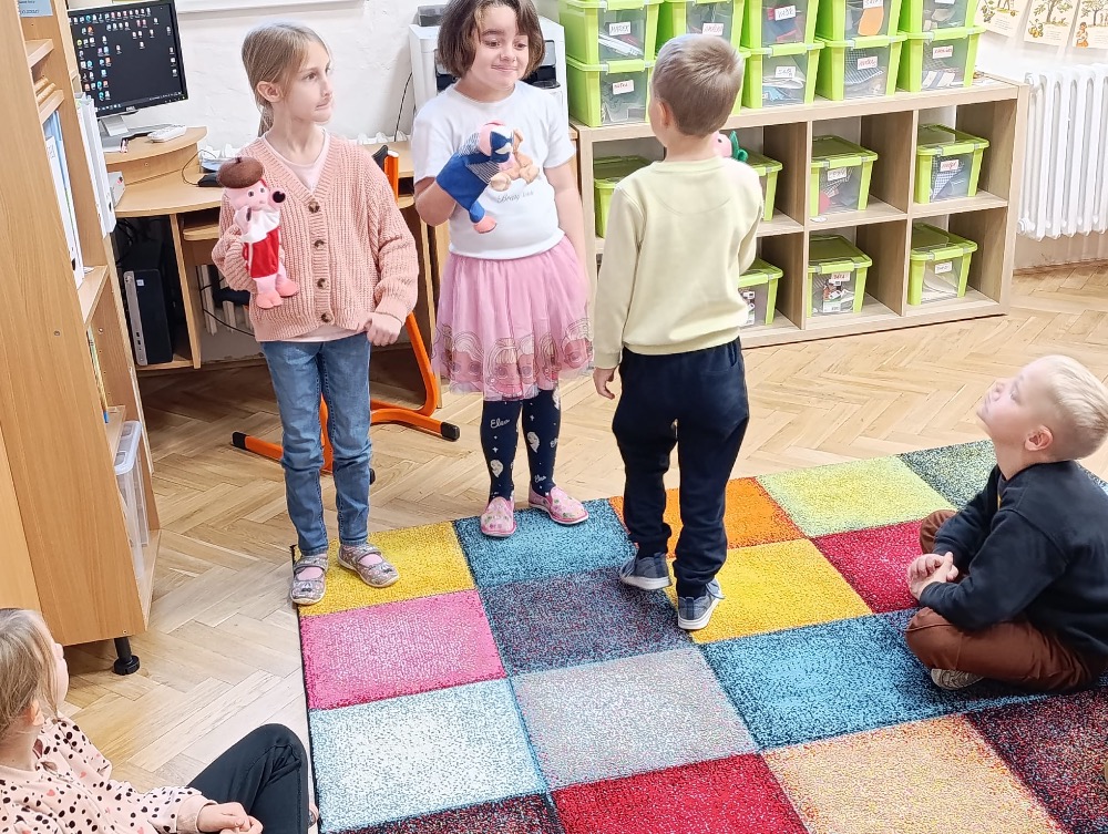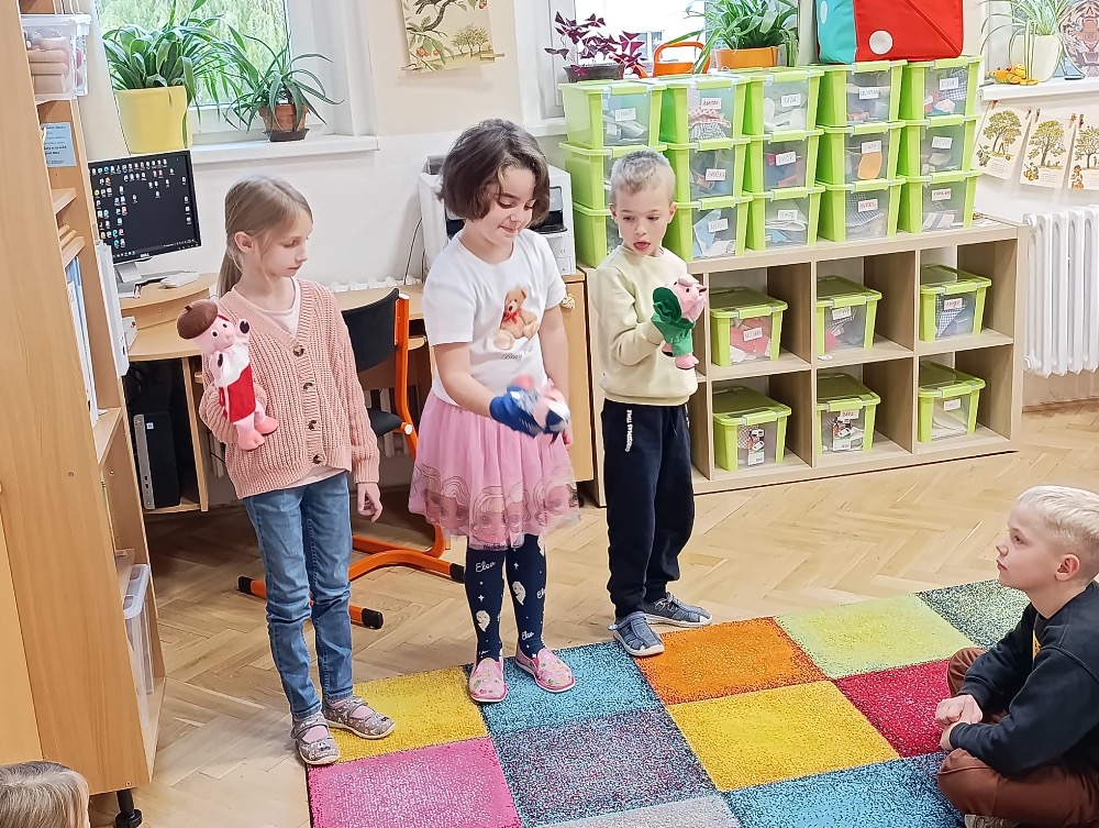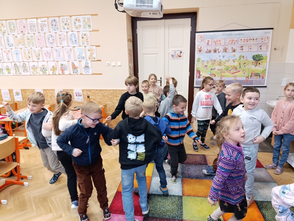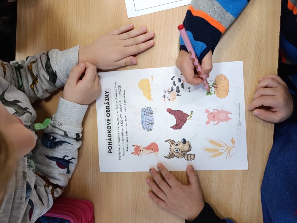 Ráno jsme odstartovali slepičí rozcvičkou. Děti se pak rozdělily do skupin. V nich společně řešily úkoly. Hledaly cestu z bludiště, vytleskávaly slova a určovaly počet slabik, určovaly, co do pohádky nepatří, hledaly rozdíly mezi obrázky, atd. V případě první pohádky nesměl chybět Ptačí tanec, který se velmi líbil. Druhý příběh si děti po jeho vyslechnutí ještě zahrály s pomocí maňásků. V závěru dnešního bloku jsme z pohádek vyvodili ponaučení, že si máme navzájem pomáhat, dělit se, neodbývat svoji práci a dbát rad rodičů.