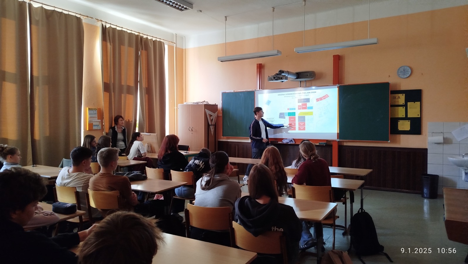Dne 9.1. absolvovala třída 9.A v rámci projektu Den pro školu dvouhodinový program s naším bývalým žákem Václavem Vágnerem. Ten nyní dobrovolně spolupracuje s Nadací České spořitelny a v roli odborníka z praxe se snaží svým příběhem inspirovat žáky a pomáhá jim odhalovat jejich silné stránky a nadchnout je pro určitý obor.