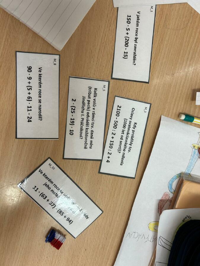 Pak přišla na řadu znalost matematiky. Pomocí násobilky a zašifrované zprávy jsme zjišťovali důležité letopočty a čísla. Ve skupinové práci jsme mohli využit kalkulačky.